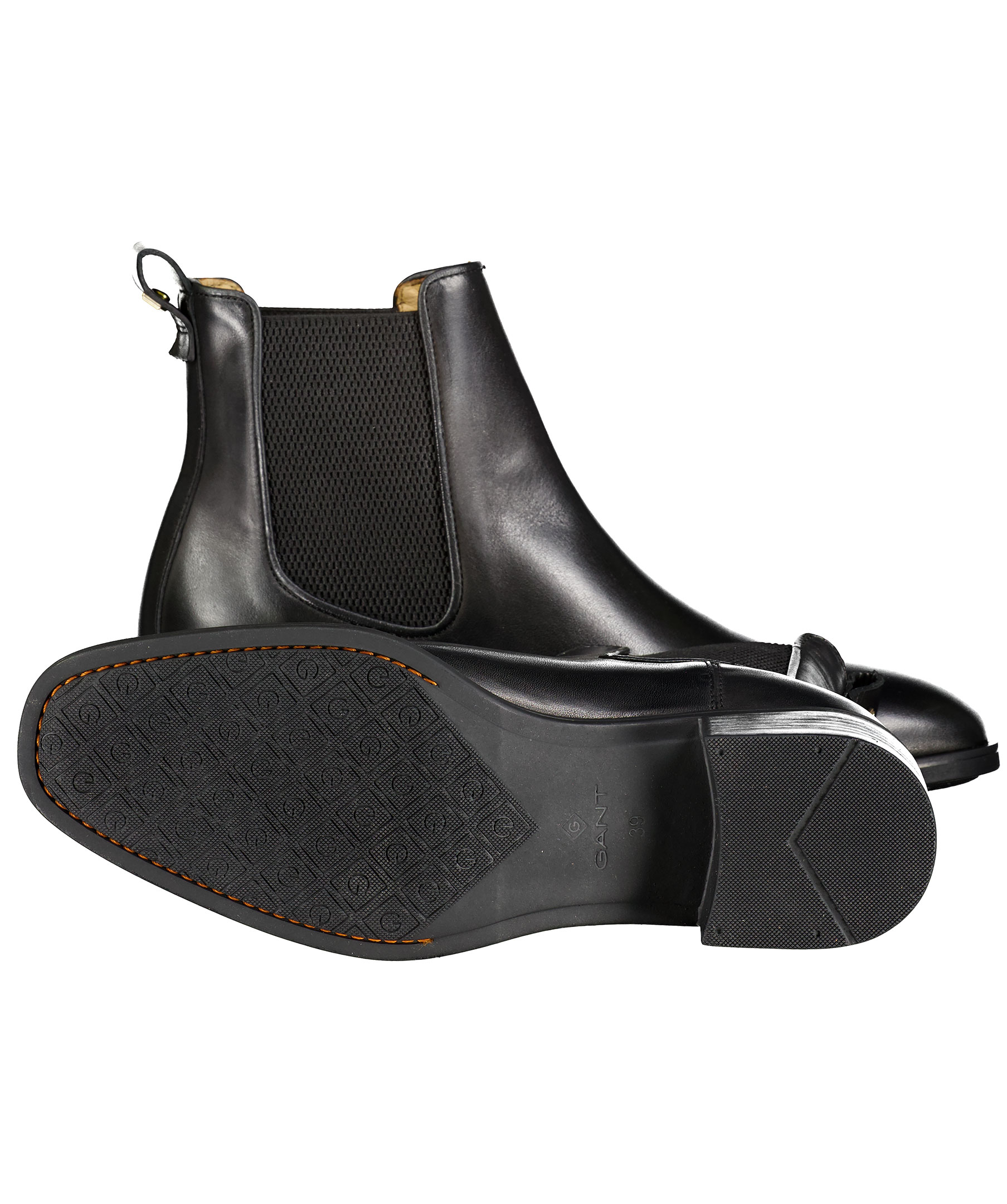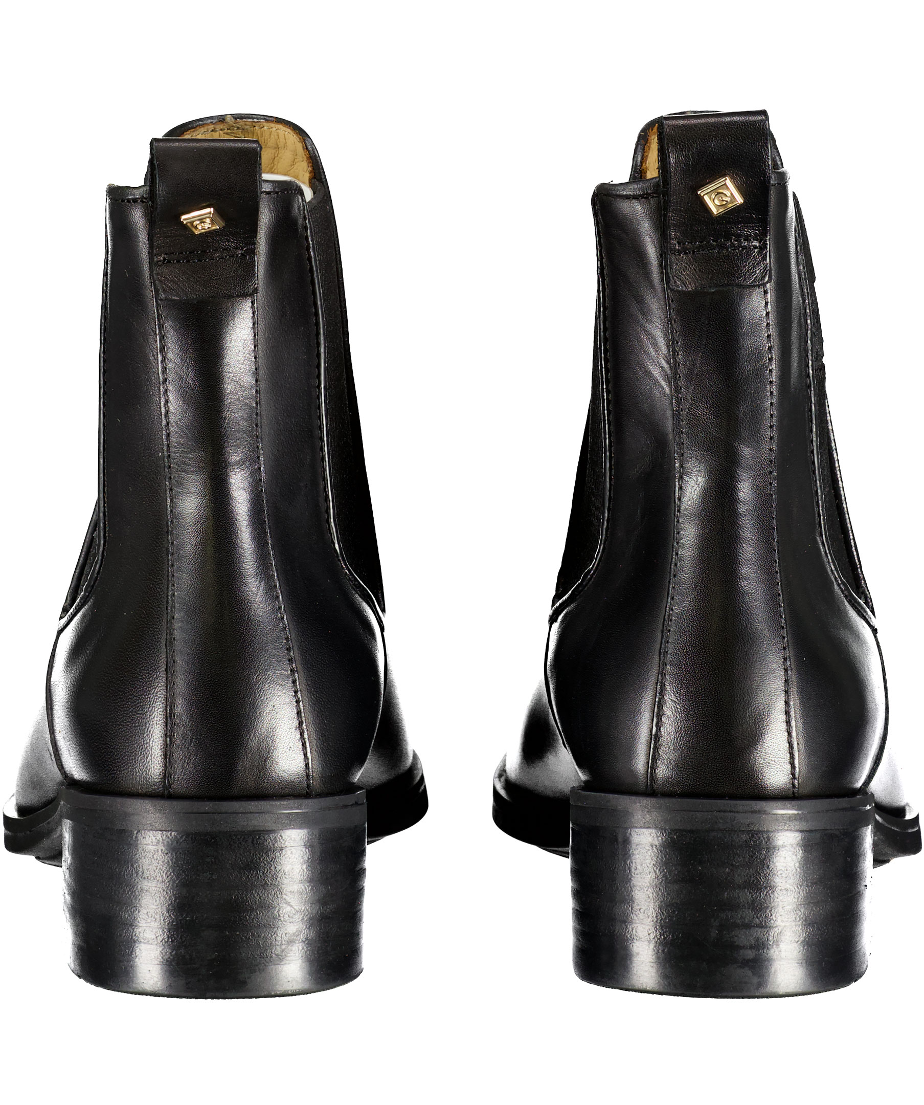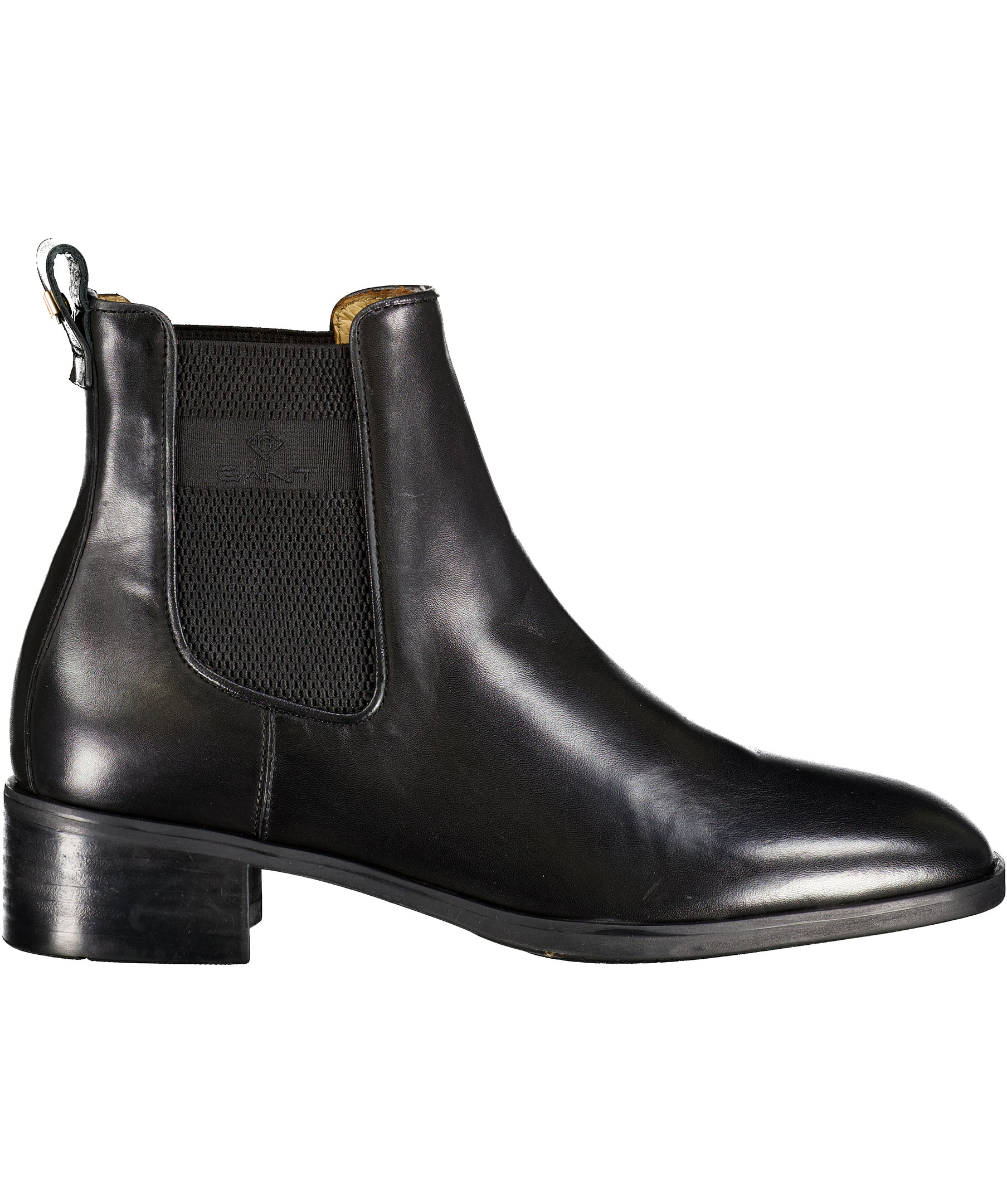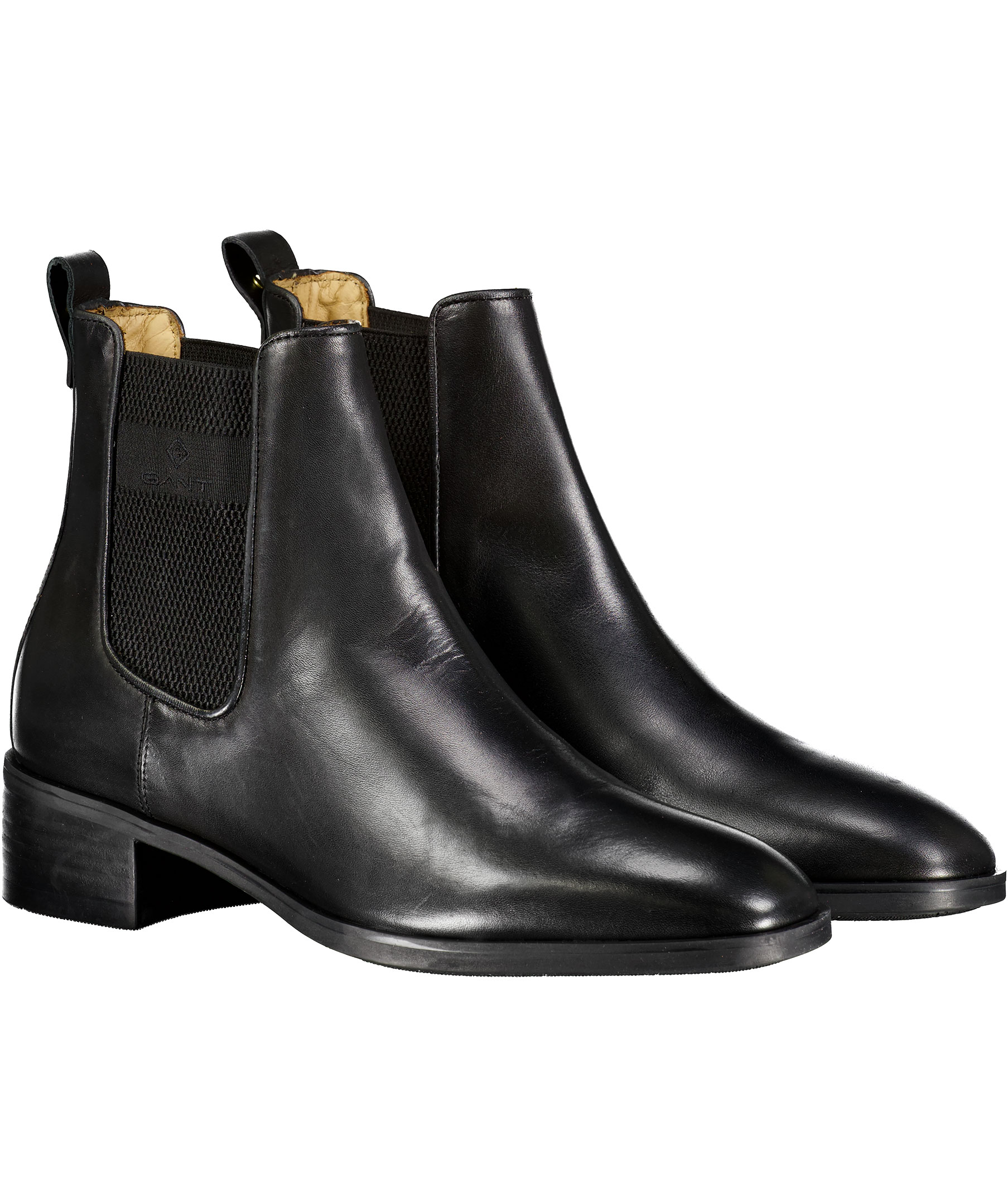 Svarta Chelsea Boots från Gant i glansigt läder. Resårband vid skons sidor med broderad logotyp. Låg klack och ögla i läder bak med liten fyrkantig nit med logotyp på.