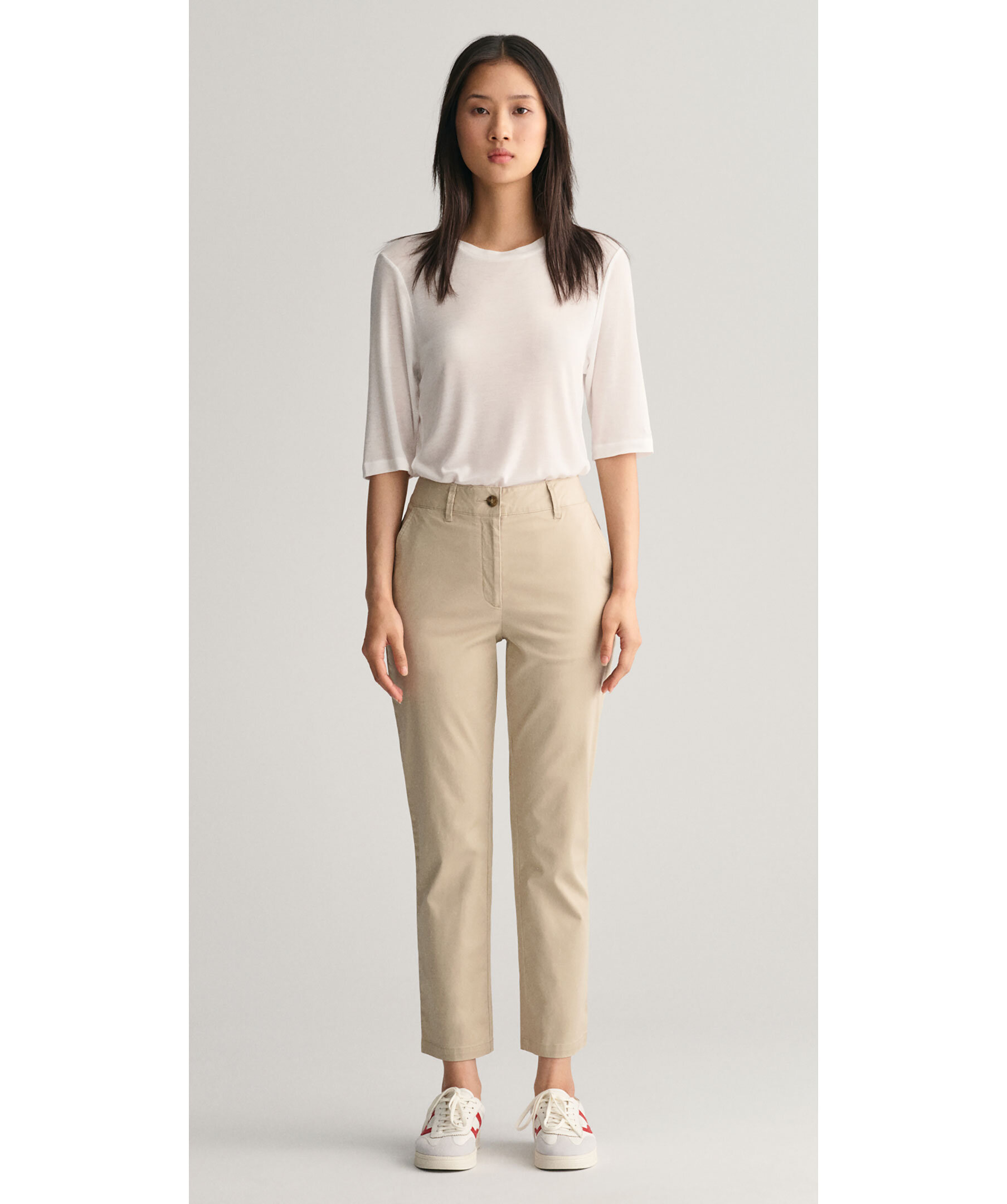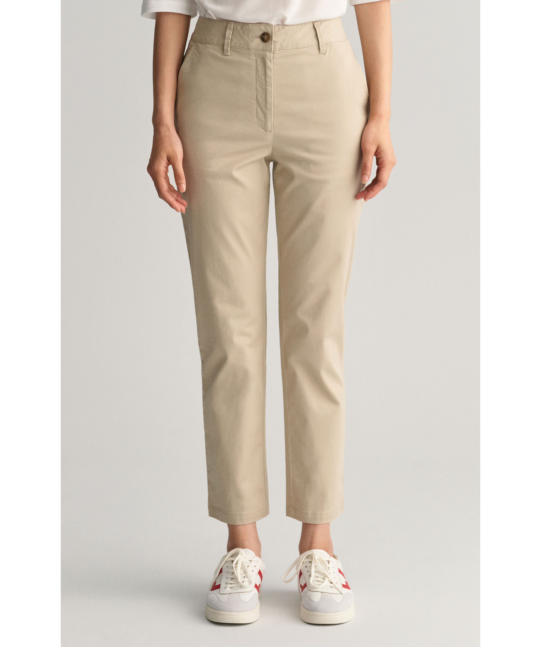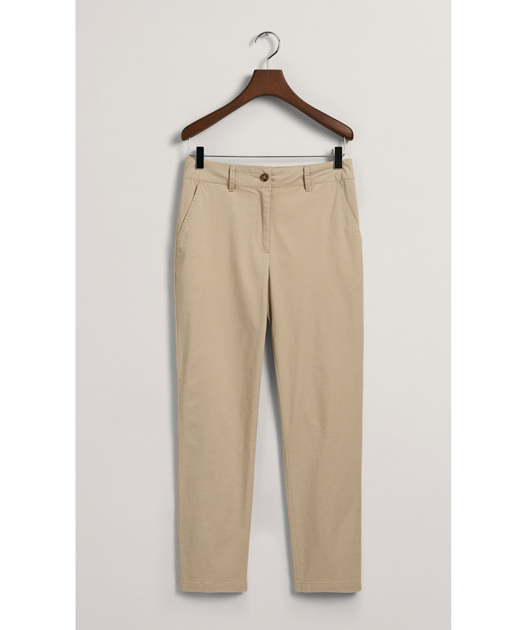 Beigea chinos från Gant. Snedställda fickor fram, dubbla bakfickor, stängs med dragkedja och knapp. Slim fit modell.