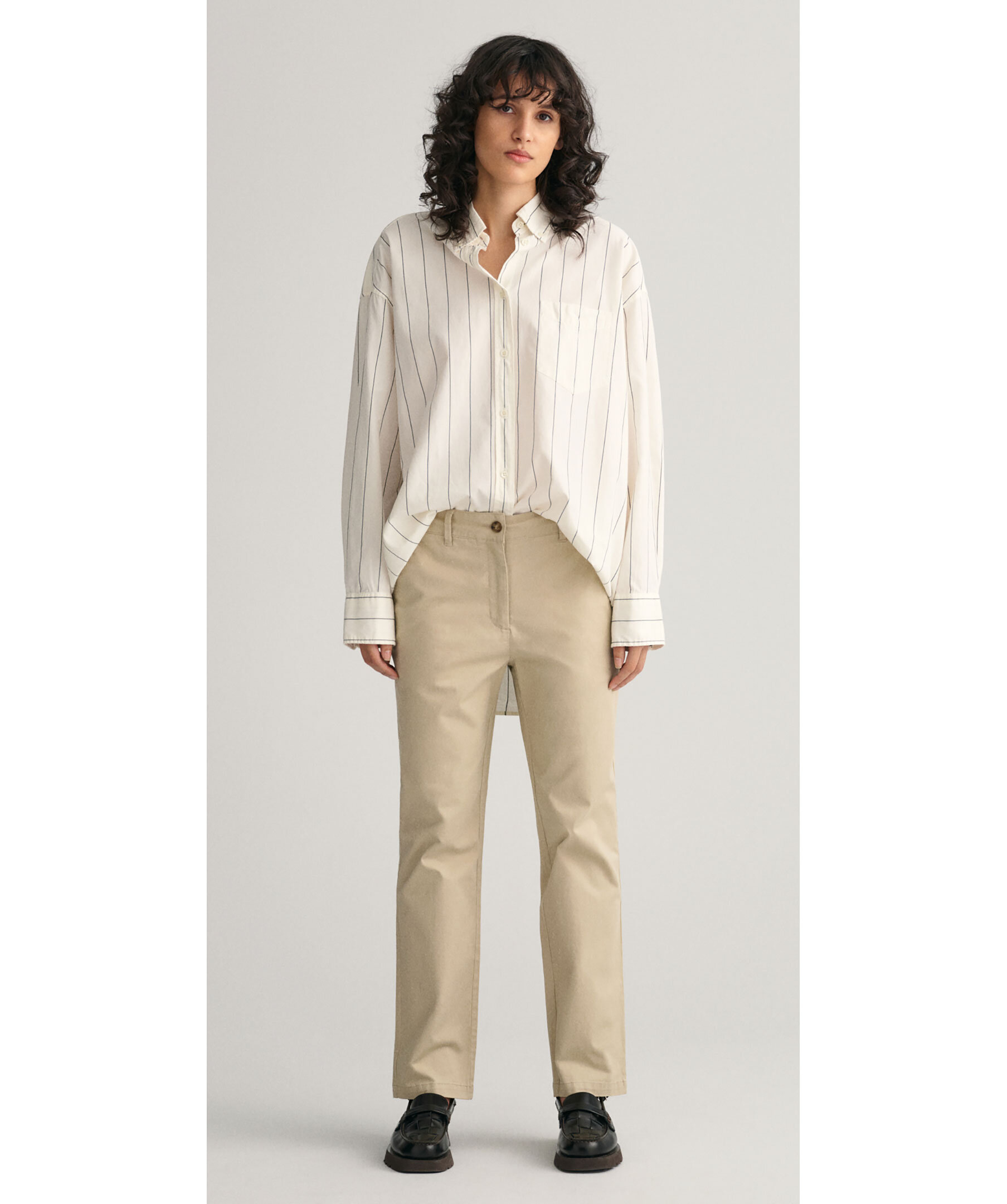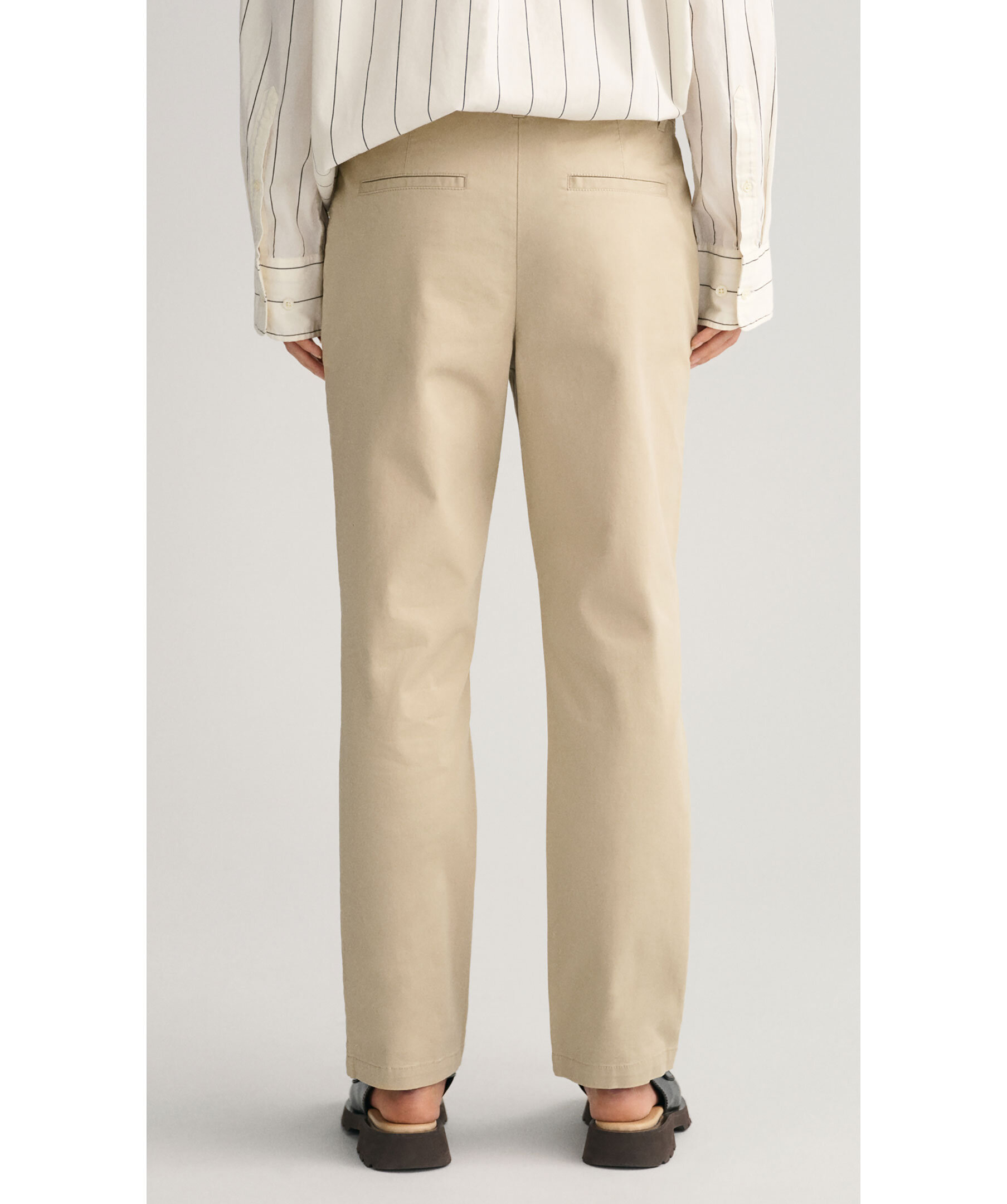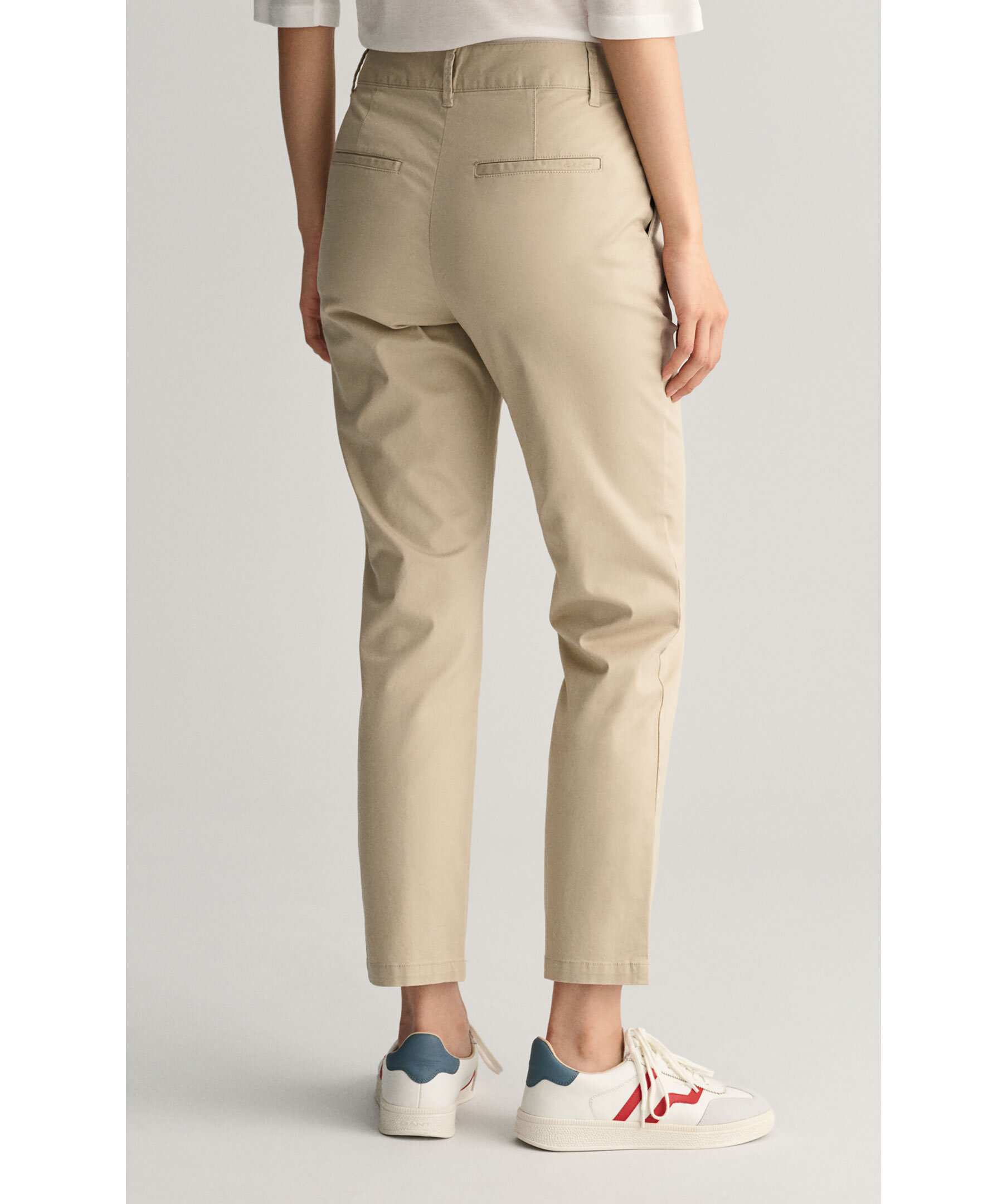 Beigea chinos från Gant. Snedställda fickor fram, dubbla bakfickor, stängs med dragkedja och knapp. Slim fit modell.