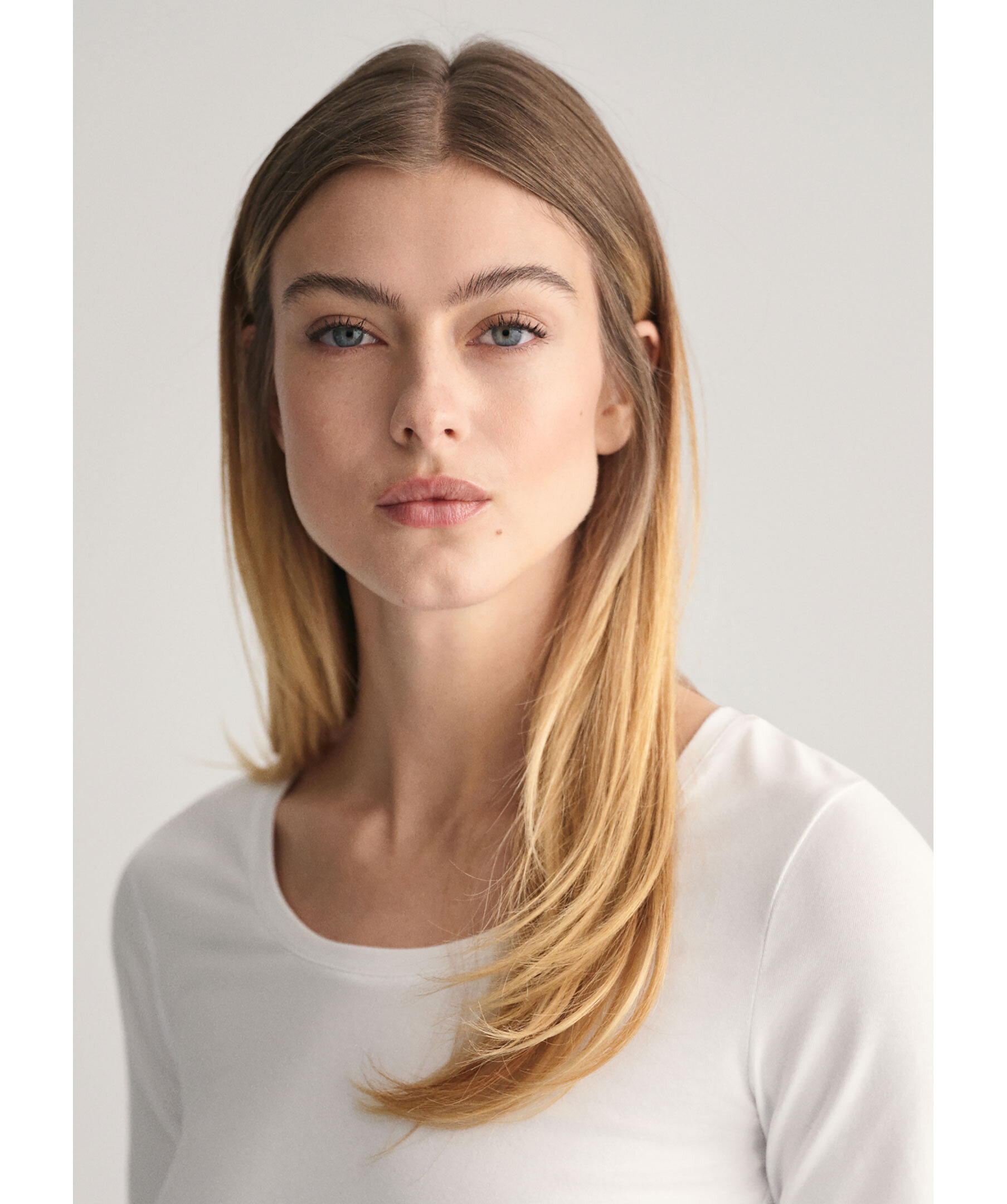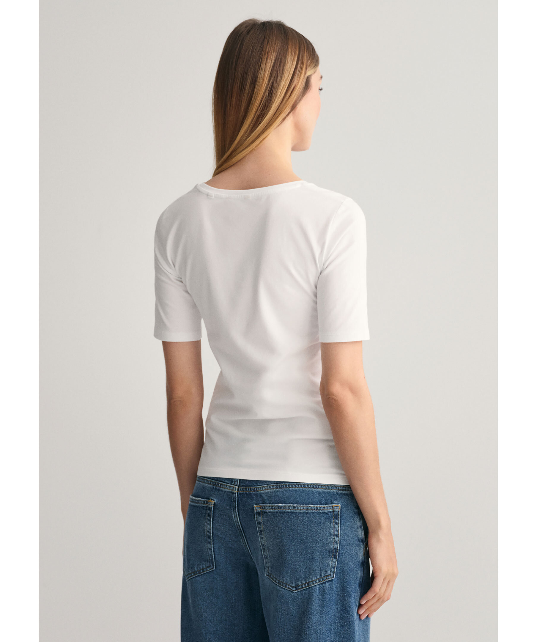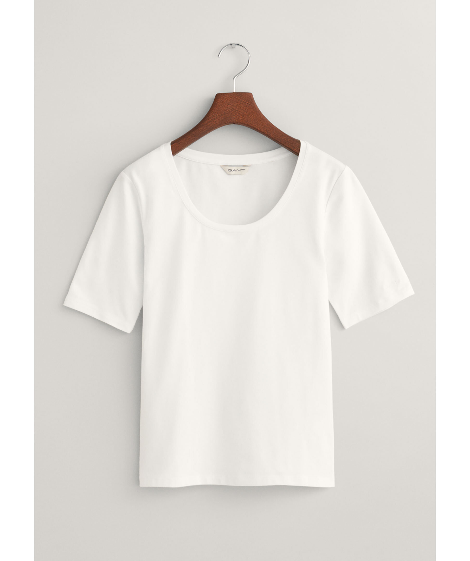 Vit topp med kort ärm från Gant. Toppen har en smickrande djup och rund halsringning samt en GANT-logotyp broderad ton i ton på ärmen. Tillverkad i en bomullsblandning.
