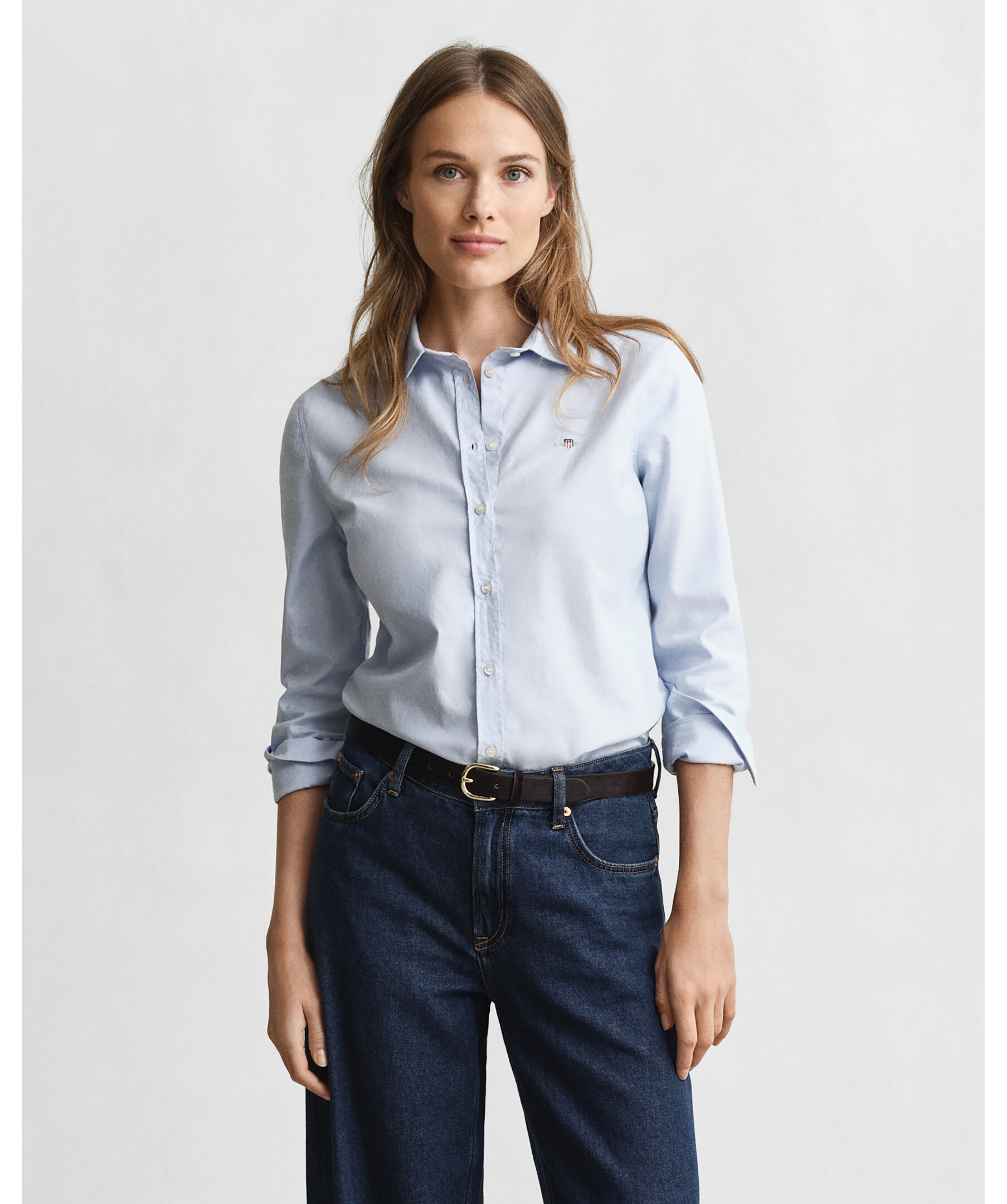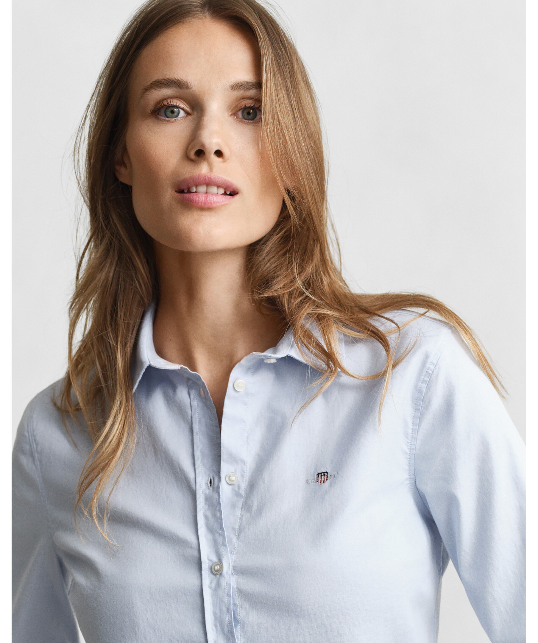 Ljusblå klassisk oxfordskjorta med smal passform från Gant. Framtagen i högkvalitativ bomull, exklusivt framtagen med extra stretch för GANT. Skjortan har point-krage, rundad fåll, deras klassiska locker loop i ryggen samt deras ikoniska sköldlogotyp broderad på bröstet.