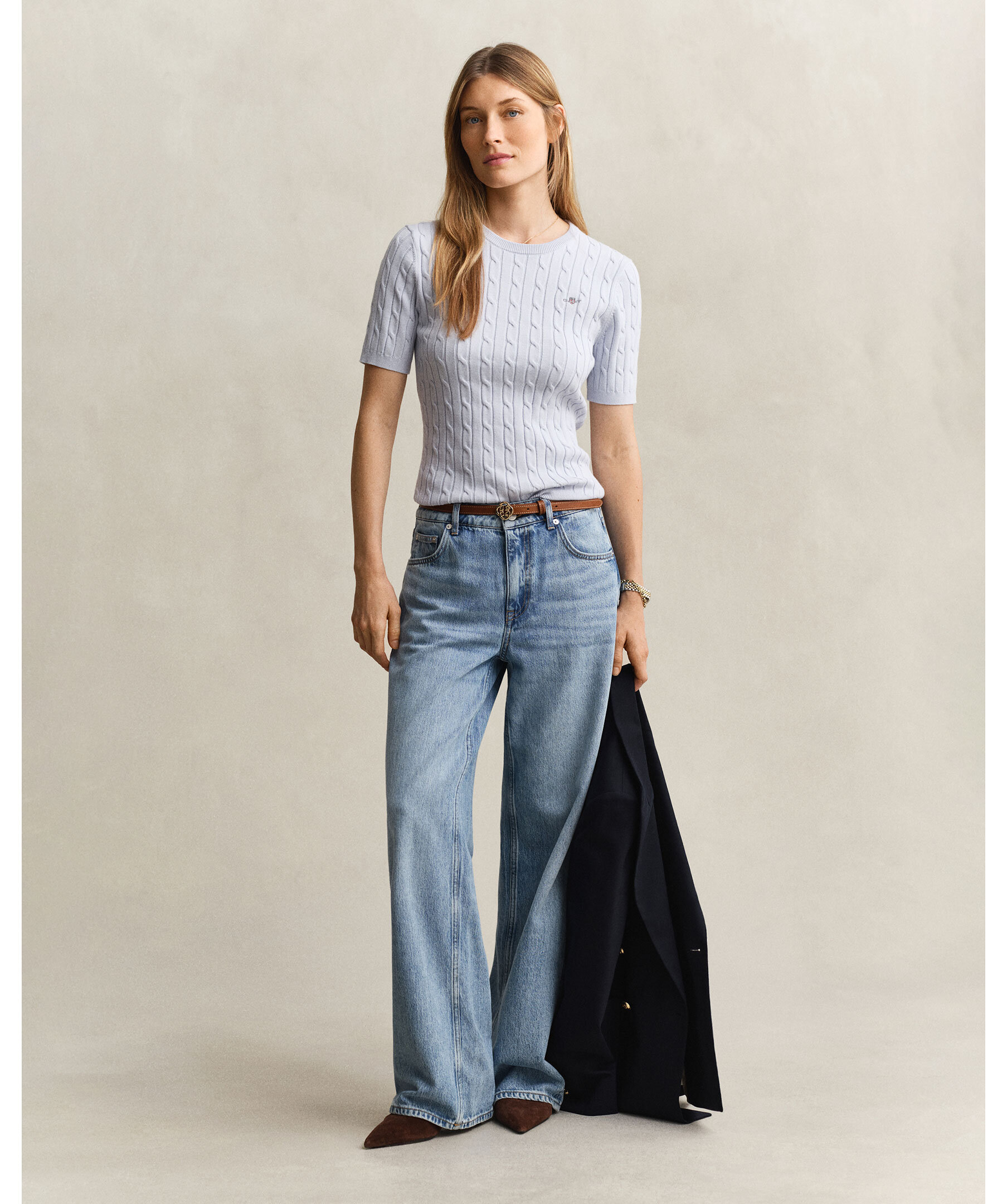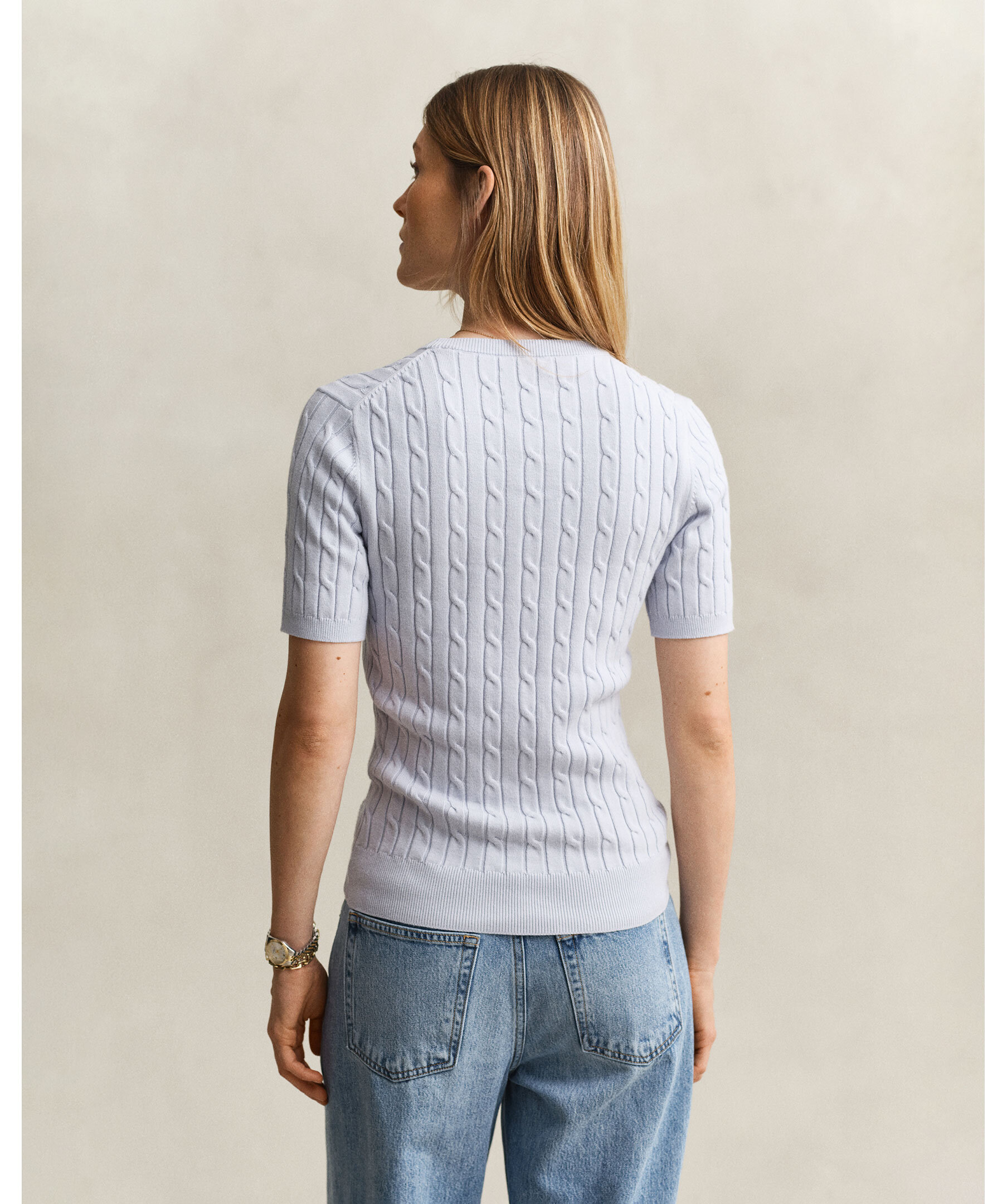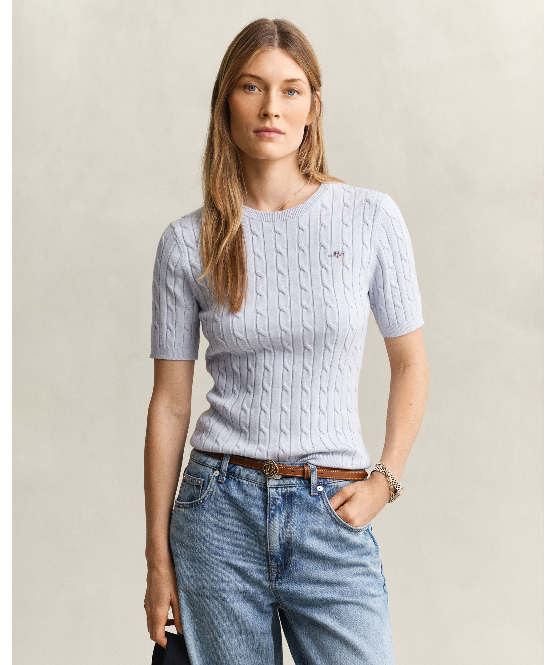 Kabelstickad tröja från Gant i mjuk bomullsblandning med stretch. Slim fit med kort ärm, ribbstickad krage, nederkant och ärmslut. Broderad Archive Shield-logotyp på bröstet ger en tidlös, preppy känsla.