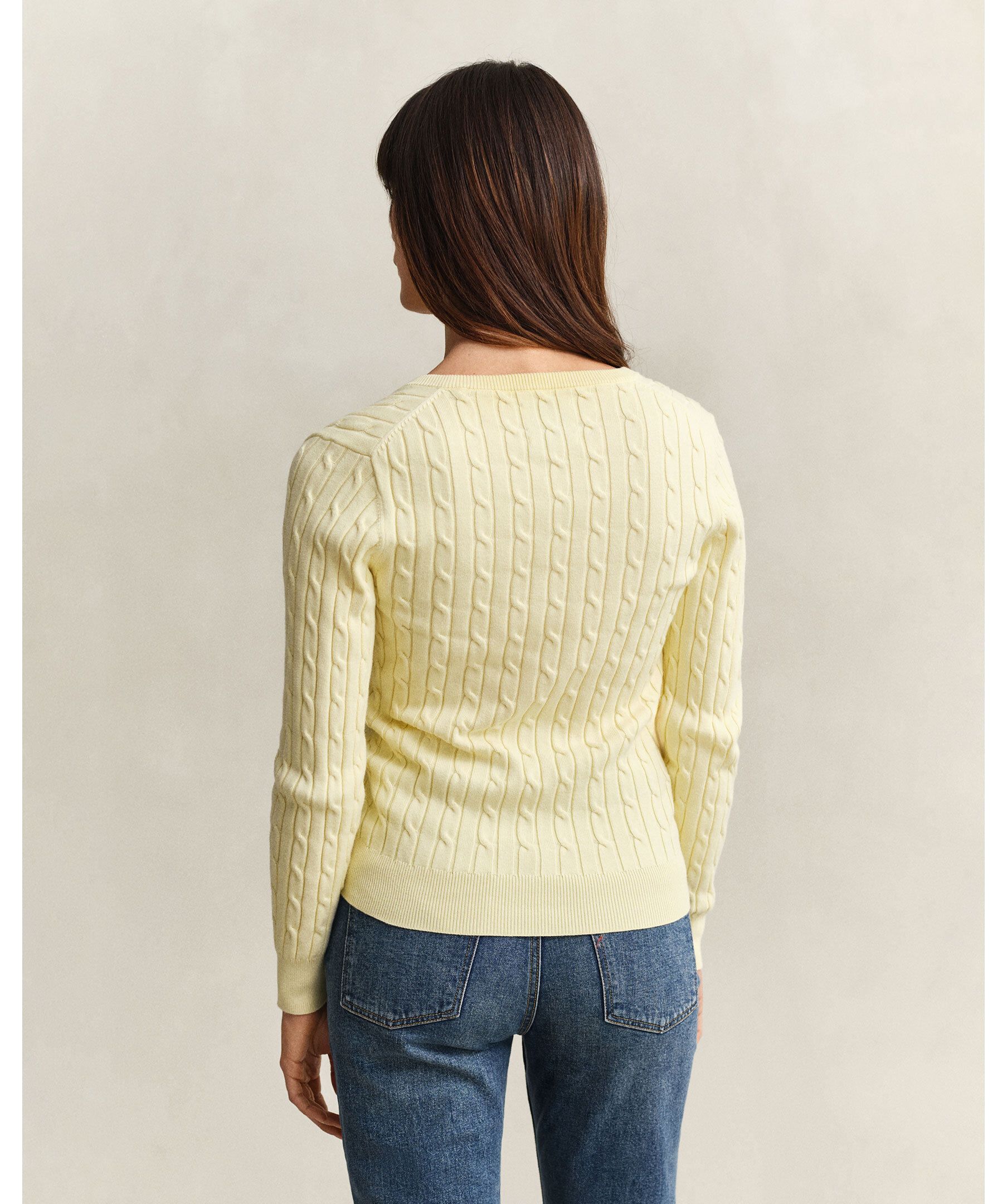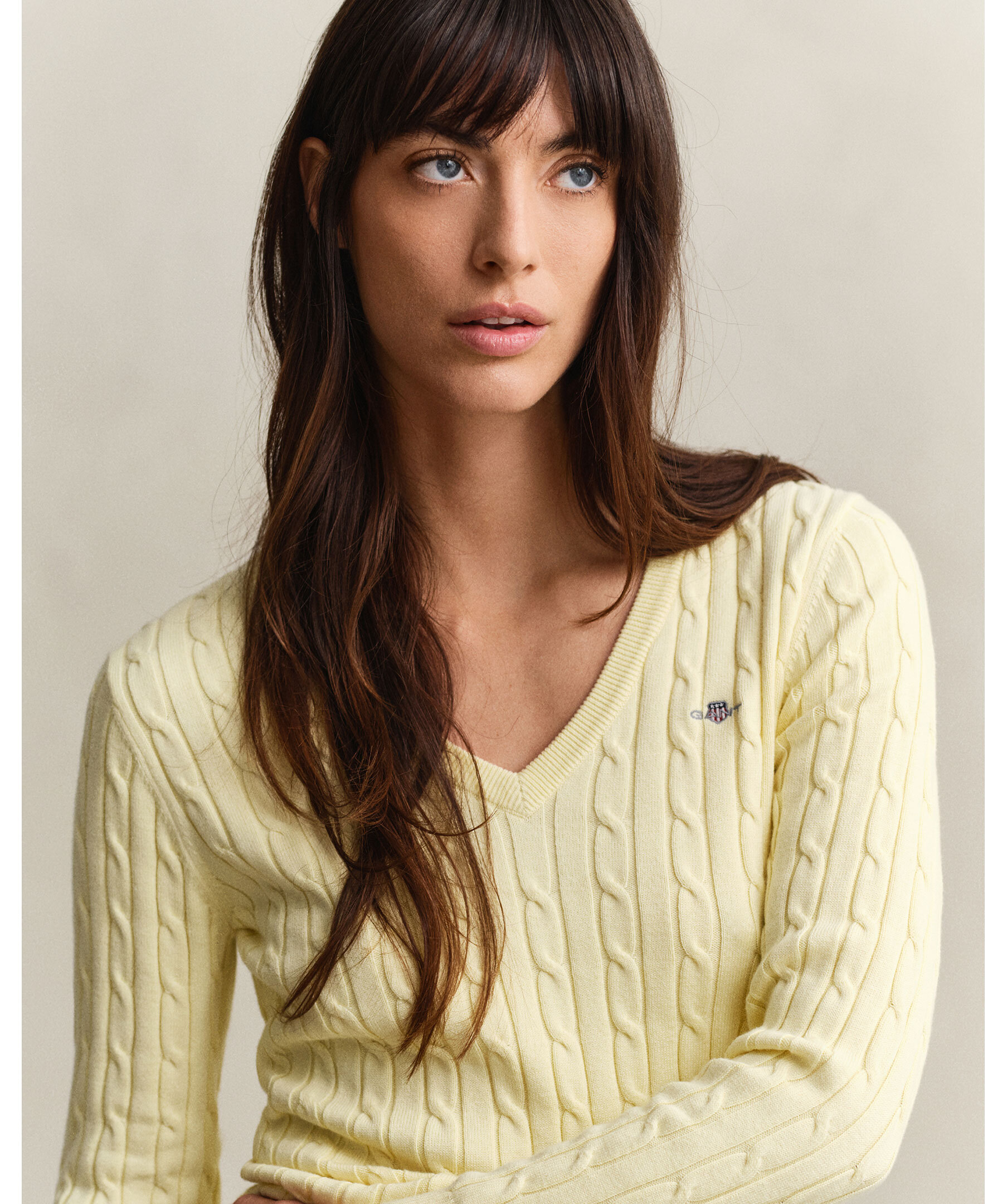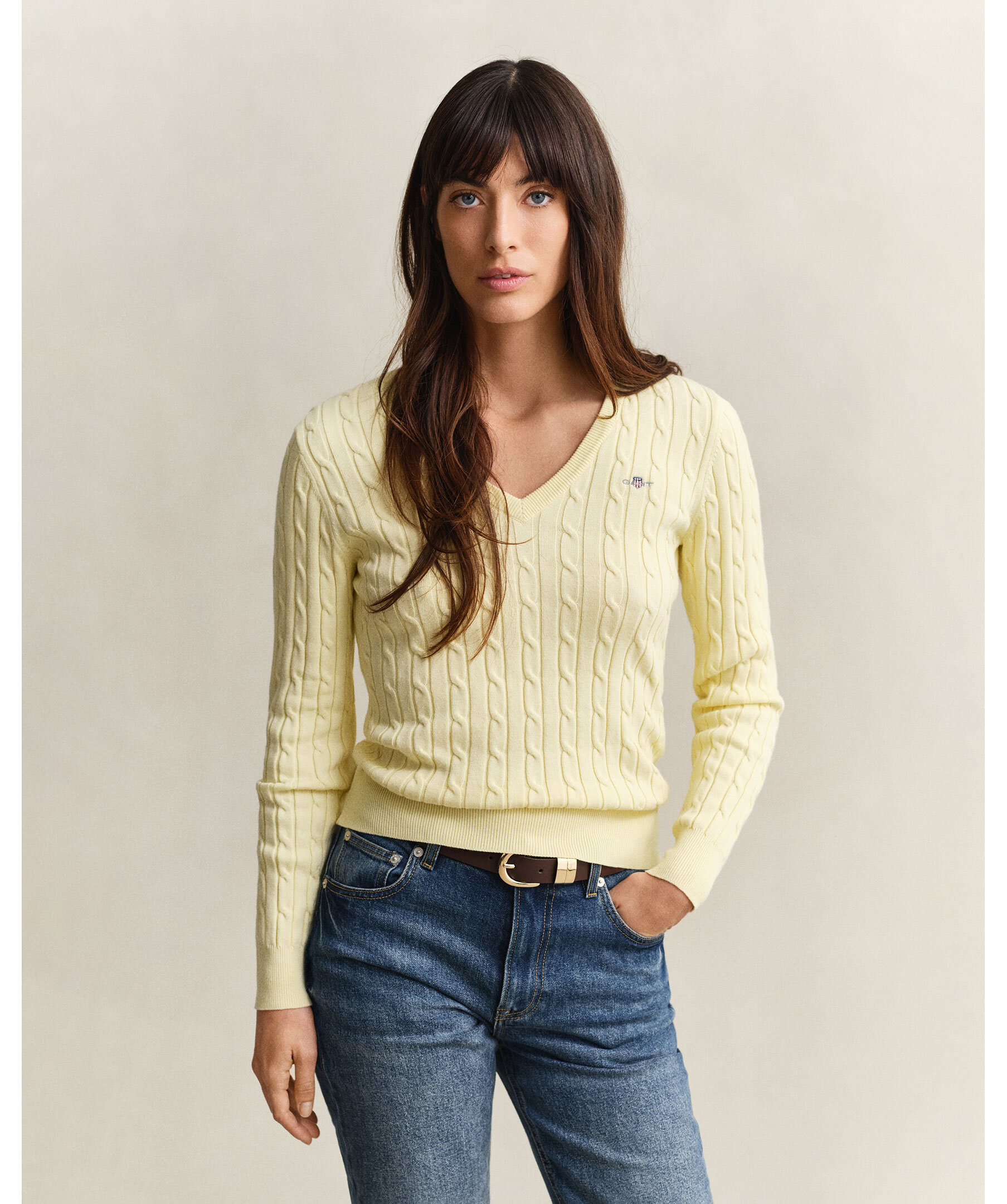 Ljusgul, v-ringad tröja i kabelstickning från Gant. Gjord i mjuk bomulls- och elastanblandning för slim fit med stretch. Broderad Gant-logotyp på bröstet, ribbstickad krage, ärmslut och nederkant. Mångsidig tröja som passar till jeans, byxor, kjolar och shorts.