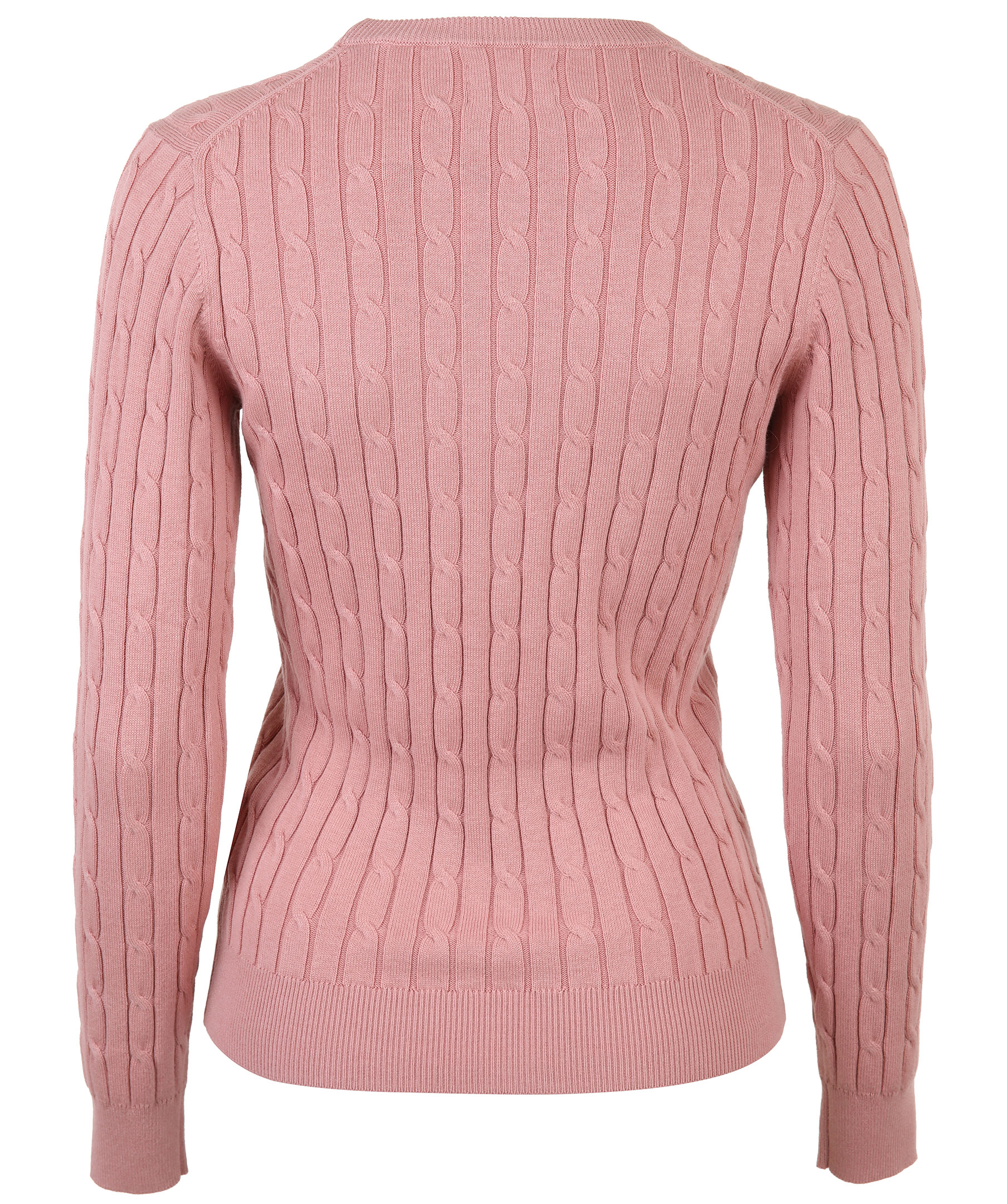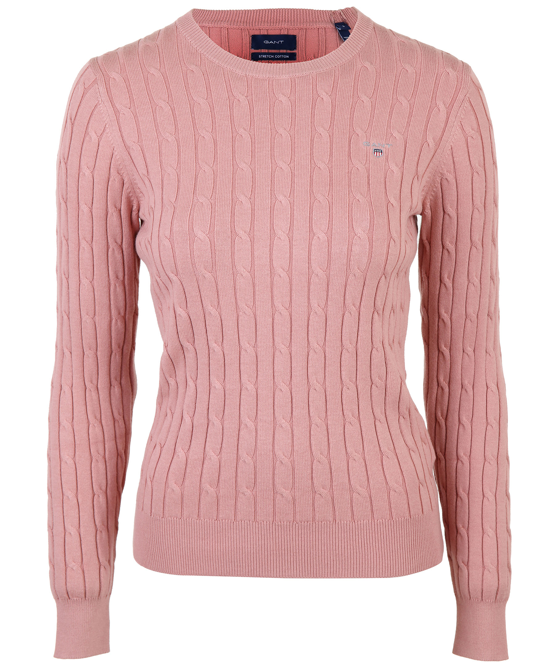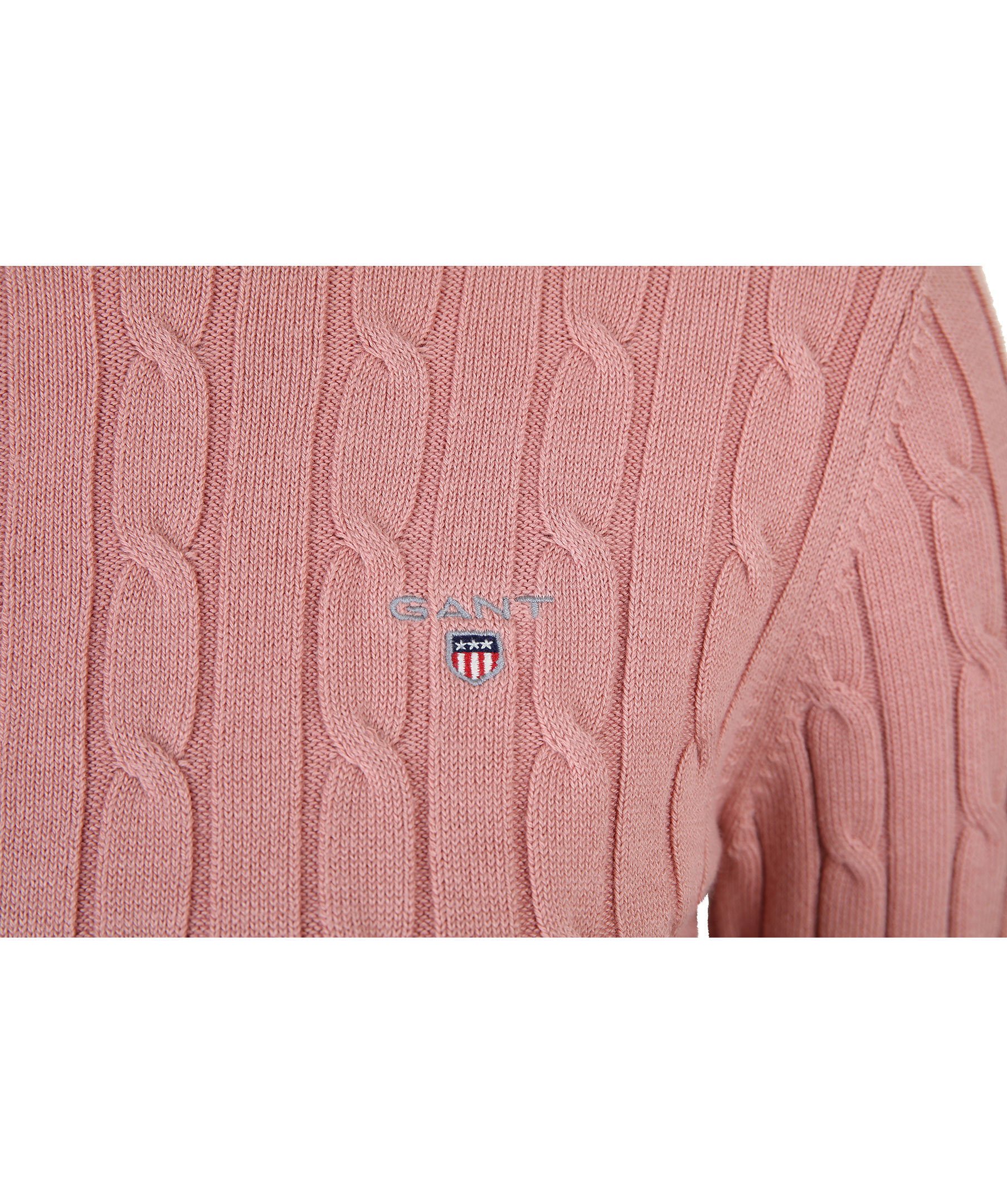 Gammelrosa, kabelstickad tröja från Gant. Liten broderad logotyp på vänster bröst. Ribbstickade muddar vid halsring, ärm och plagg slut. Tillverkad i mjuk bomullsmix.