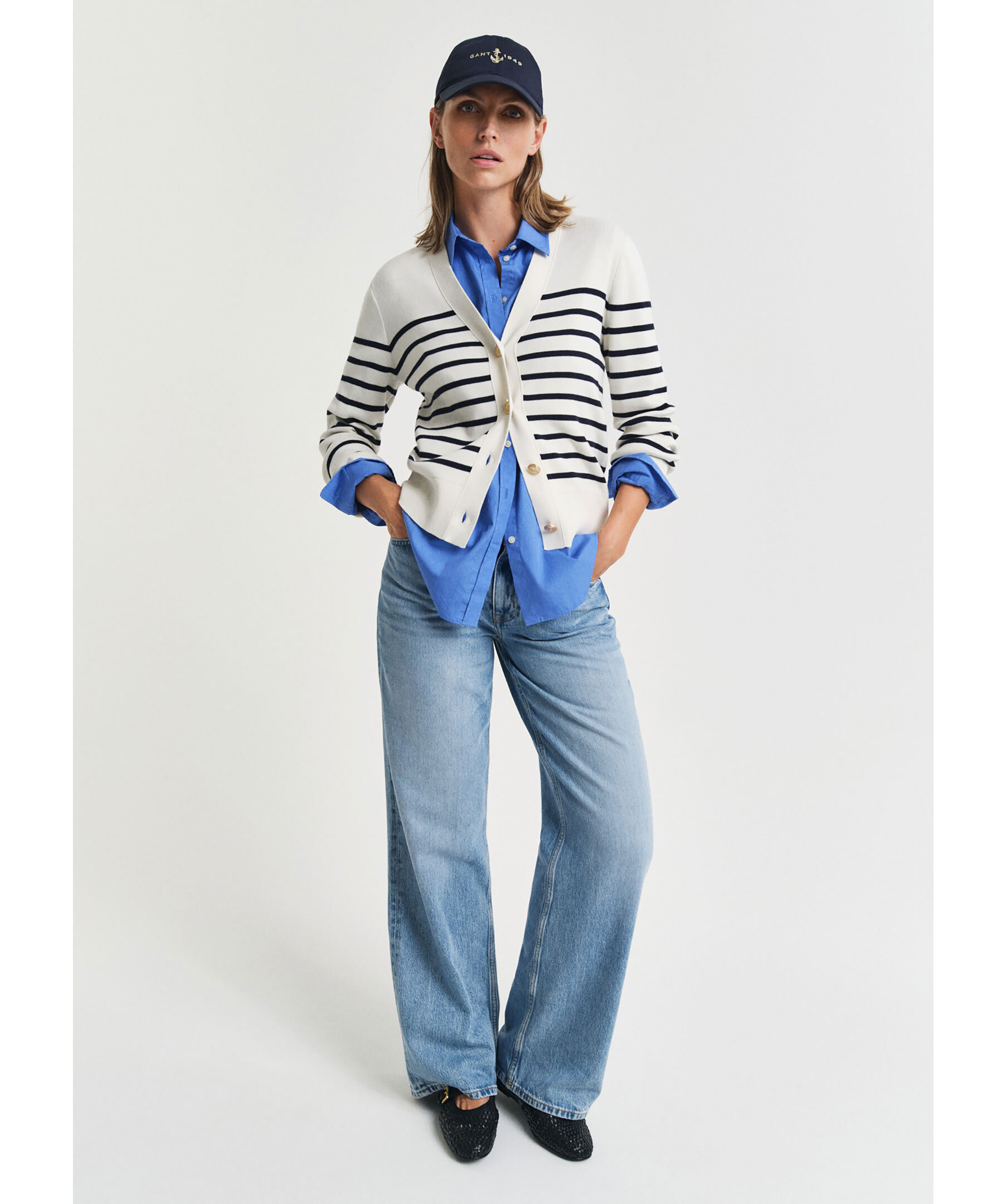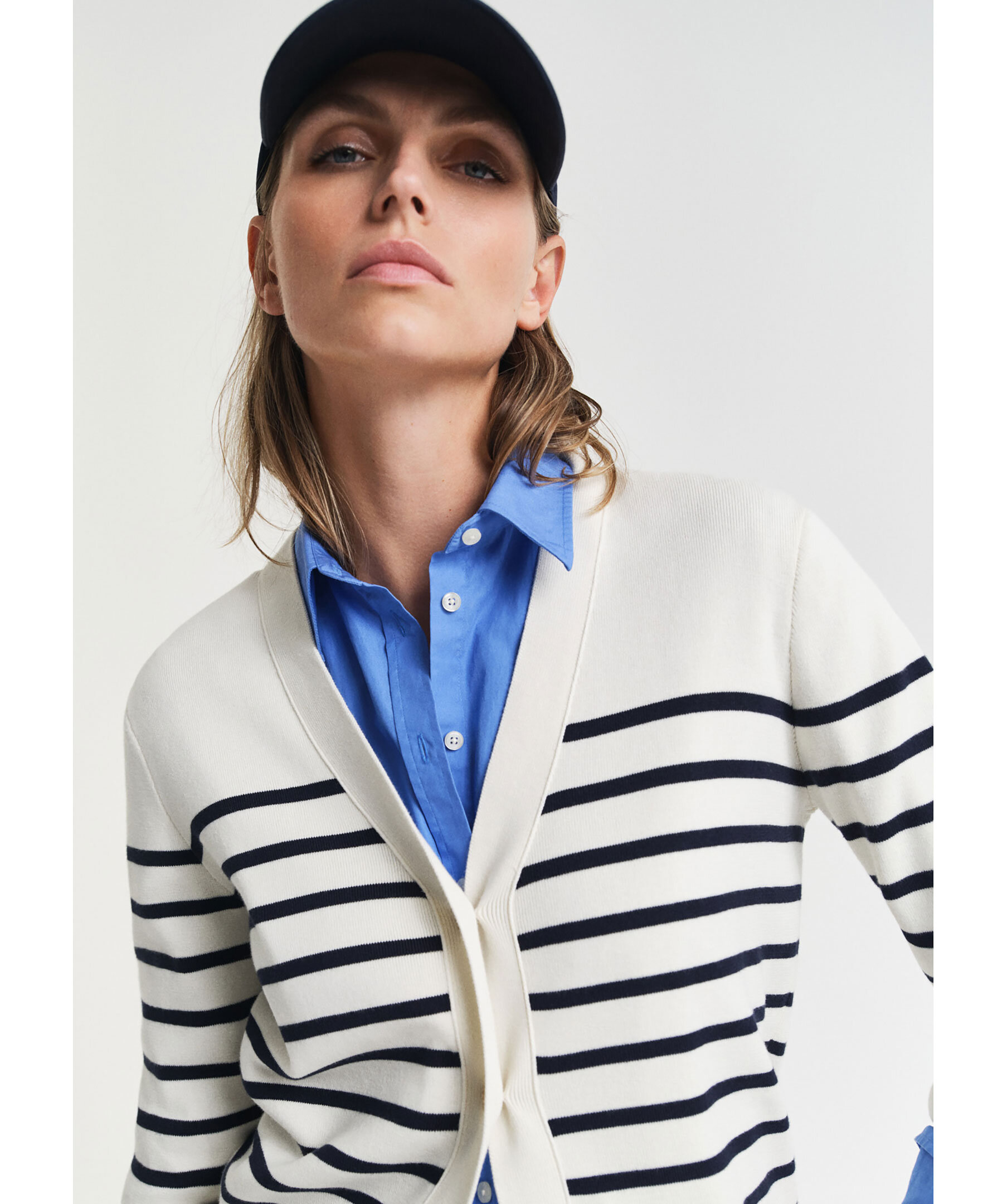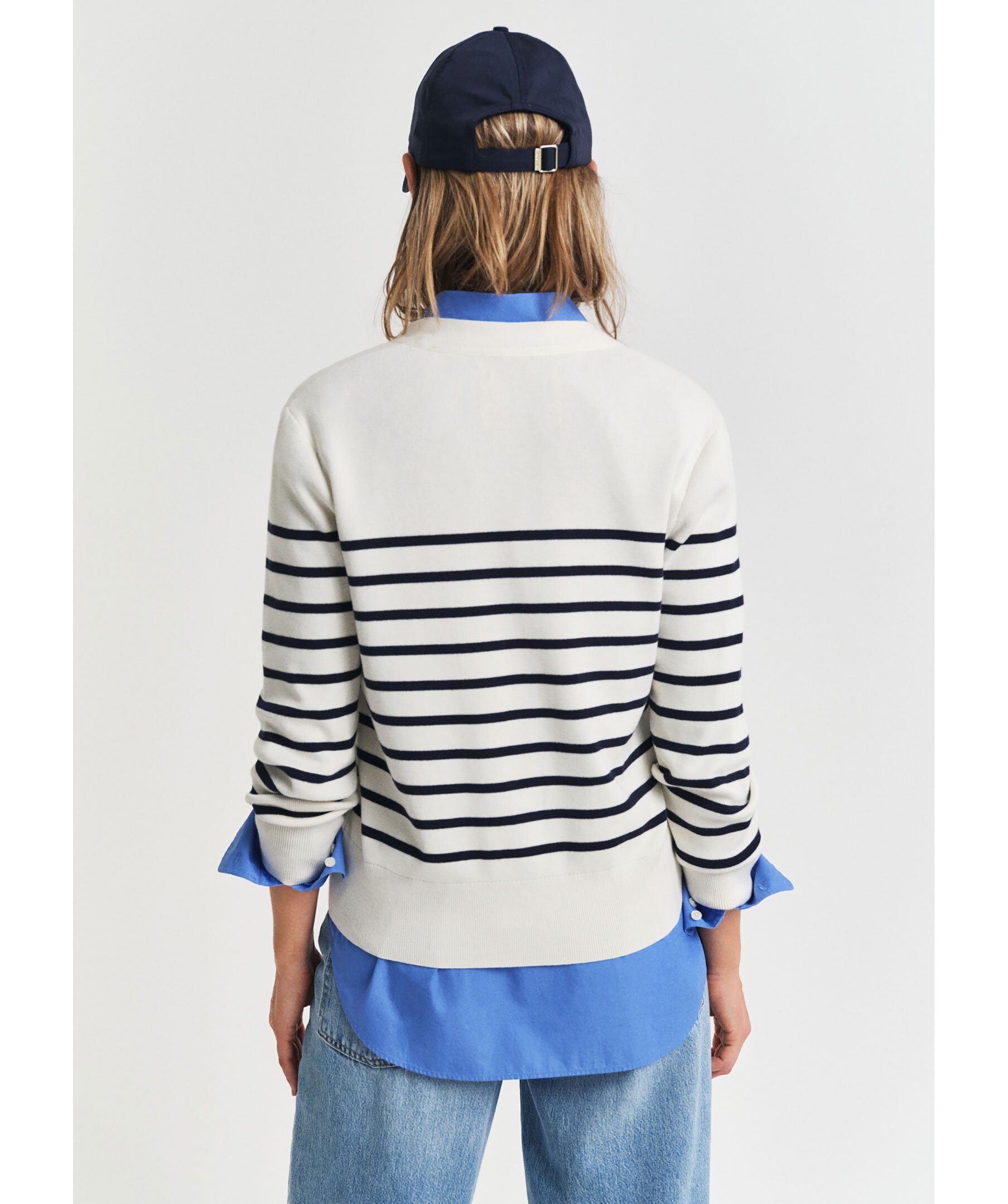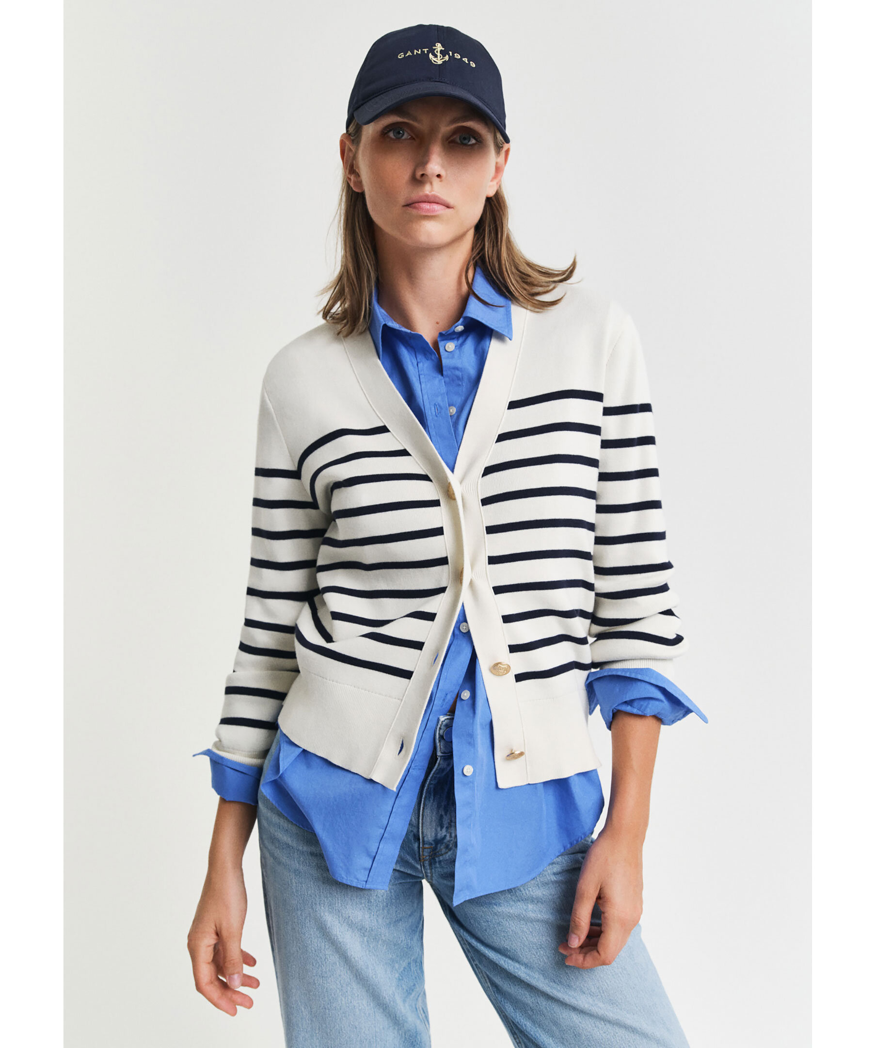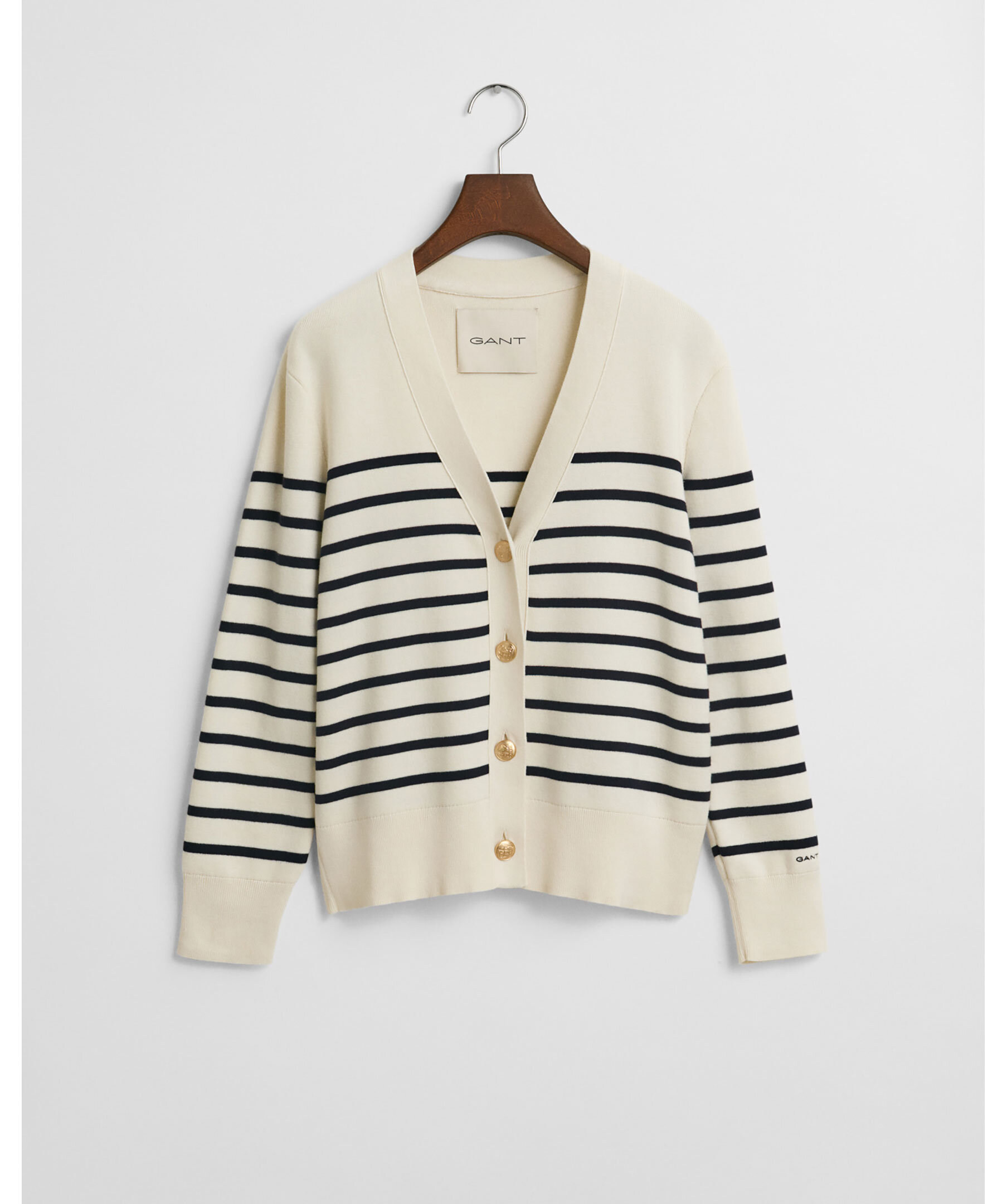Krämvit och blårandig kofta från Gant. Koftan stängs med gulfärgade knappar framtill och har ribbstickade detaljer. Broderad logotyp vid ärmslut. Tillverkad i bomull.