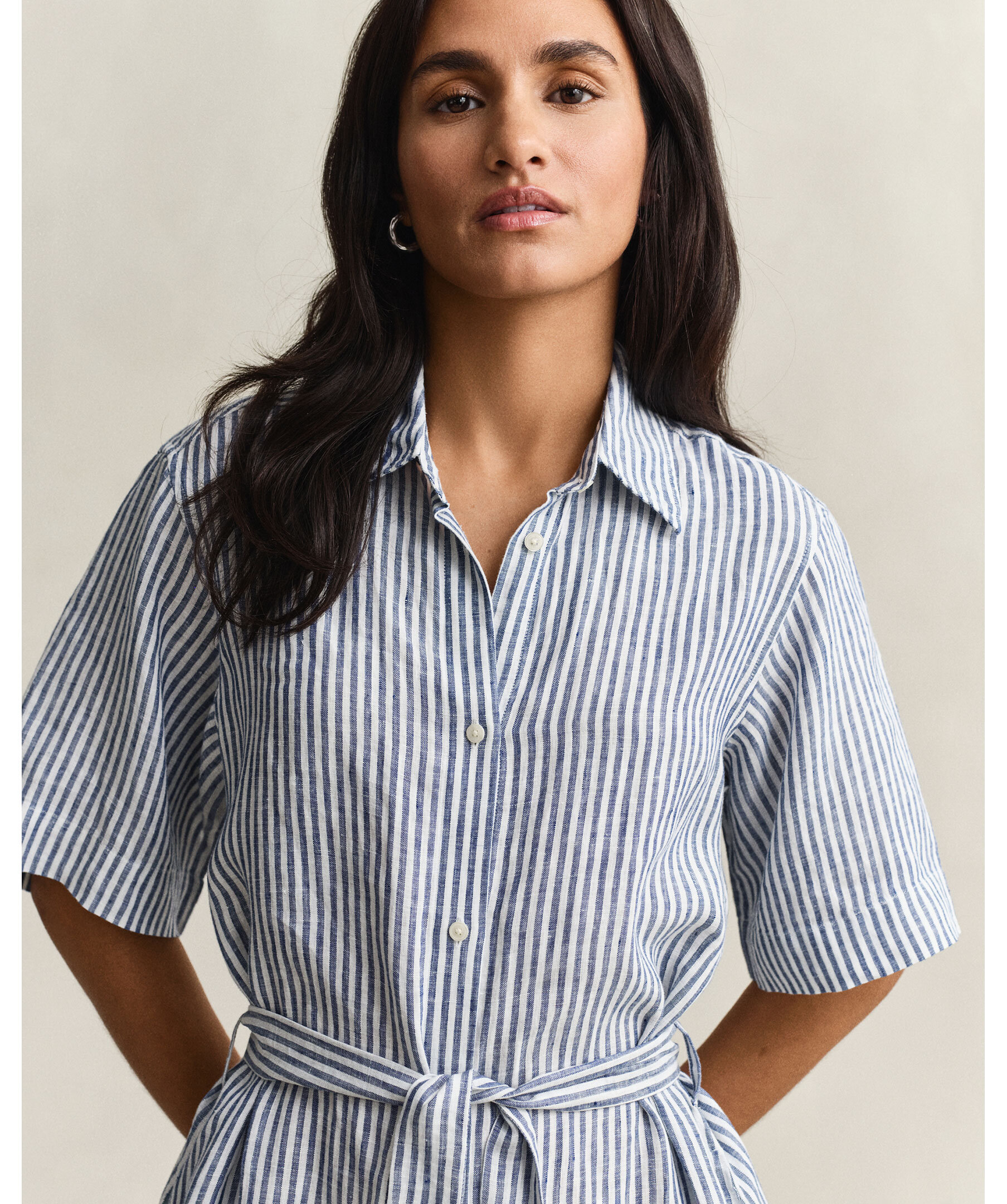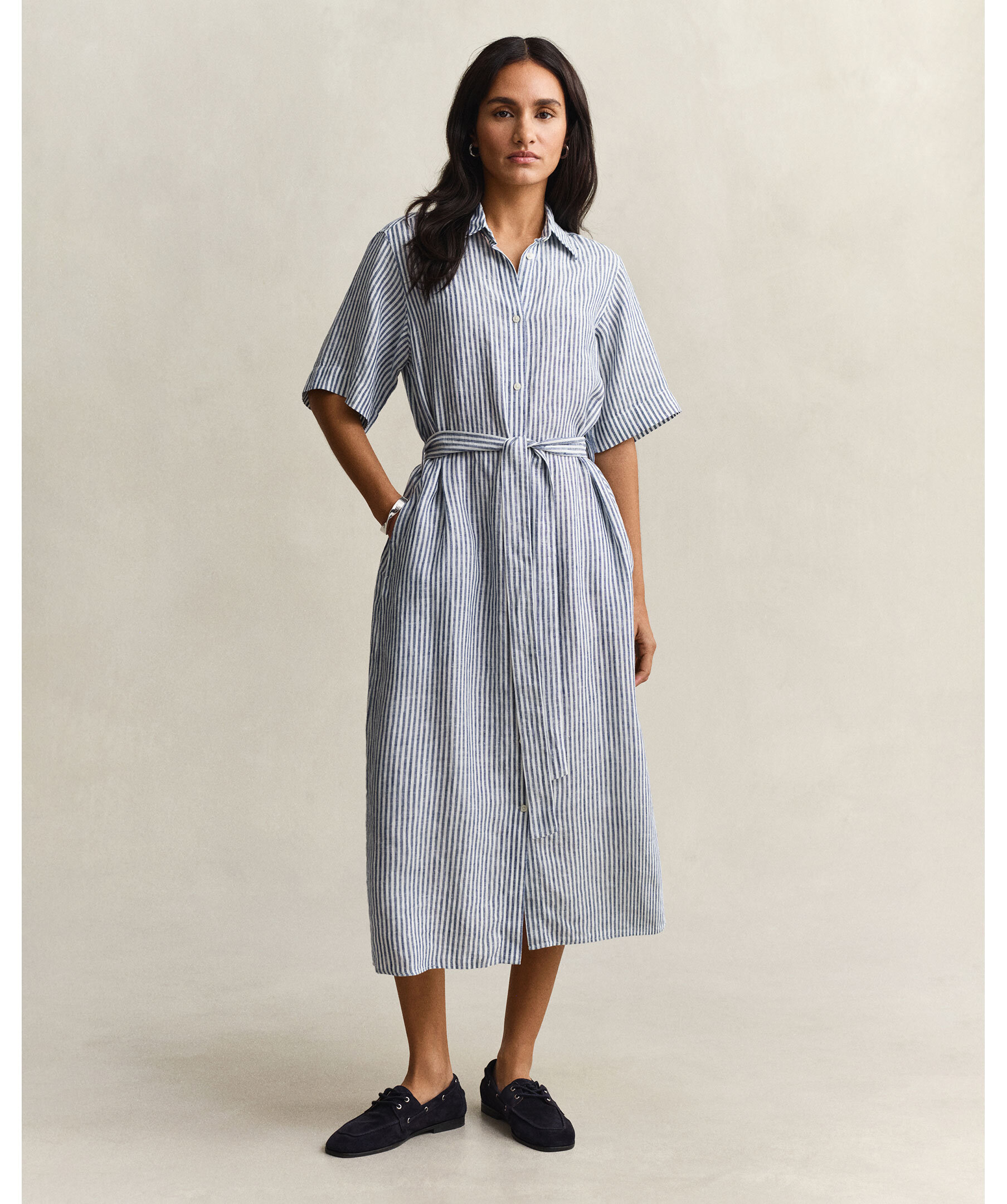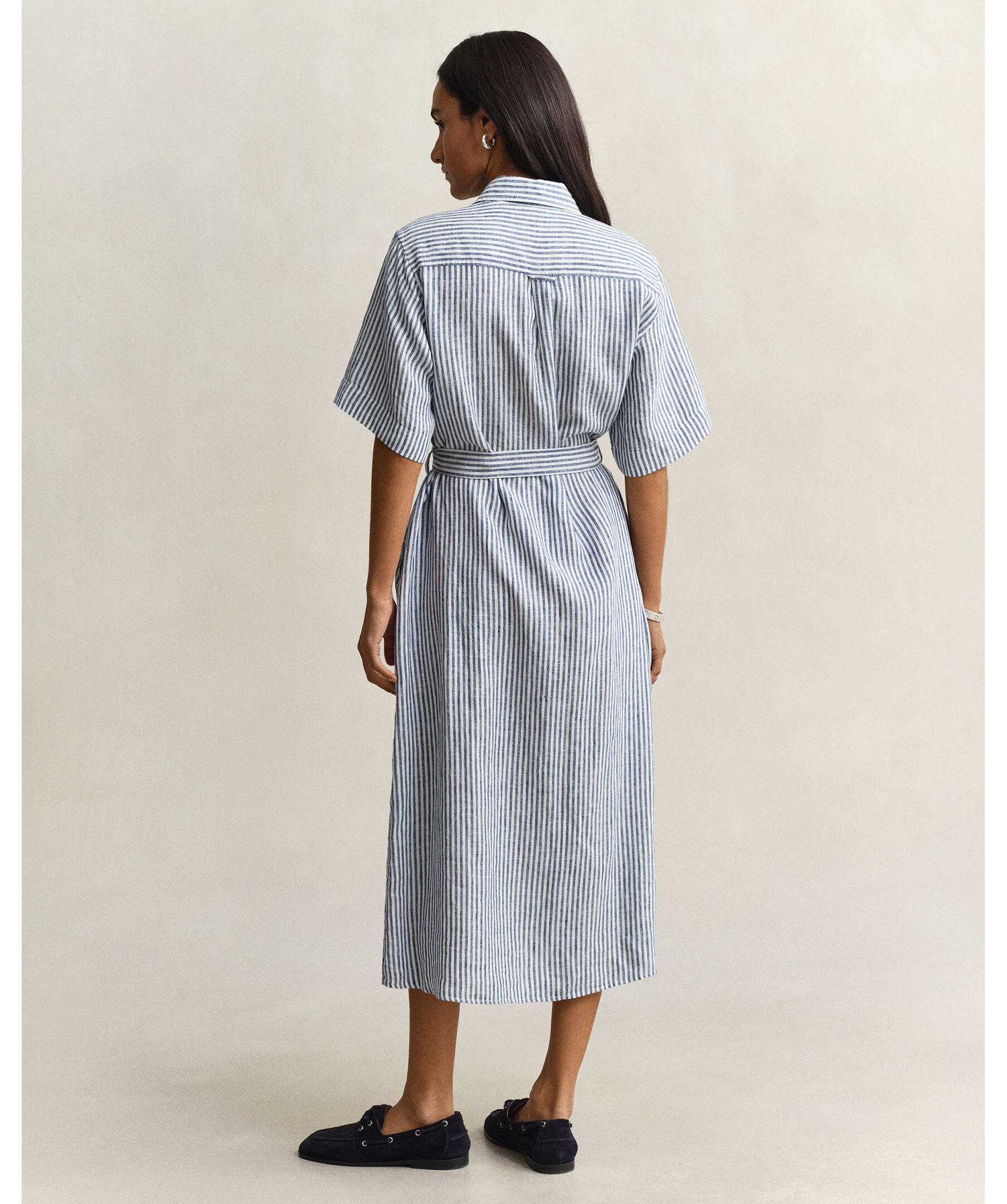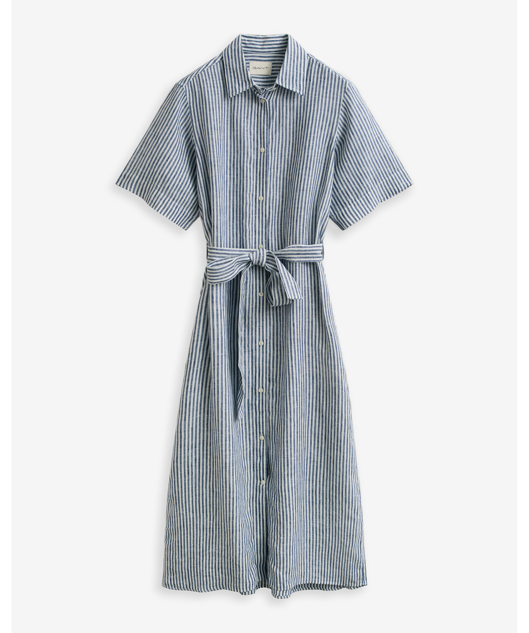 Randig kortärmade klänning från Gant är tillverkad i lin för naturlig andningsförmåga och lätthet. Normal passform, midjekort längd, spetskrage och hel fransk knappslå inspirerad av klassiska skjortor. Självknutet midjebälte för smickrande silhuett, sidfickor, samt boxveck och märkets hängögla baktill ger en elegant finish.