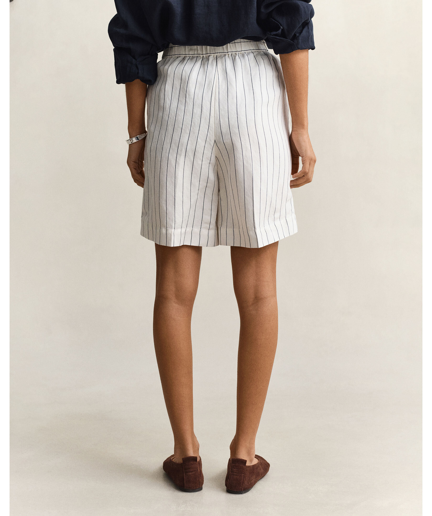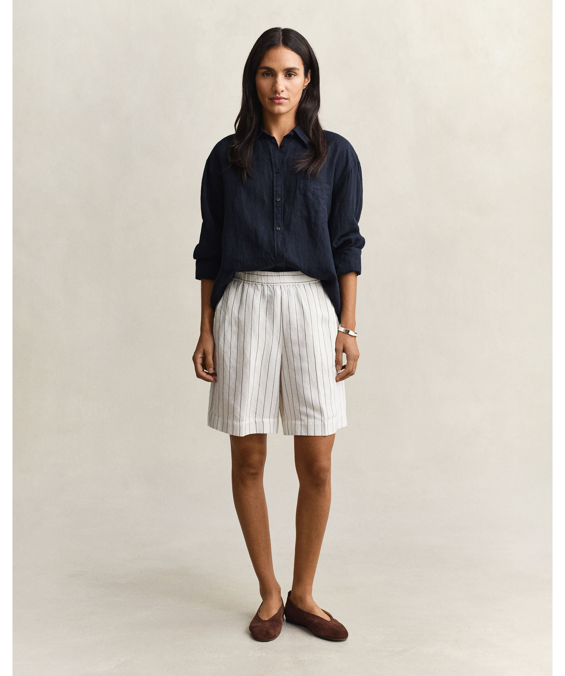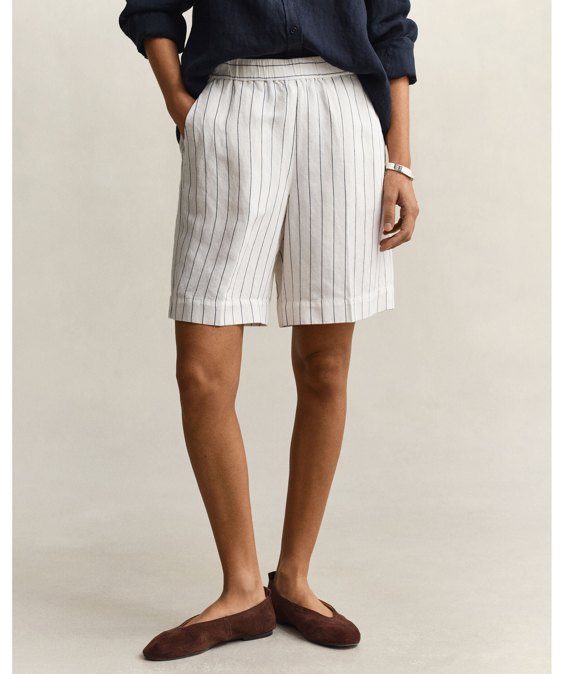 Randiga sommarshorts från Gant. Tillverkade i en blandning av lin och viskos, vilket ger ett mjukt fall och ett diskret lyster. Shortsen har en avslappnad, rak passform med medelhög midja och slutar mitt på låret.