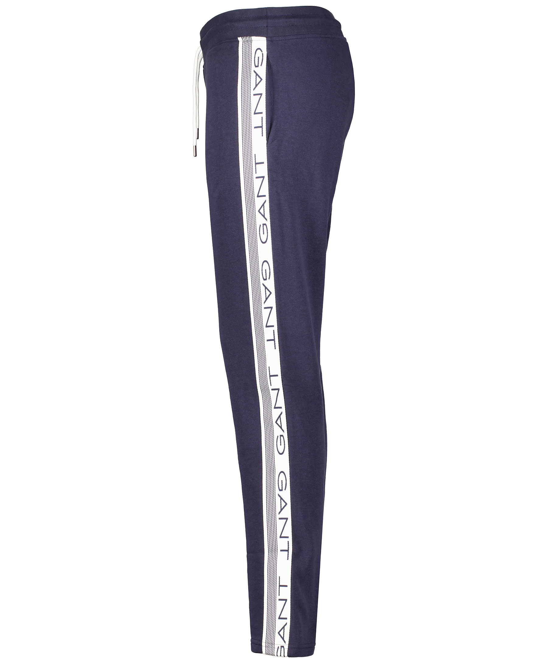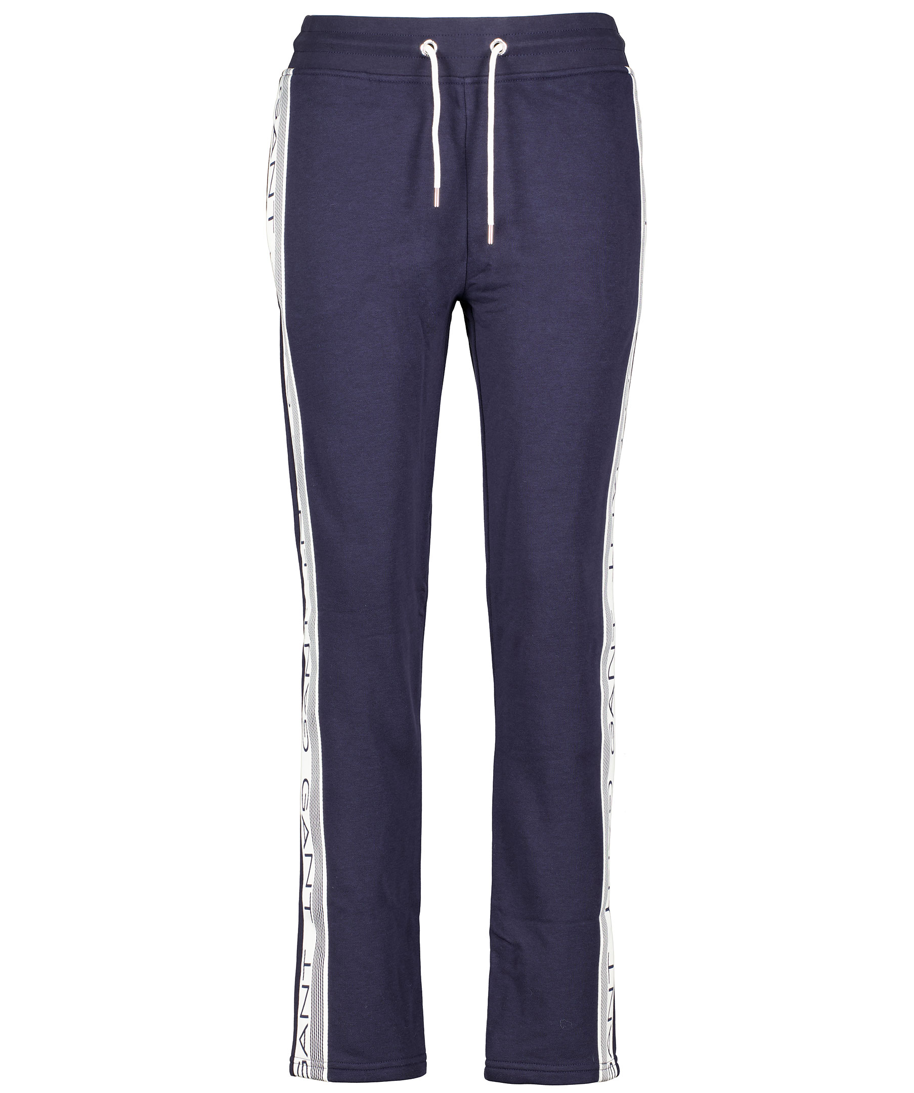 Marinblå mjukisbyxor från Gant. Tillverkad i en mjuk och något stretchig bomullsblandning. Byxorna har två framfickor och resårband med dragsko i midjan. Revär med logotyper längst benen. Byxorna har en mellan hög midja och avsmalnade ben. Från Gants 13 stripes kollektion.