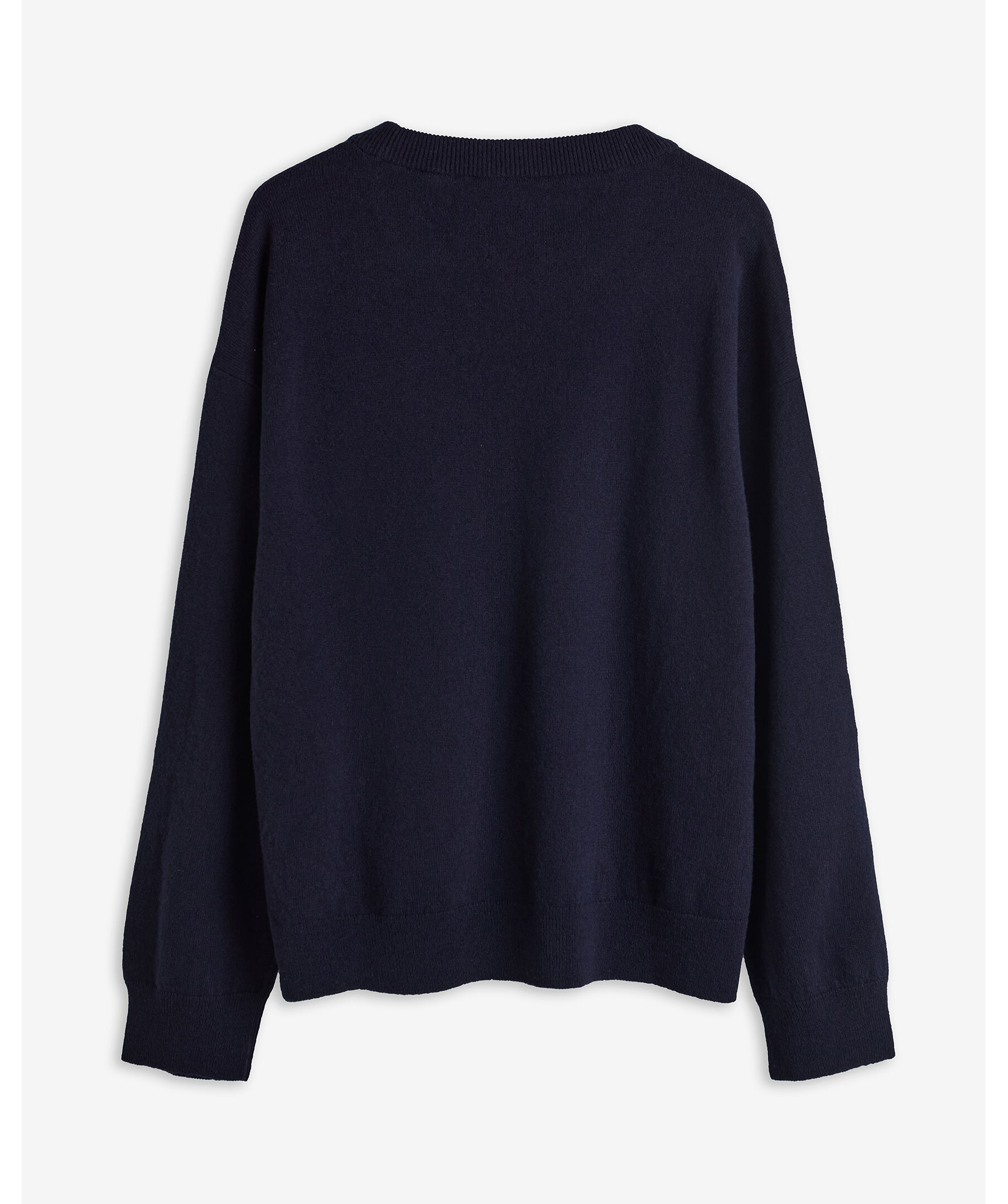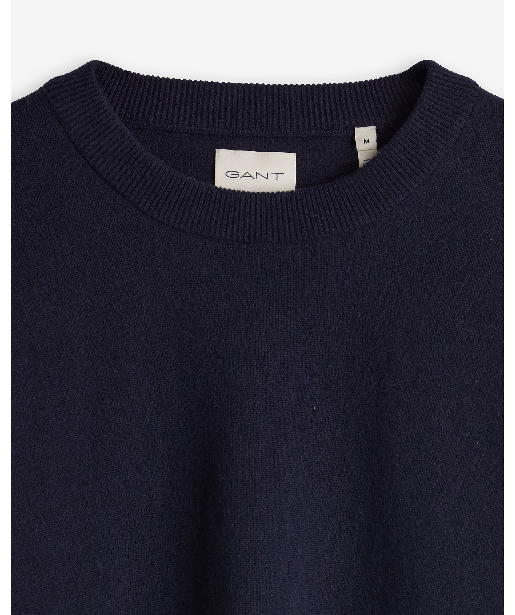 Mörkblå, finstickad pullover fån Gant. Tröjan har rund, ribbstickad halsringning samt ribbstickade muddar vid ärm- och plaggslut. Broderad logotyp vid ärmslut. Tillverkad i lammull.