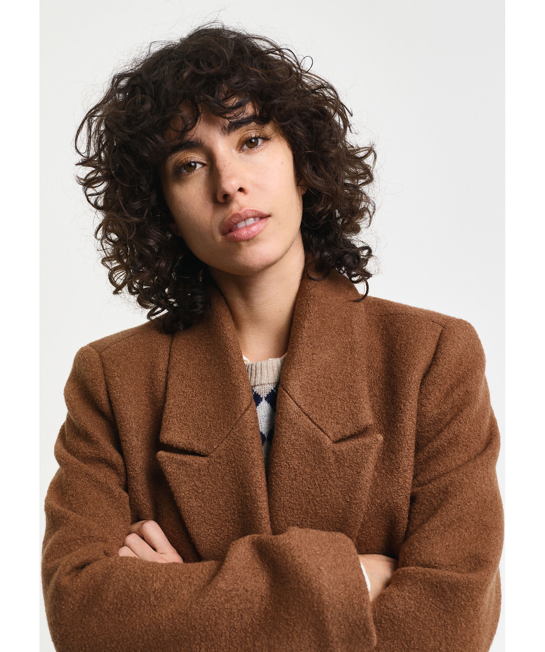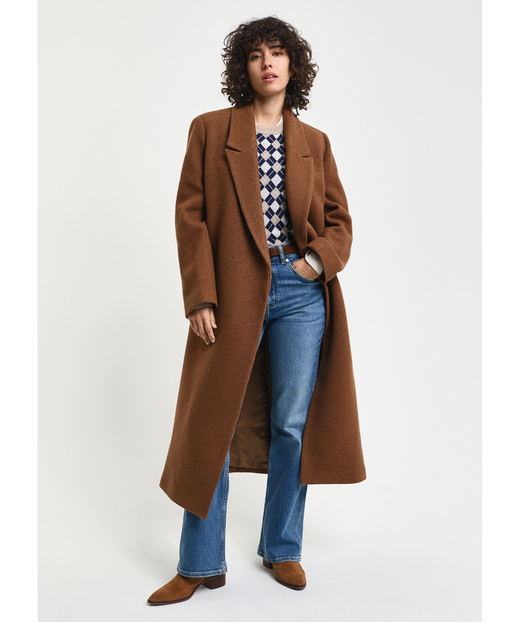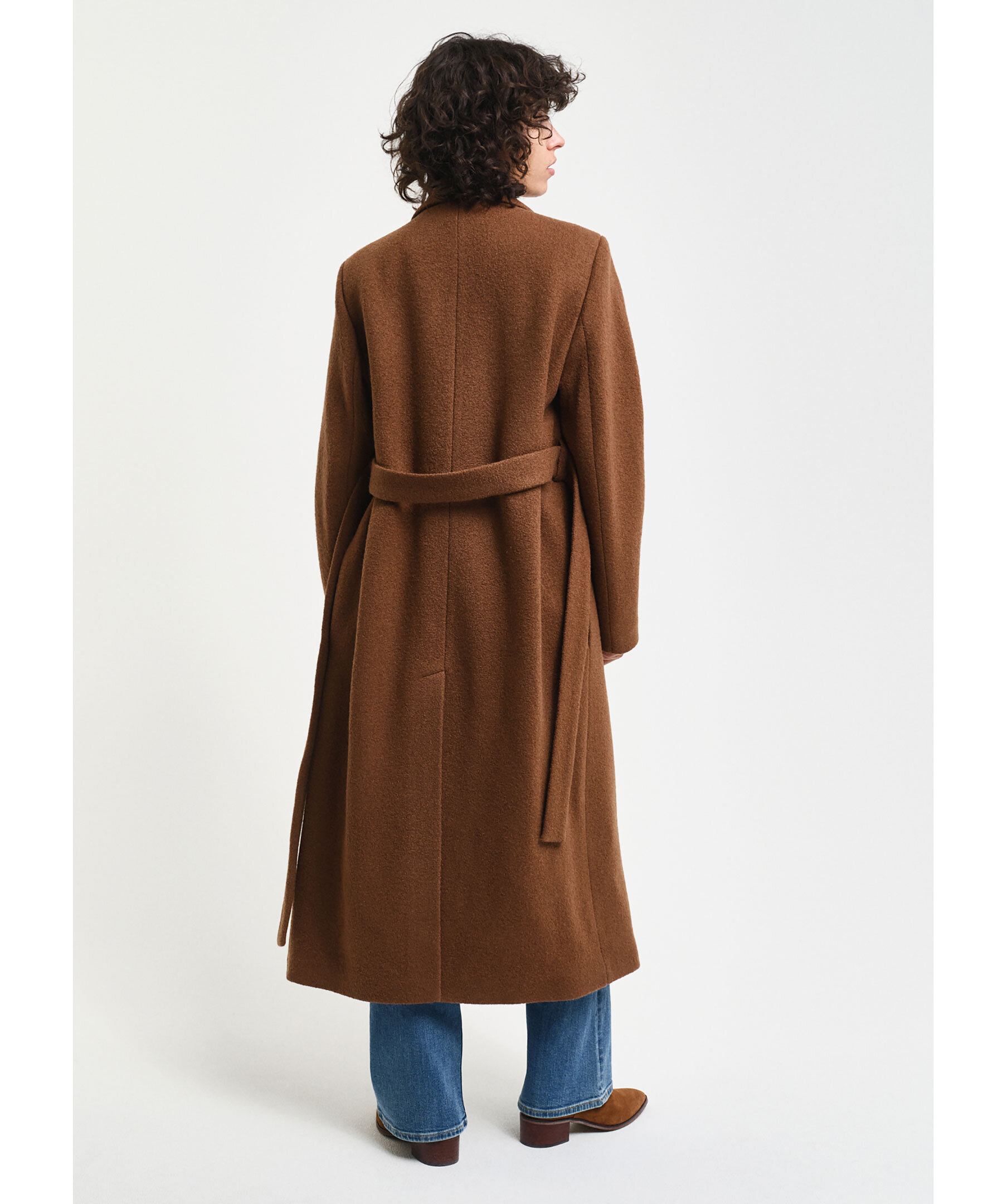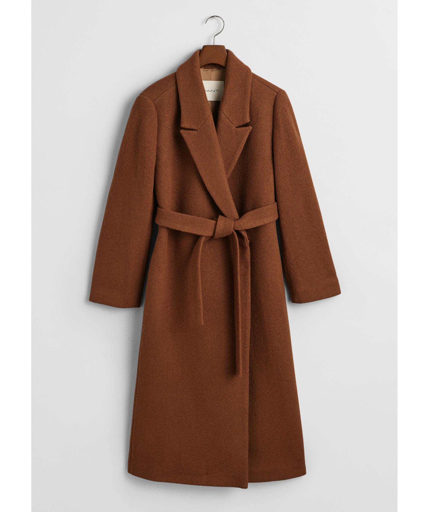 Kanelfärgad kappa från Gant. Kappan slutar vid vaden och stängs med knapp och bälte. Den har spetsiga slag, tygklädda tryckknappar och sidfickor. Tillverkad i en ullblandning.