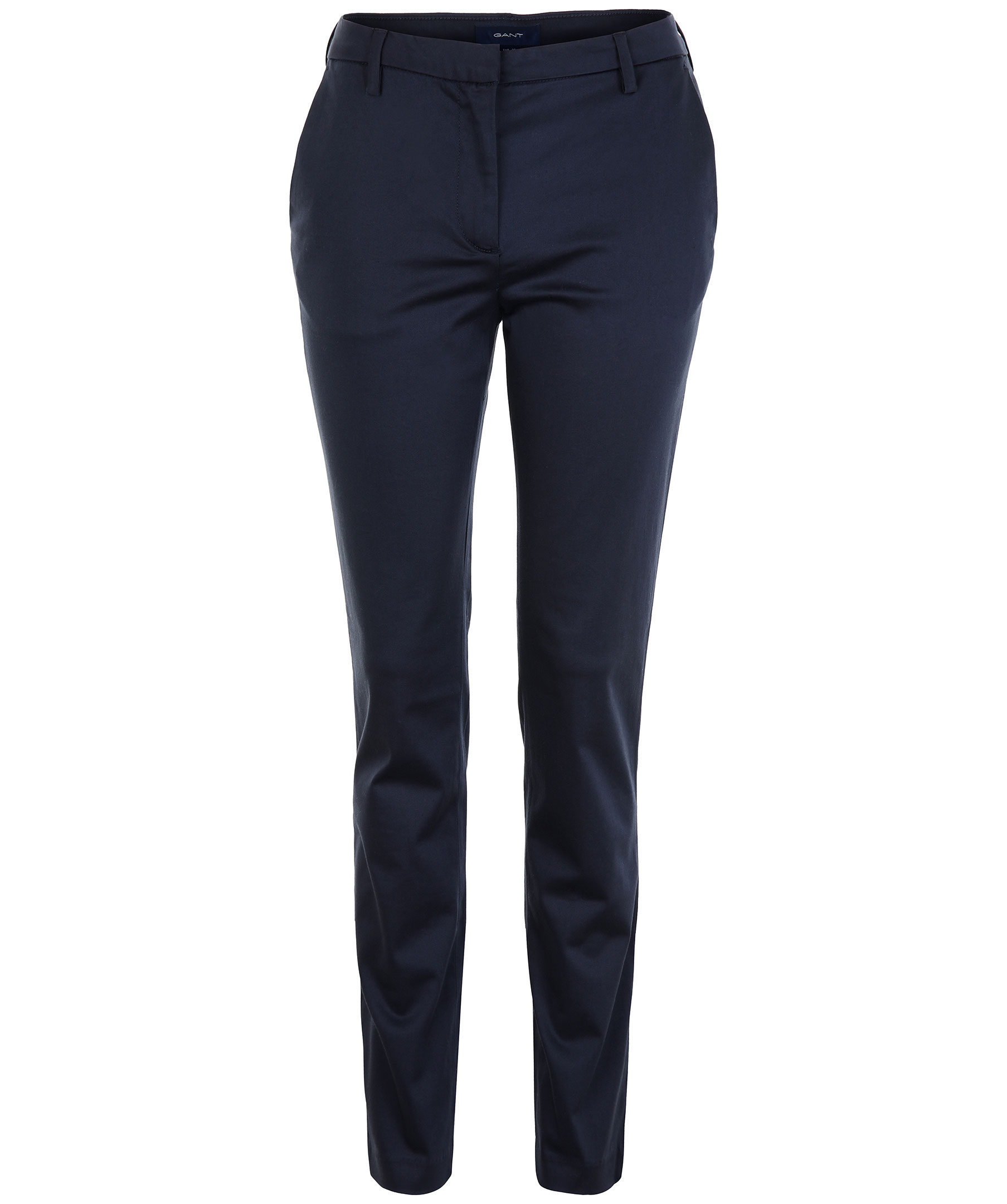 Marinblå byxa i chinomodell från Gant. Avsmalnande ben, snedställda fickor fram och raka fickor bak. Hällor i midjan för bälte och gylf med dragkedja och hake med öggla. Tillverkad i skön, stretchig bomullsblandning.