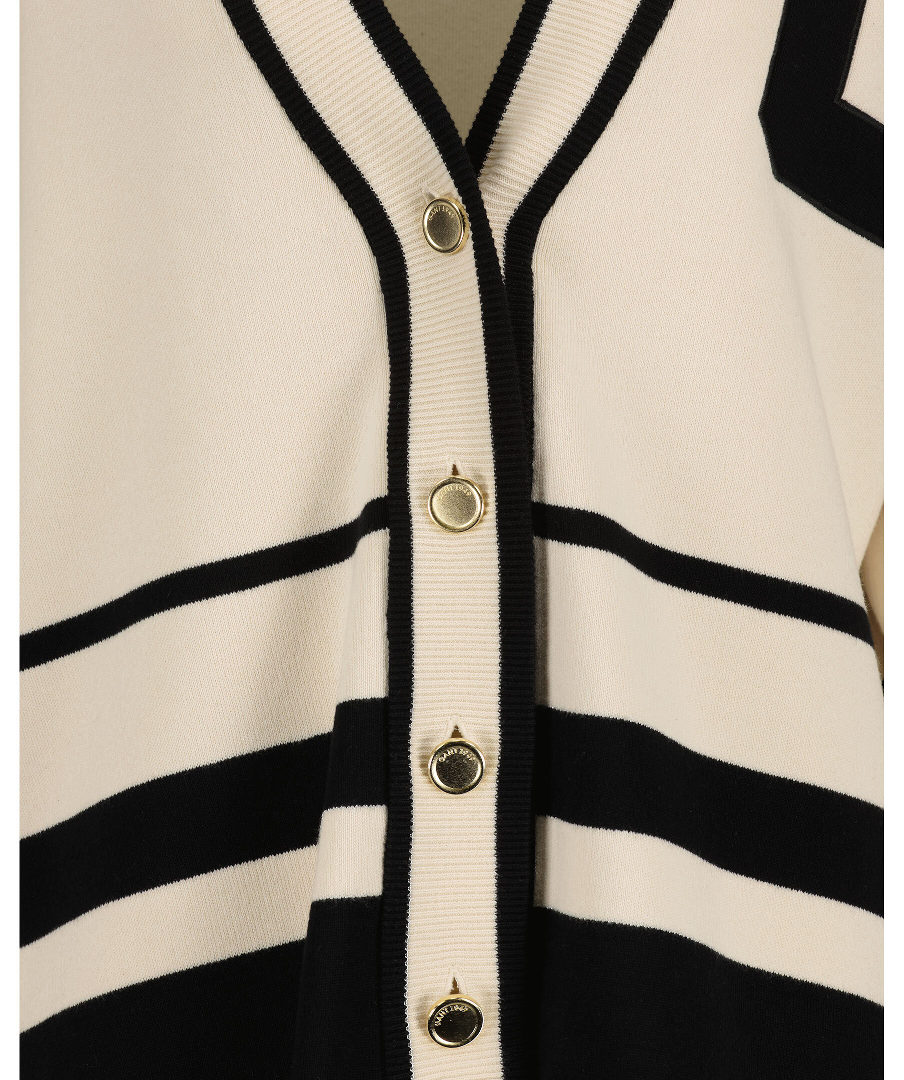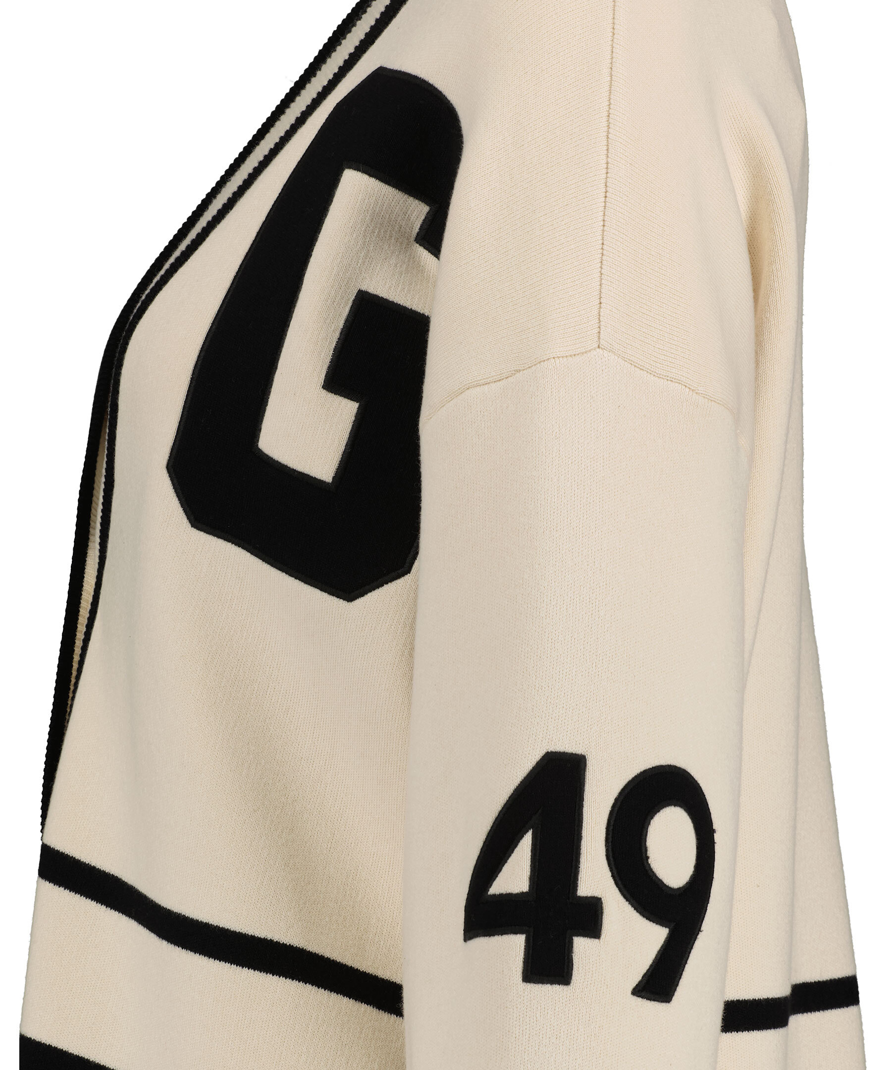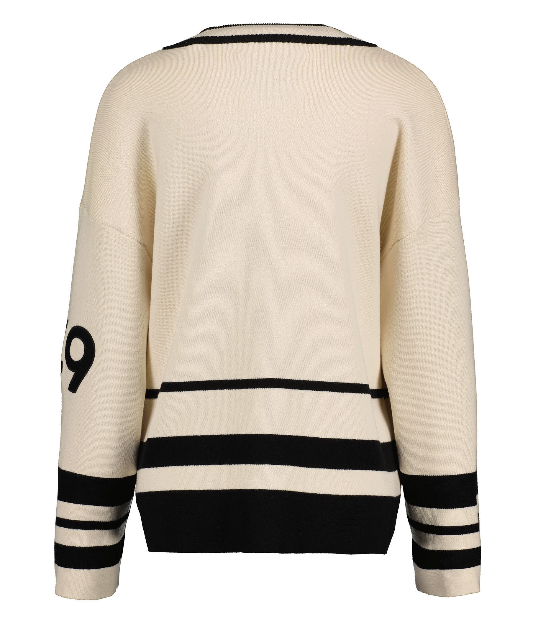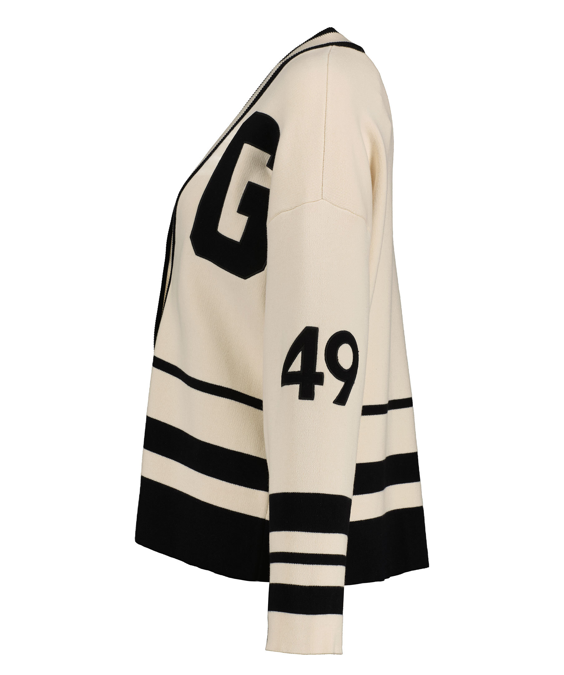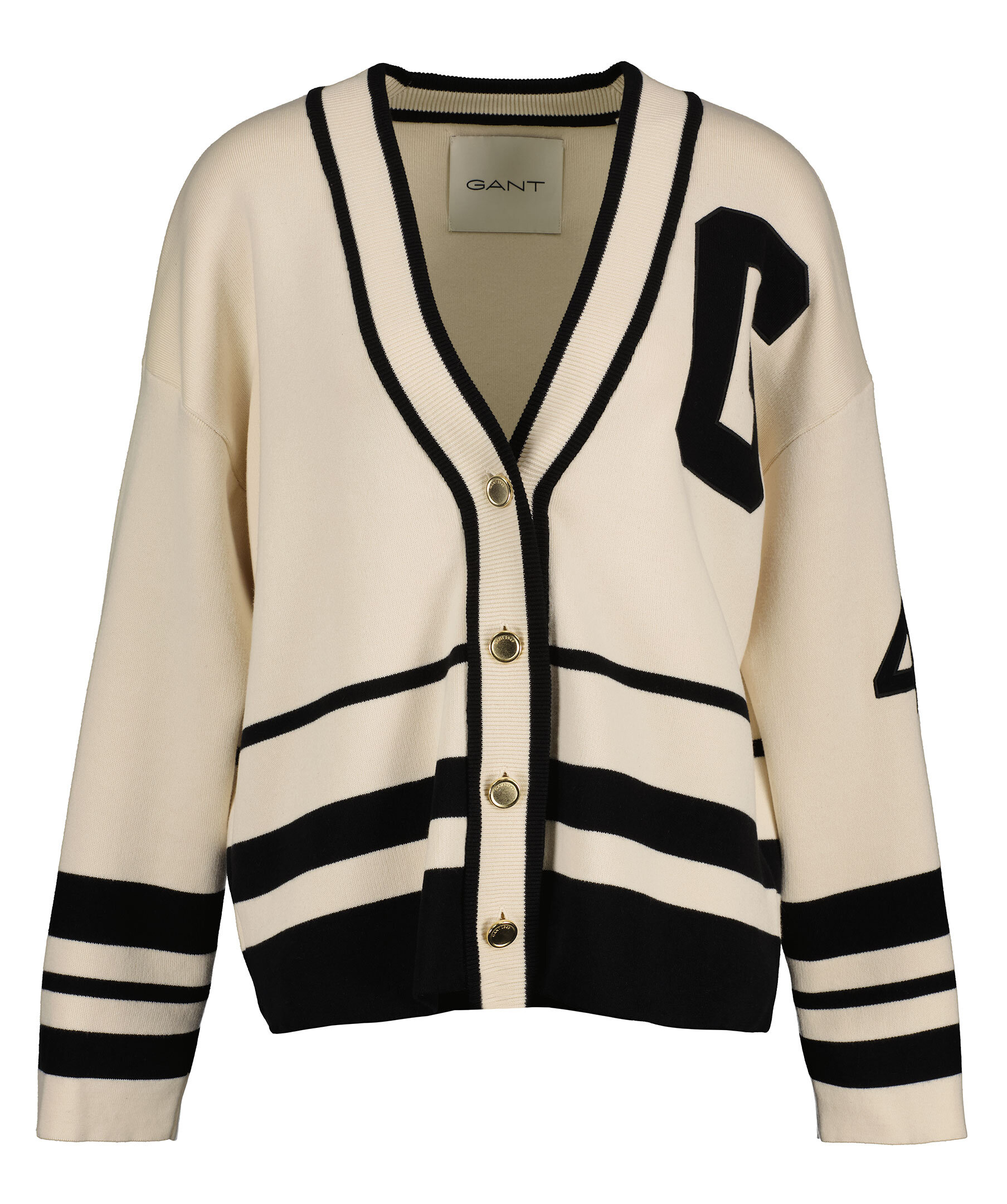 En krämvit och svart collegeinspirerad kofta från Gant. Koftan är gjord i 100% ekologisk bomull, med en skulptural Milanostickning samt emblem i intarsia på bröstet och ärmen. Kontrastfärgade ränder och guldfärgade knappar med logotyp tillför en autentisk känsla samtidigt som den avslappnade silhuetten gör koftan enkel att använda som ett extra lager ovanpå en klänning eller en skjorta. Plagget har en avslappnad passform. För en mer figurnära passform rekommenderar vi att du väljer en mindre storlek.