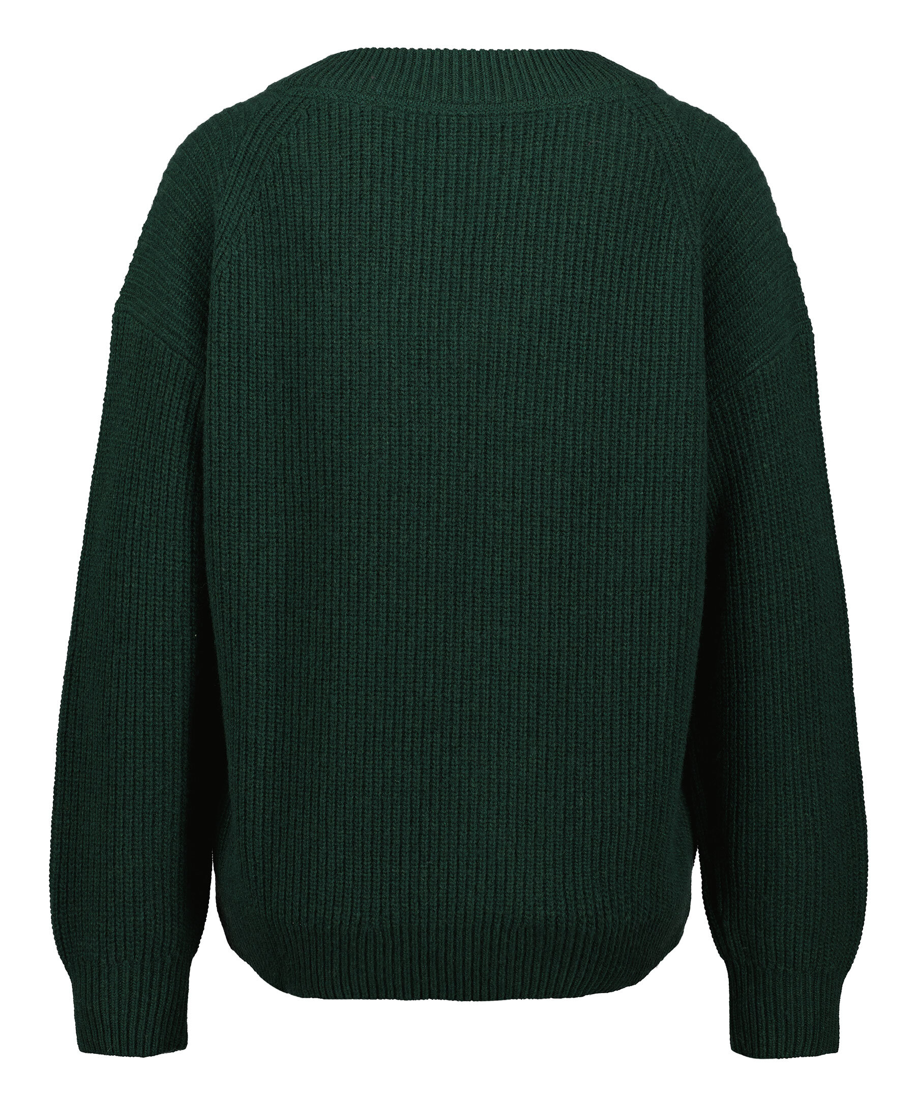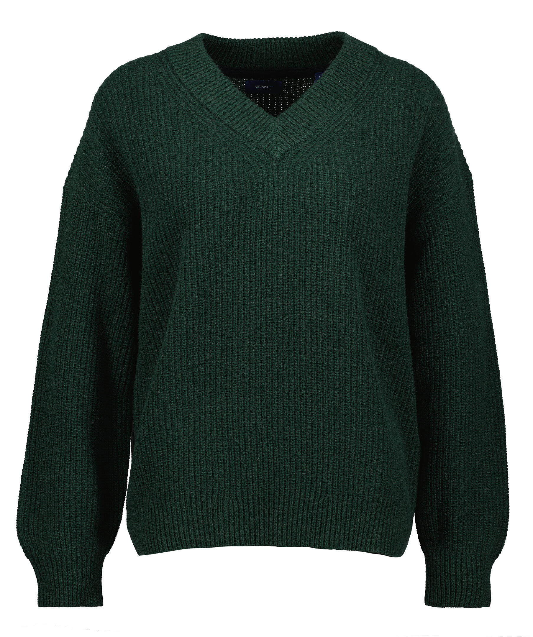 Mörkgrön ribbstickad tröja från Gant. Tillverkad i ullblandning. Rak modell med vid passform. V-ringad halsringning. Broderad logotyp ton i ton ovanför resåren.