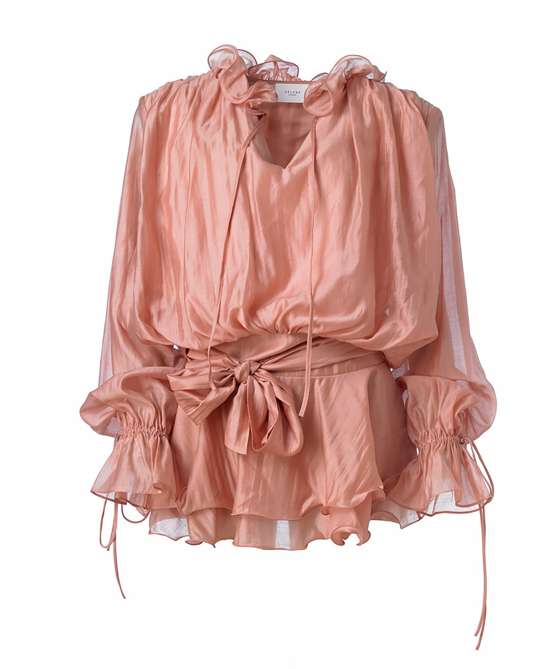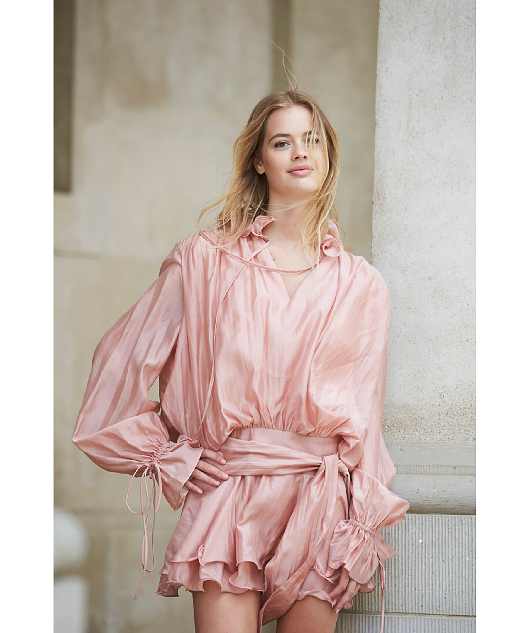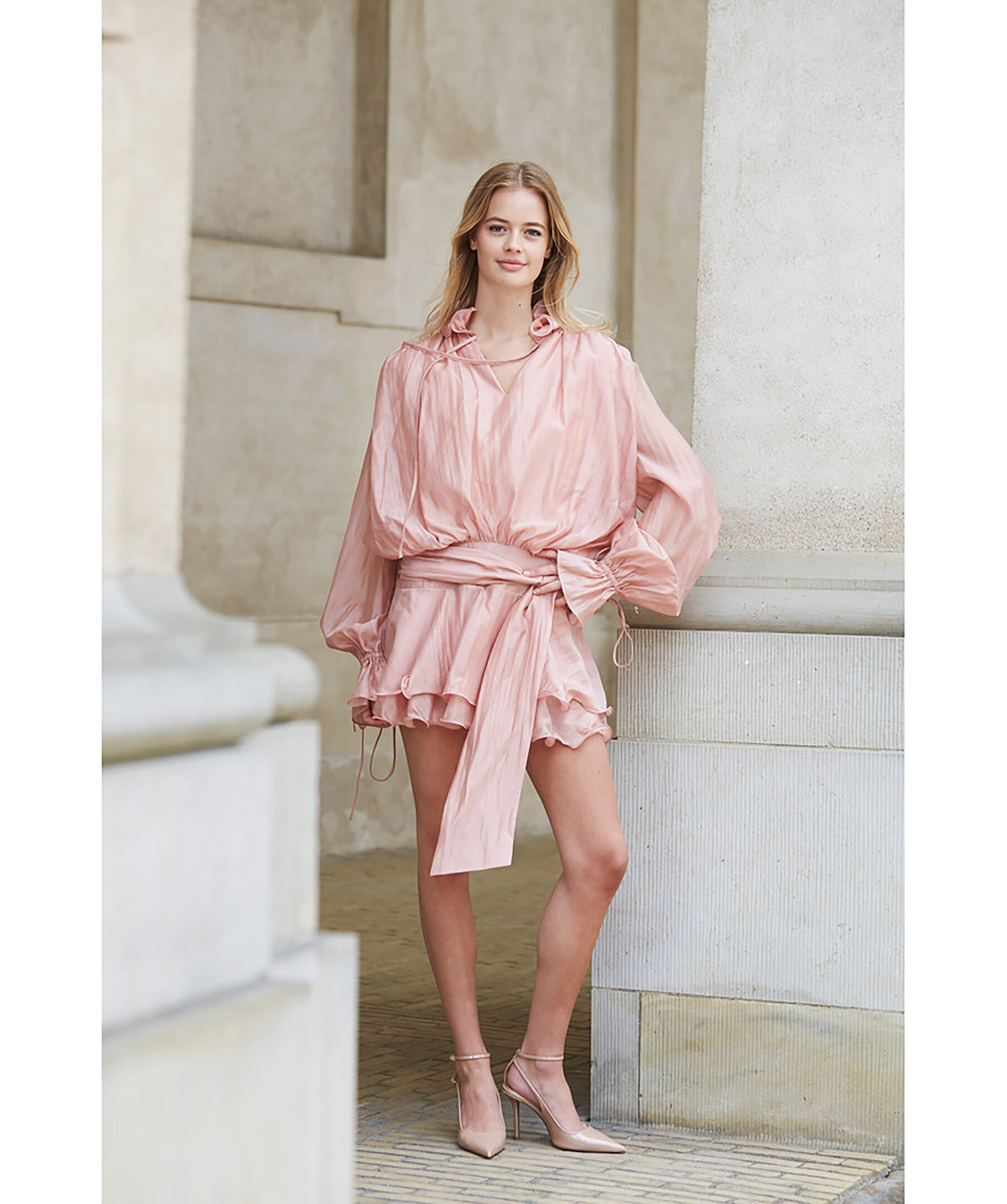 Miniklänning från Helene Studios i en vacker old rose-nyans, tillverkad i en lätt och luftig kvalitet som ger ett mjukt fall och feminin silhuett. Klänningen har en smickrande V-ringning med volangdetaljer och knytband framtill, samt långa, voluminösa ärmar med smock som skapar en modern silhuett. Den böljande kjolen med volanger och knytbälte i midjan framhäver figuren och ger ett romantiskt, sofistikerat uttryck.