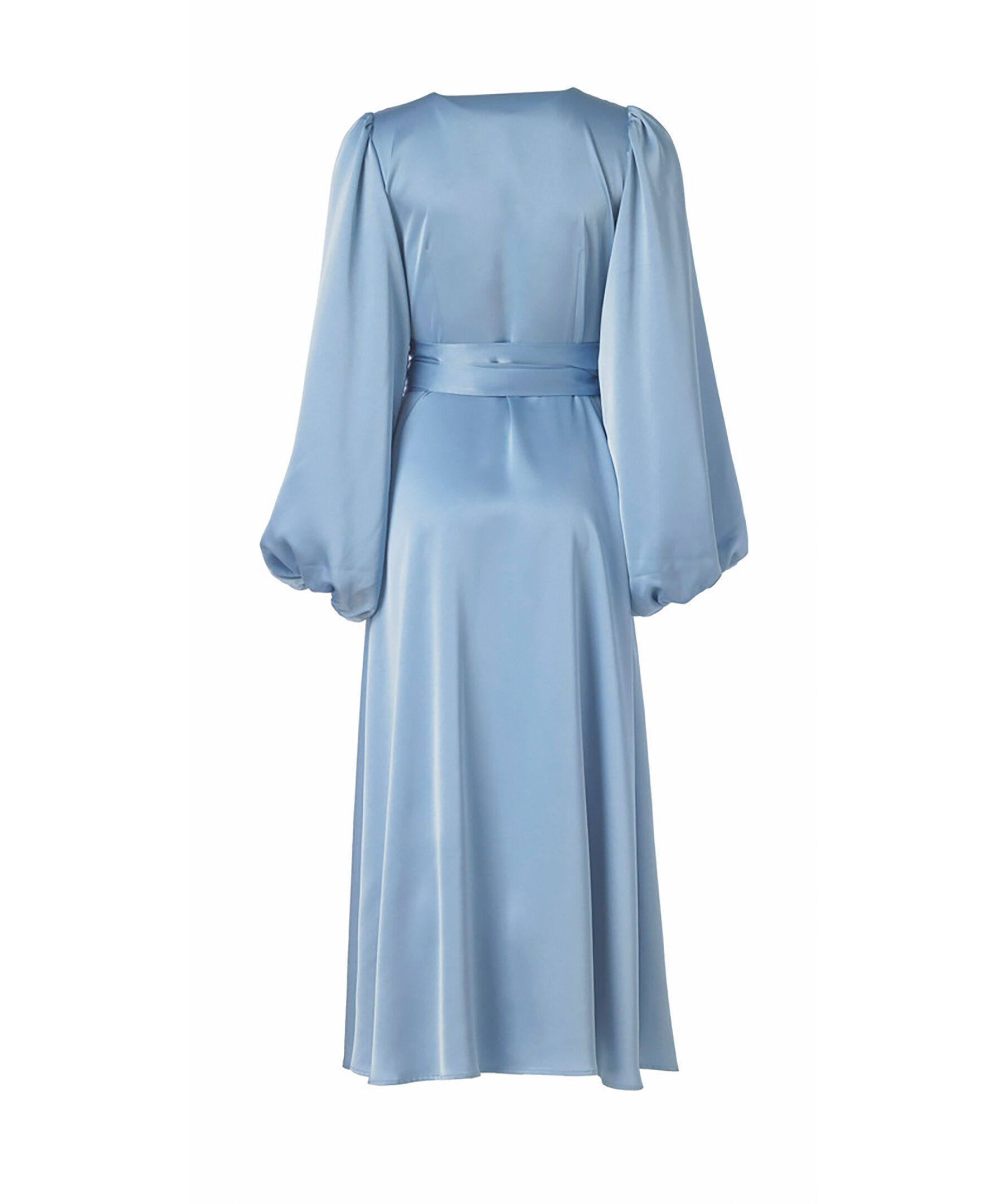 Maxiklänning från Helene Studios är en feminin och sofistikerad klänning i exklusiv satin med en elegant lyster. Den har en smickrande omlottöverdel med V-ringning och knytbälte i midjan som framhäver silhuetten. De långa, voluminösa ärmarna ger ett modernt uttryck, medan den långa kjolen faller mjukt och elegant.