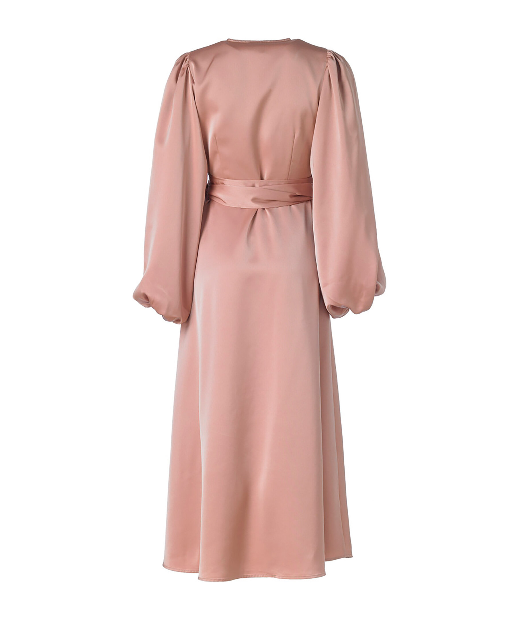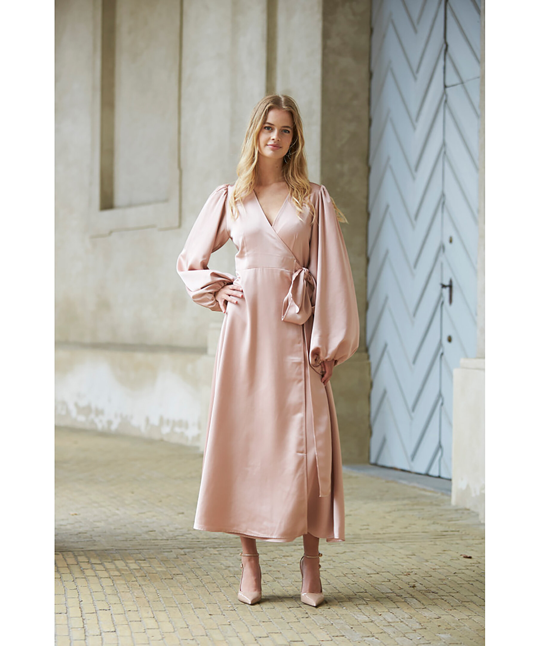 Maxiklänning från Helene Studios är en feminin och sofistikerad klänning i exklusiv satin med en elegant lyster. Den har en smickrande omlottöverdel med V-ringning och knytbälte i midjan som framhäver silhuetten. De långa, voluminösa ärmarna ger ett modernt uttryck, medan den långa kjolen faller mjukt och elegant.
