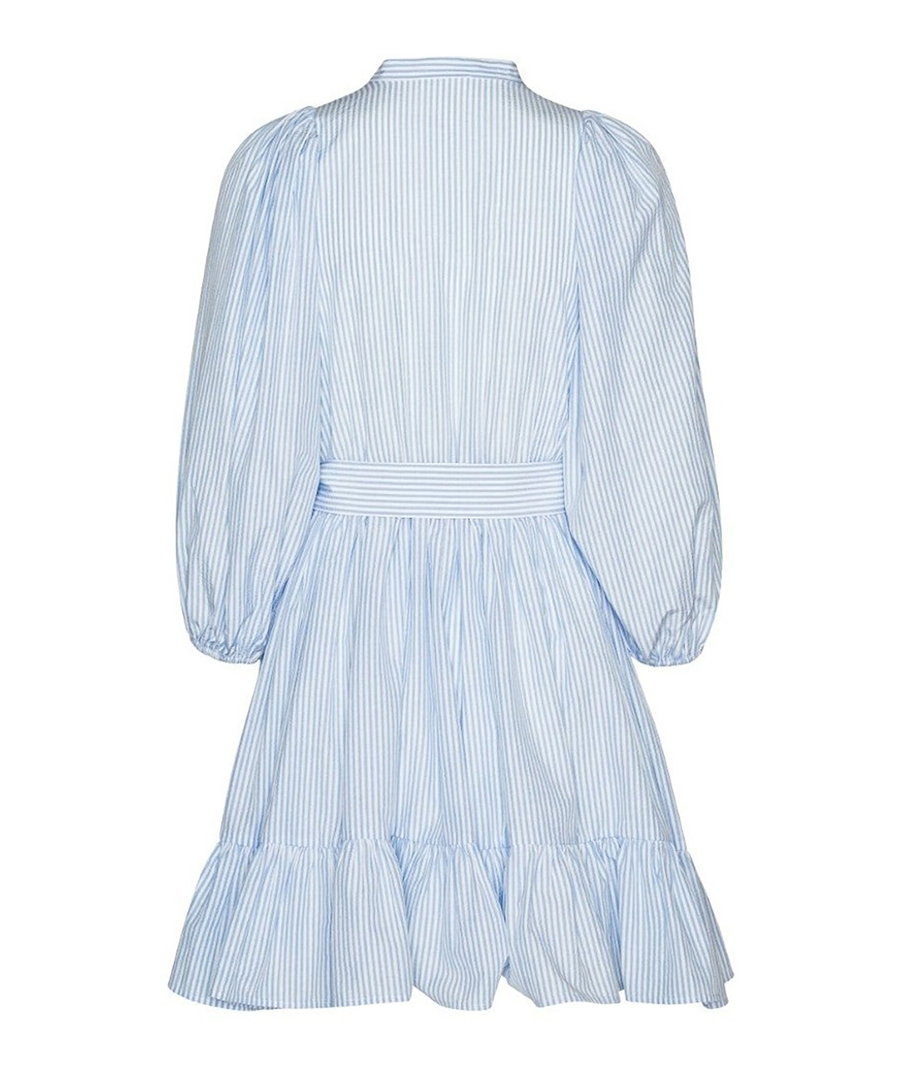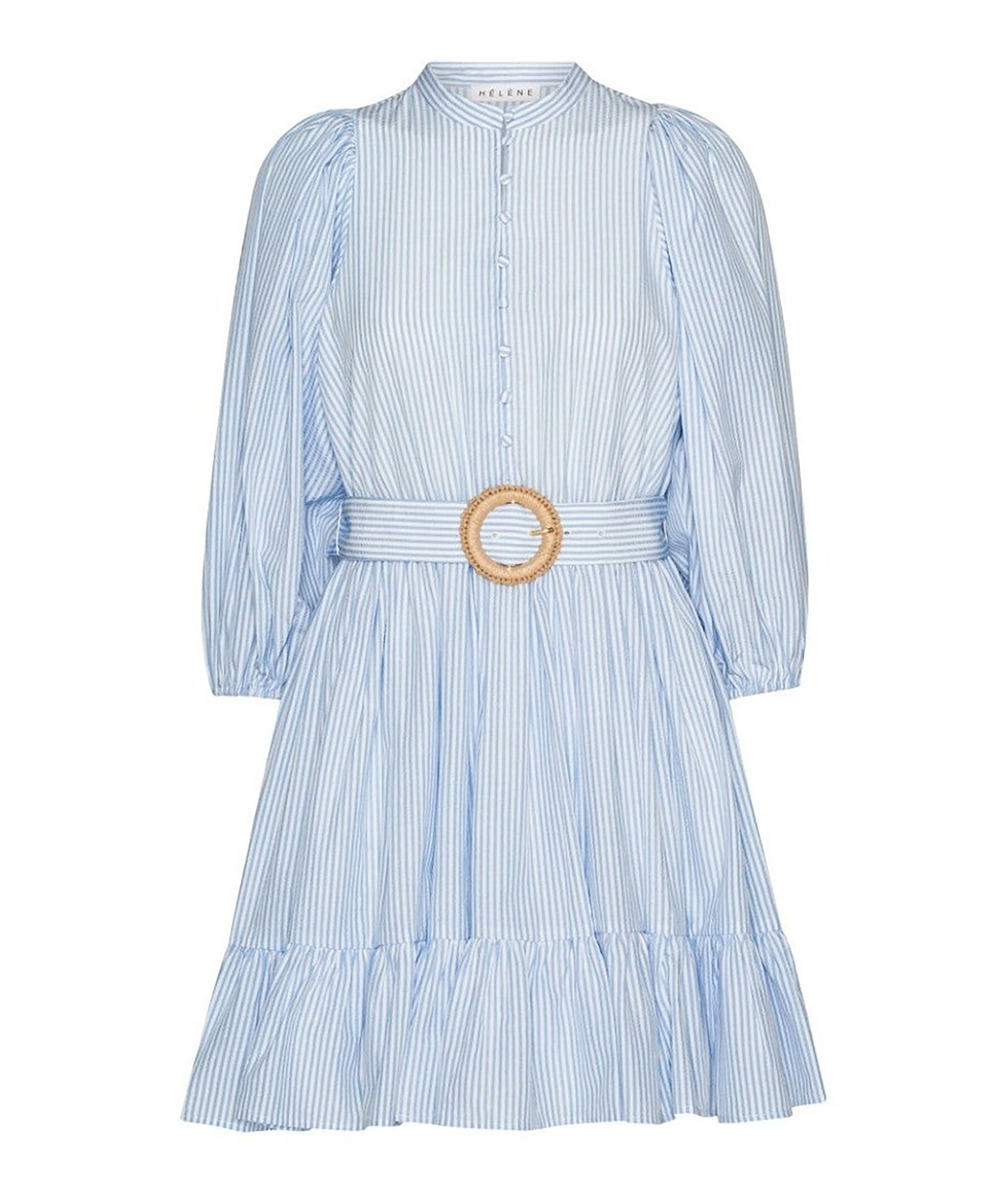 Klänning från Helene Studios som kombinerar klassisk design med moderna detaljer, i vitt med ljusblå ränder. Den har en smickrande passform med markerad midja, brett bälte och ett runt spänne i naturfärgat flätat material, medan det lätta tyget ger en luftig silhuett med volym i kjolen och en mjuk volang nedtill. Klänningen har en ståkrage med knäppning framtill och korta, vida ärmar med lätt puff för ett sofistikerat uttryck, och den korta längden gör den perfekt för både vår- och sommarsäsong.