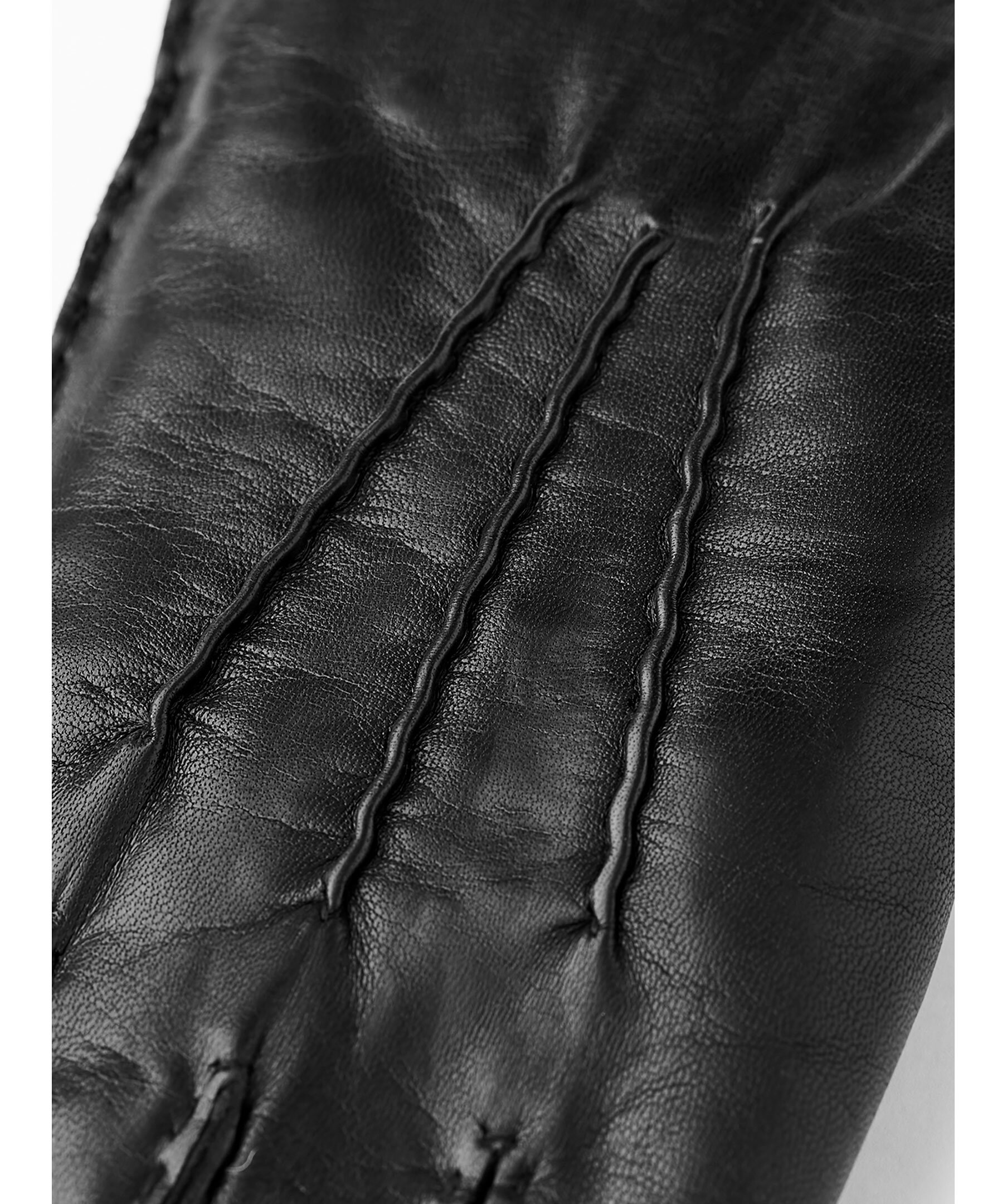 Svarta läderhandskar från Hestra. Handskarna är gjorda i italiensk lammnappa med fin följsamhet och lyster, foder i mjukt lurvig lammpäls samt logotyp och denta på handskens ovansida.