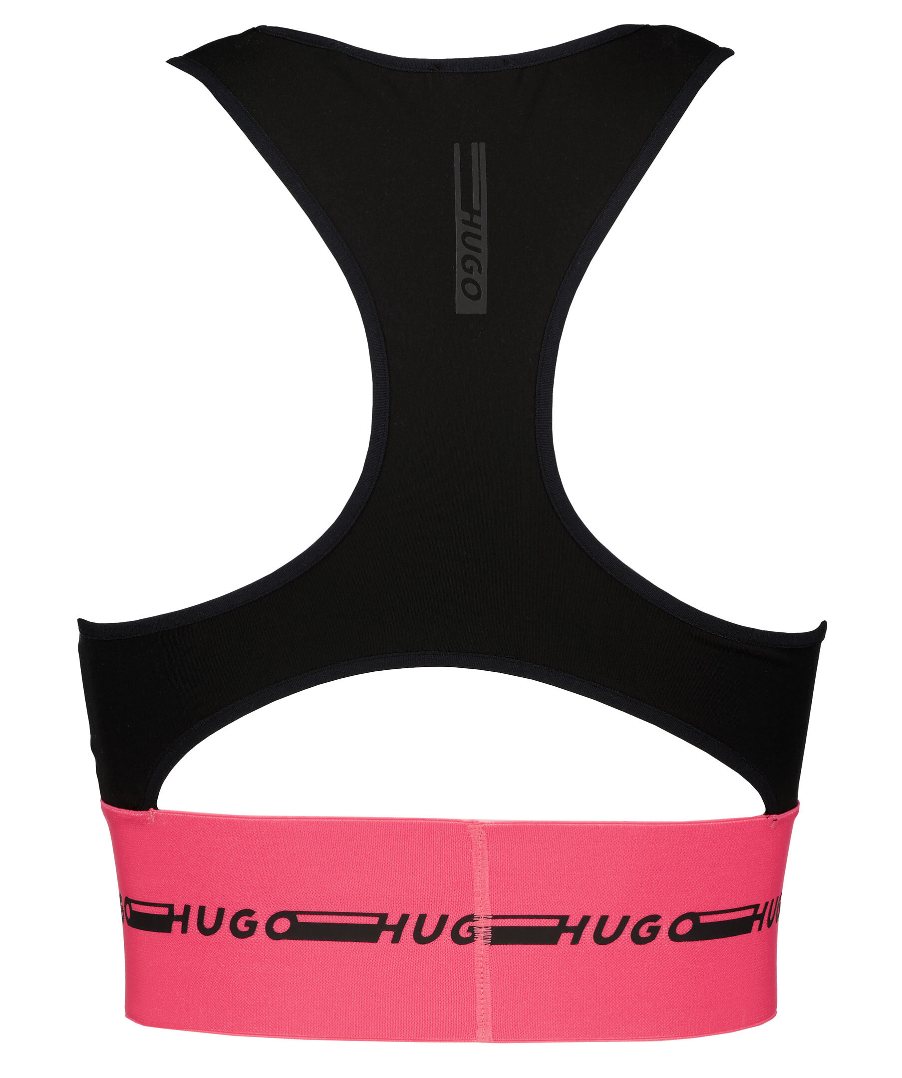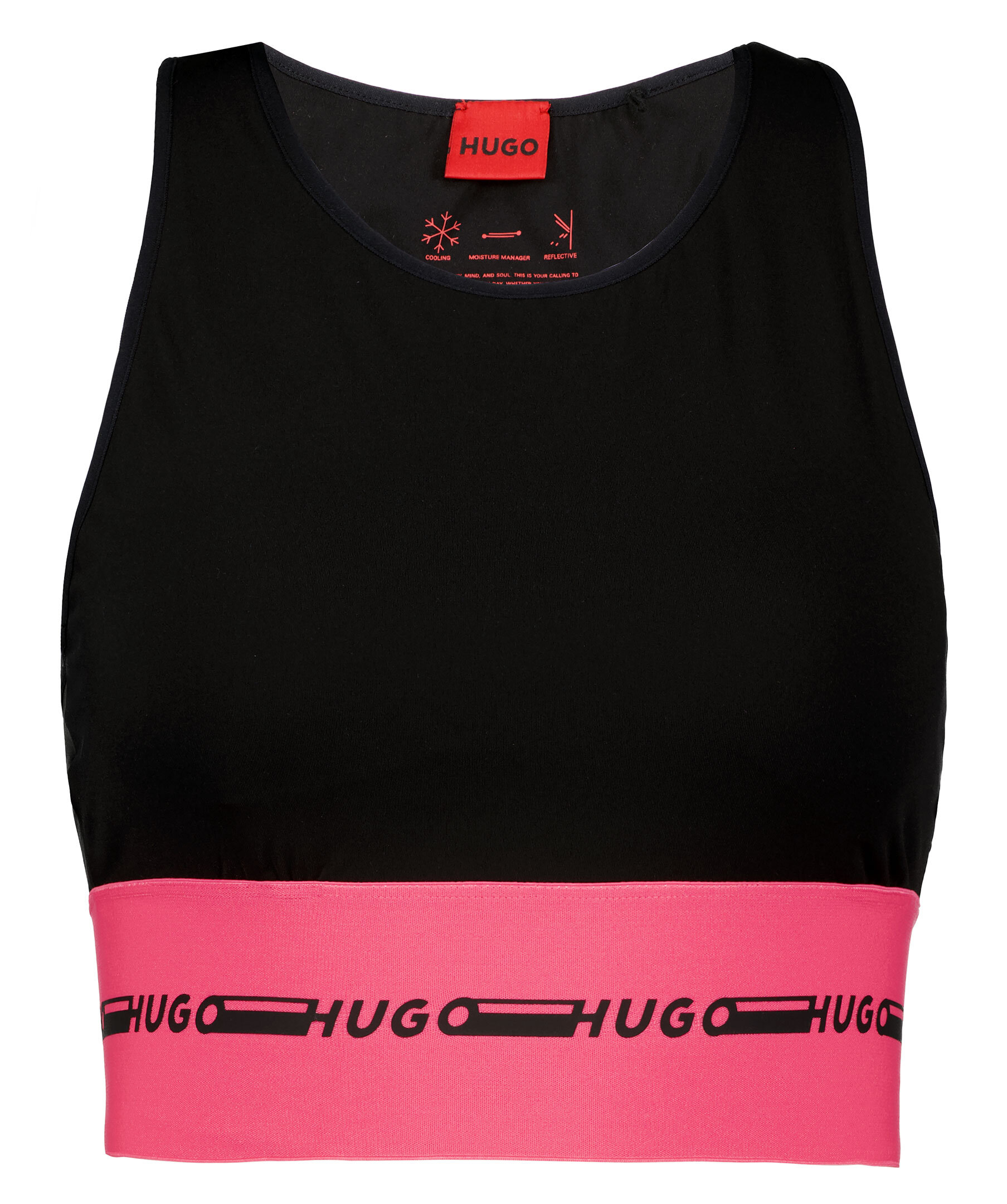 Svart Sporttopp från HUGO Women. Lättvadderad. Bred Rosa resår med tryckt logotyp vid plaggslut. Cut out detalj i ryggen.