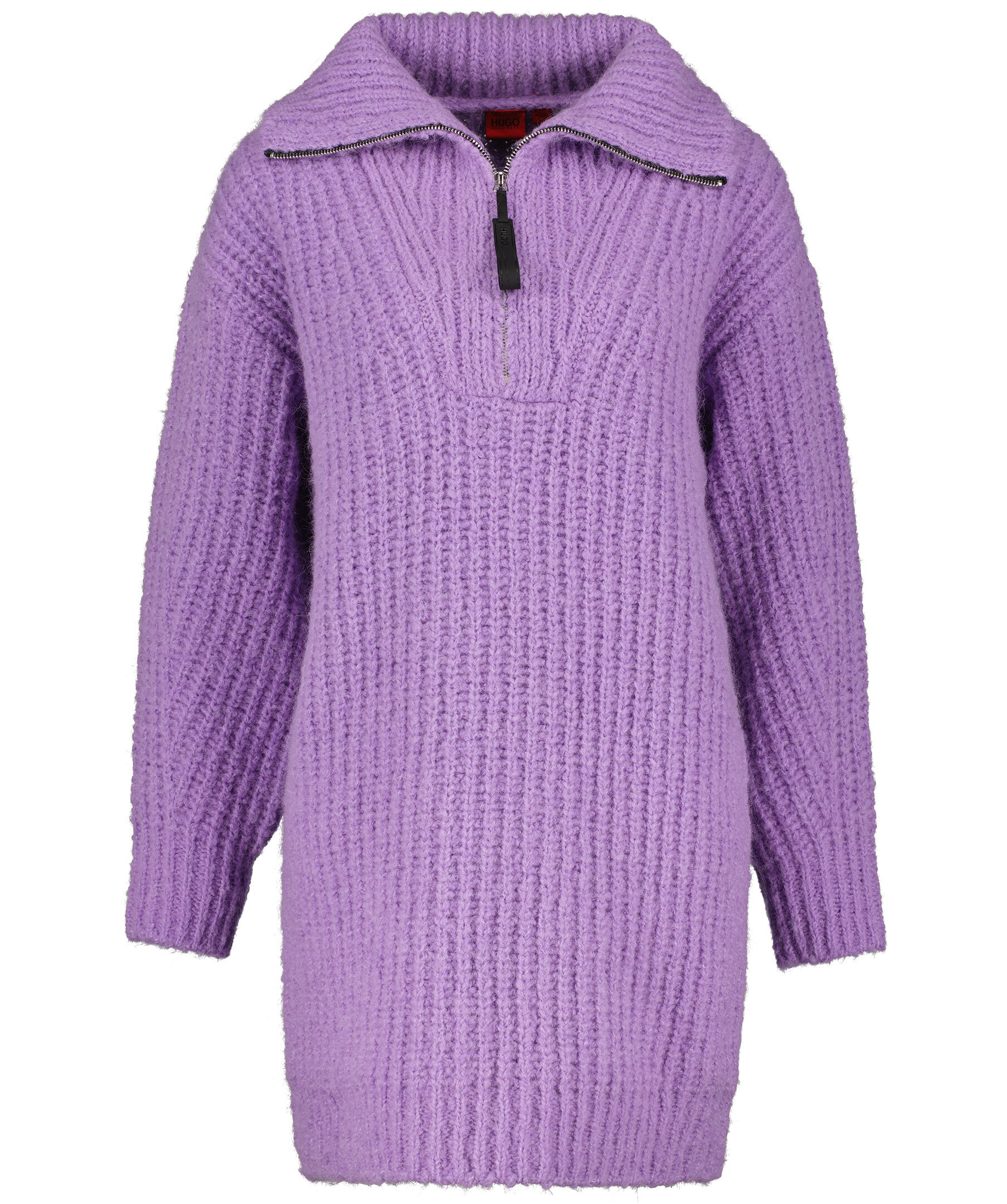 Ljuslila, grovstickad tröja från Hugo, Hugo Boss i längre modell. Tillverkad i akryl och alpackablandning. Tröjan har en avslappnad och överdimensionerad passform. Polokrage med silverfärgad dragkedja som har en svart flärp med liten logga på att dra ner dragkedjan med.
