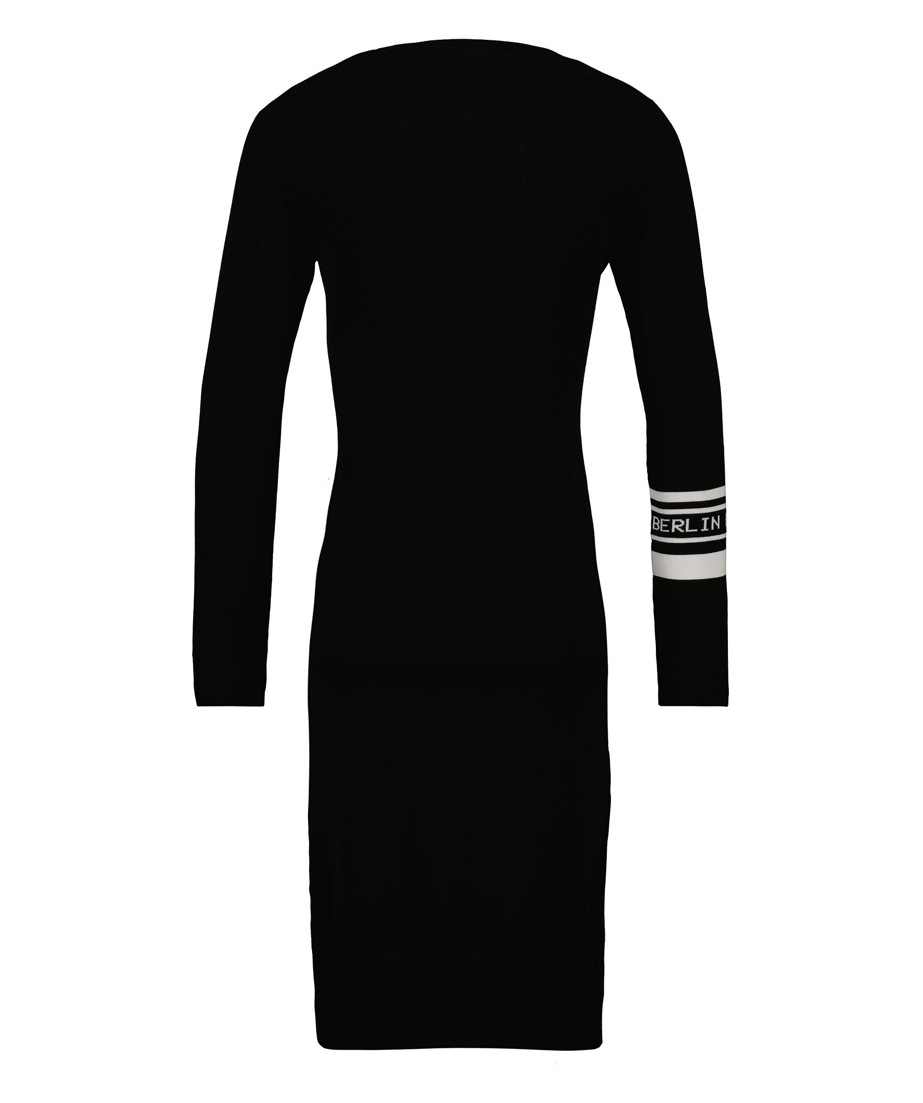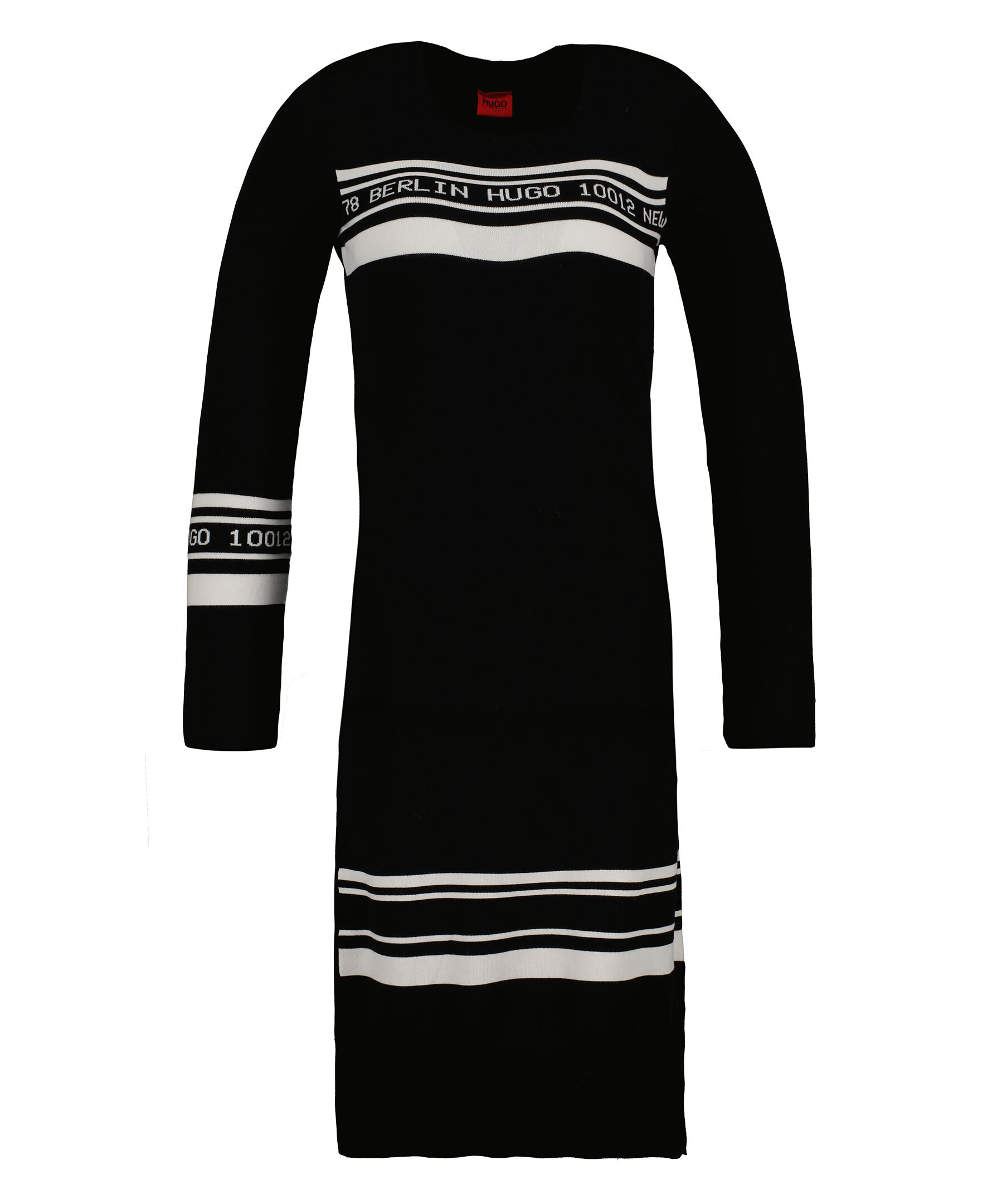 Svart finstickad lång tröja från Hugo. Stickade ränder i vitt med logotyp över bröstet, ärmarna och vid plaggslut. Ribbstickade muddar i ärm- och plaggslut, tumhål vid ärmslut. Tillverkad i viskos blandning.