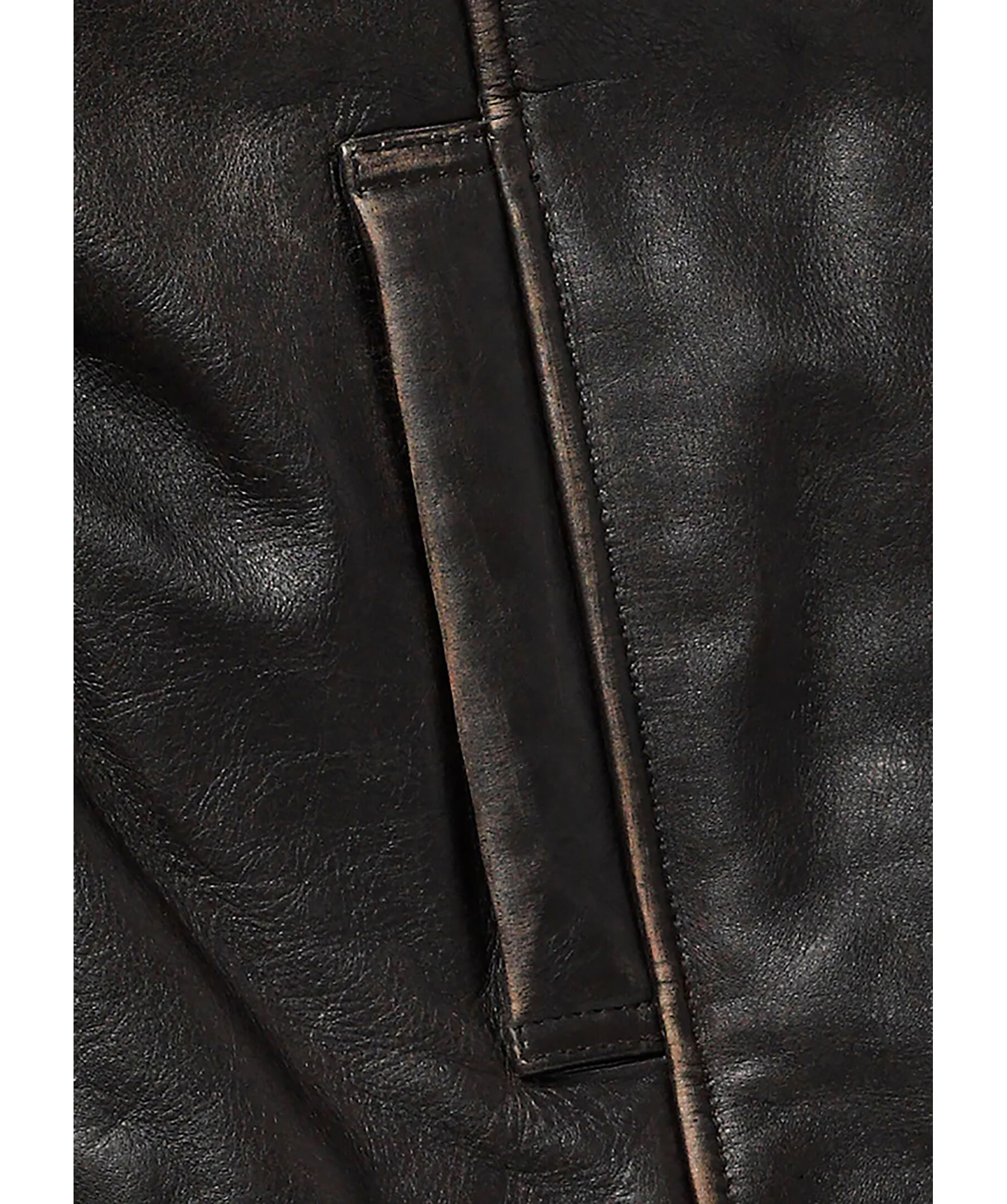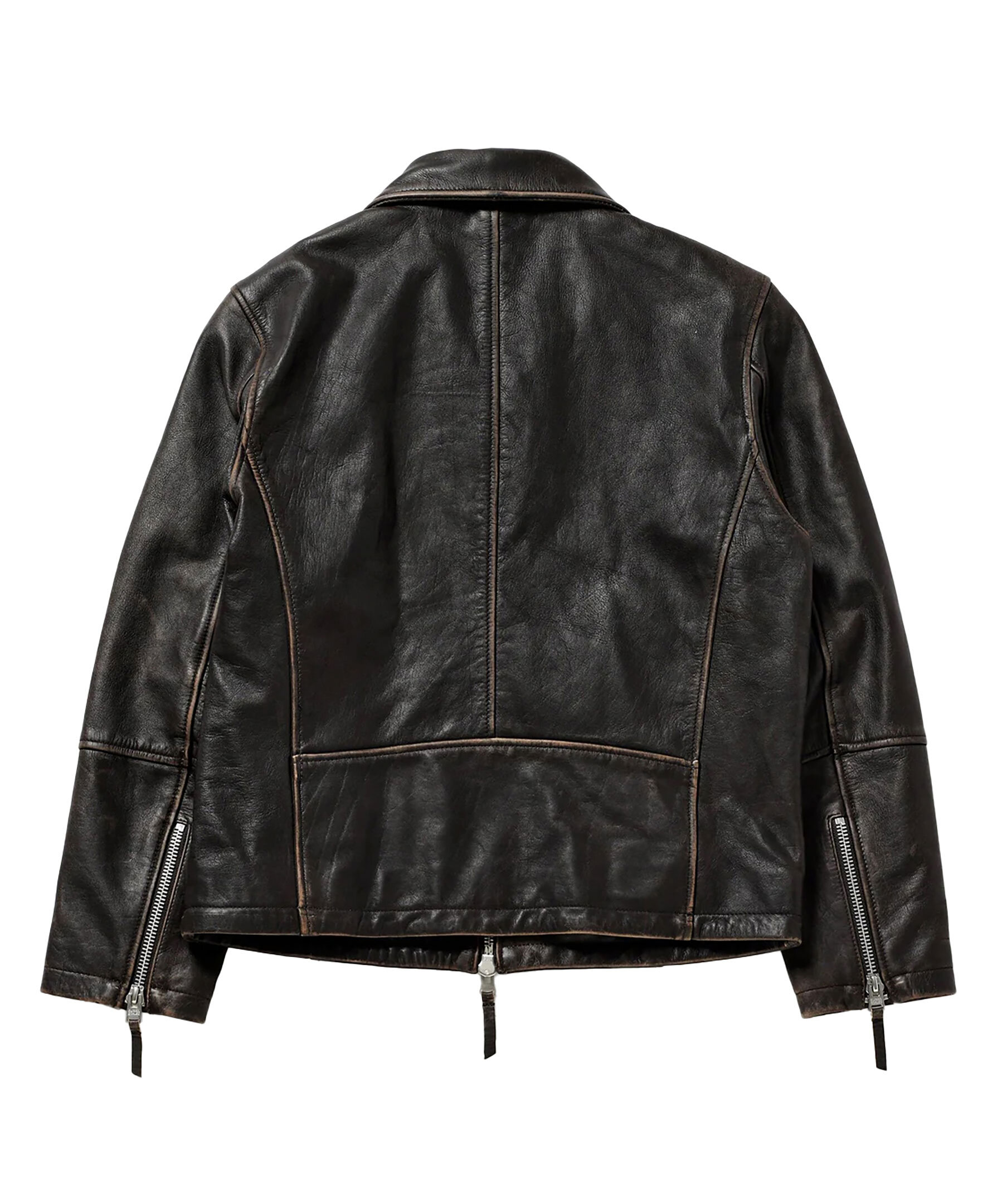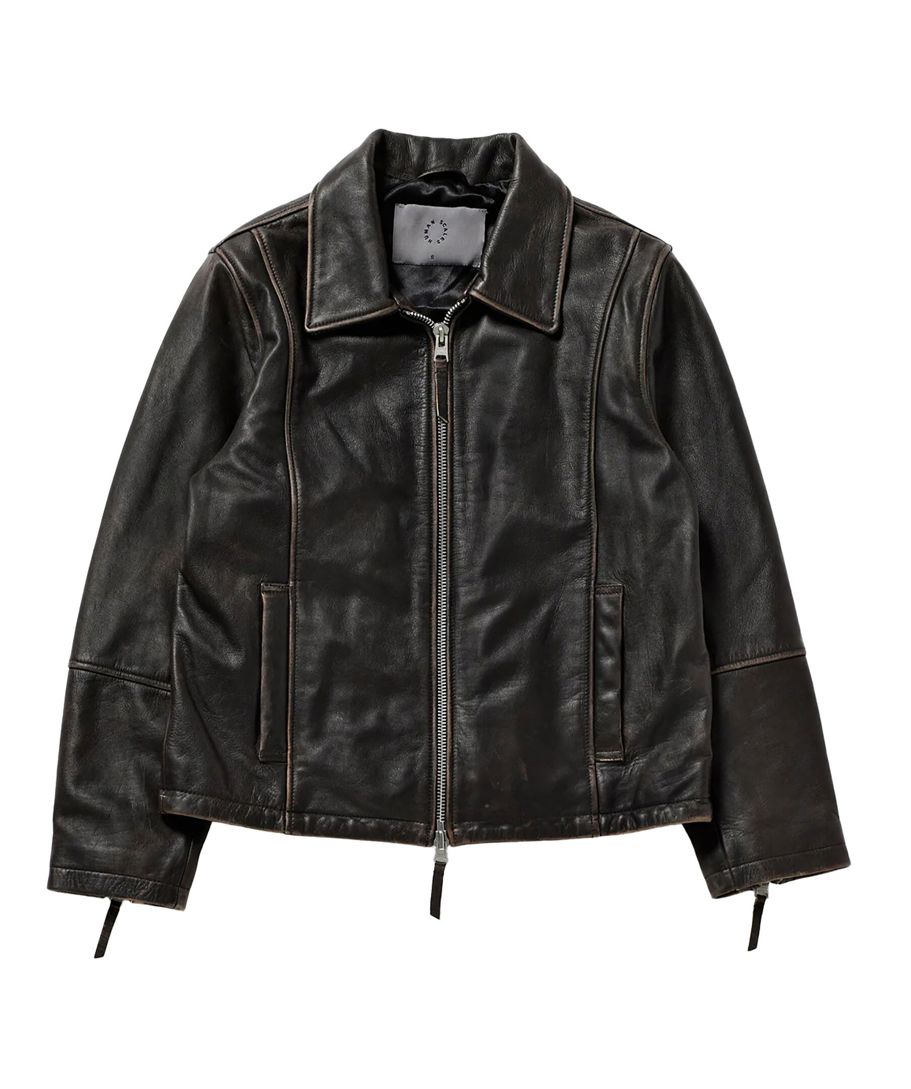 Svart, kort läderjacka från Human Scales. Jackan stängs med tvåvägsdragkedja och bruna slitna detaljer i kanterna. Två öppna sidfickor och dragkedjedetaljer vid ärmslut. Tillverkad i läder.