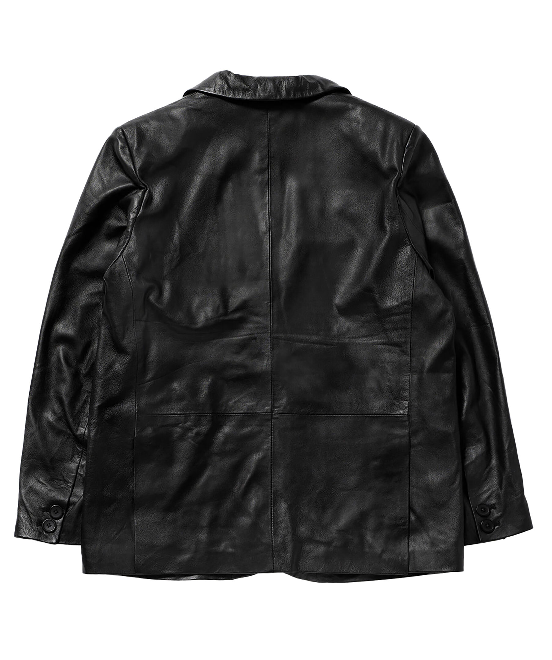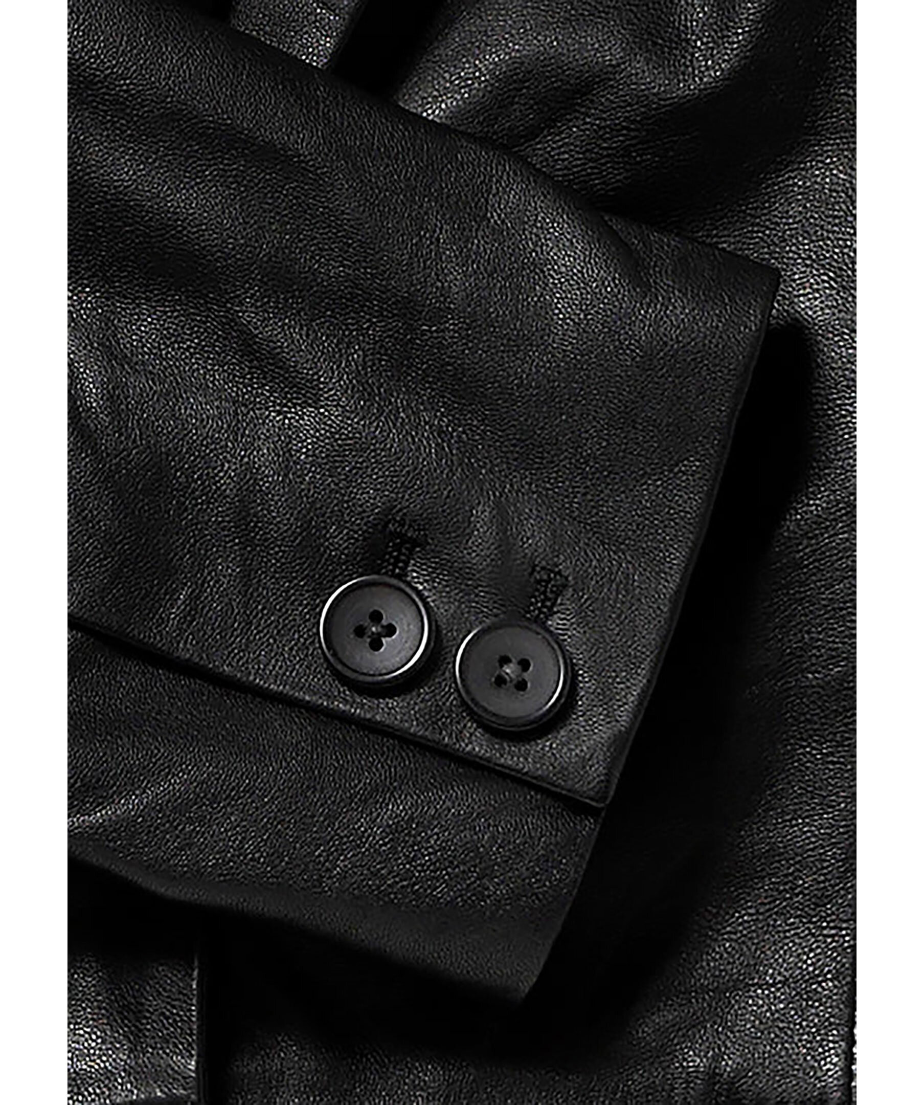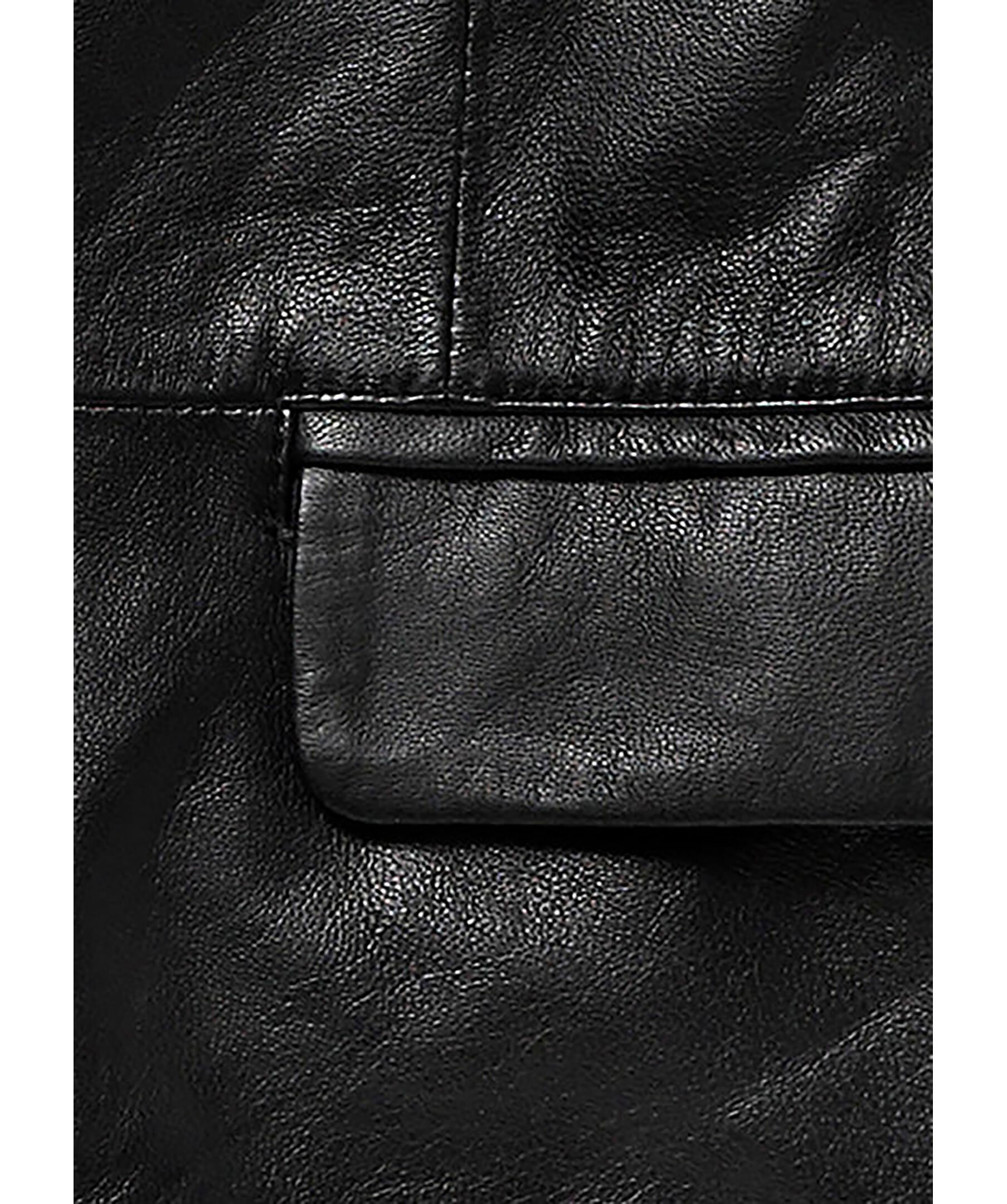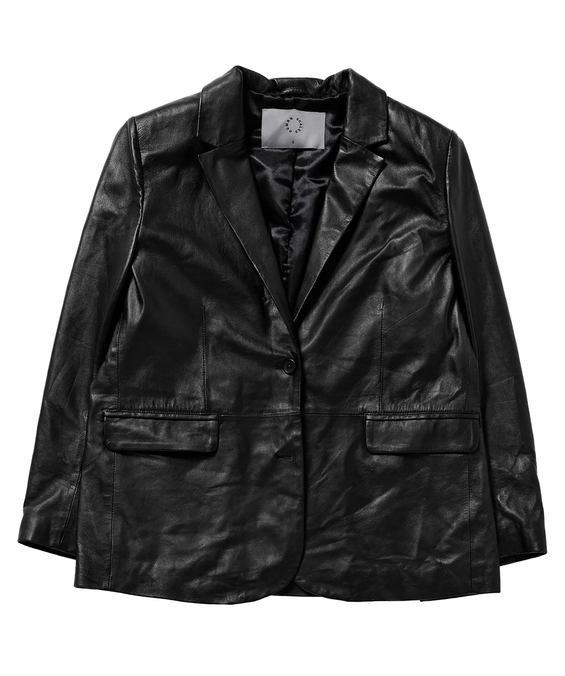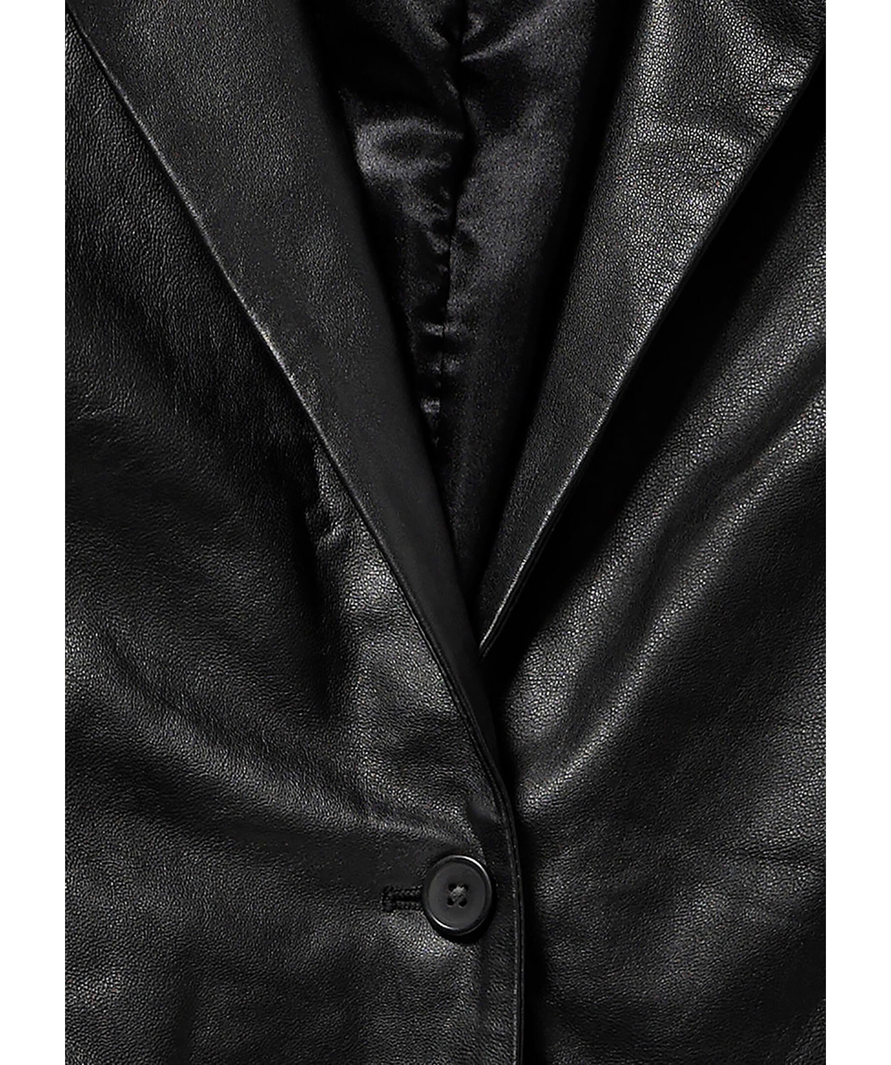 Svart läder blazer från Human Scales. Jackan har en oversized passform, en insida av svart satin, stängs med knappar och har fickor med lock. Tillverkad av läder.