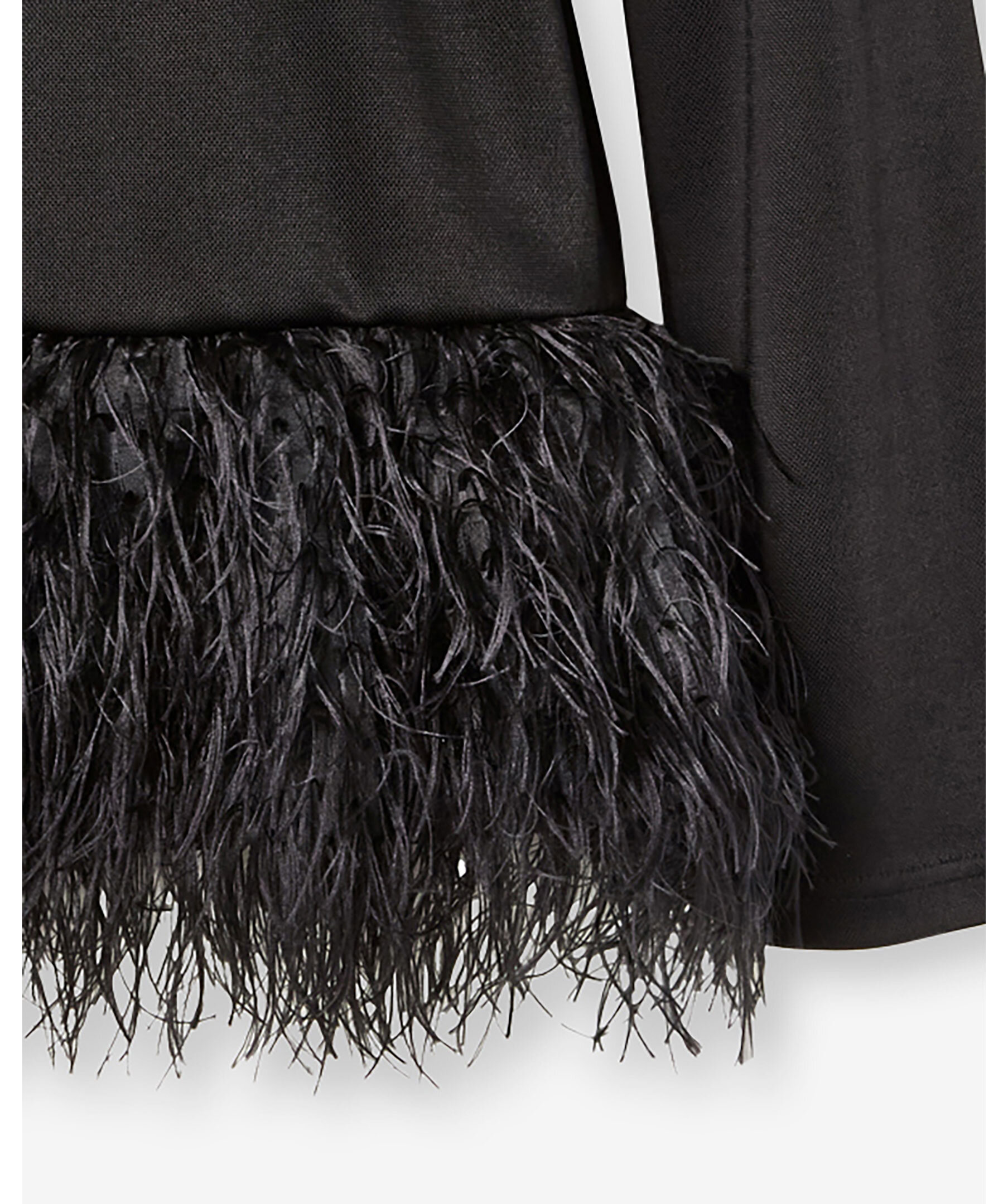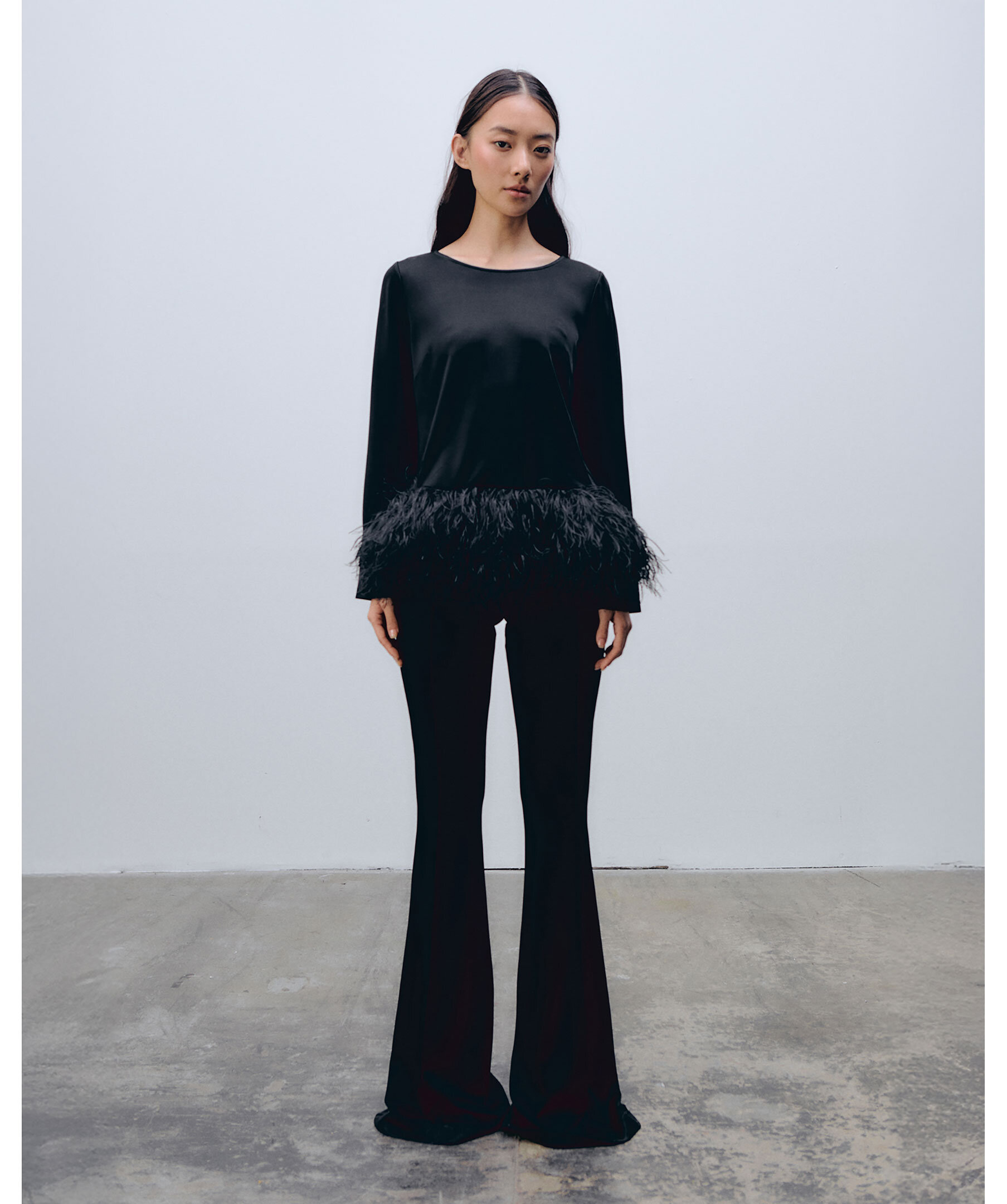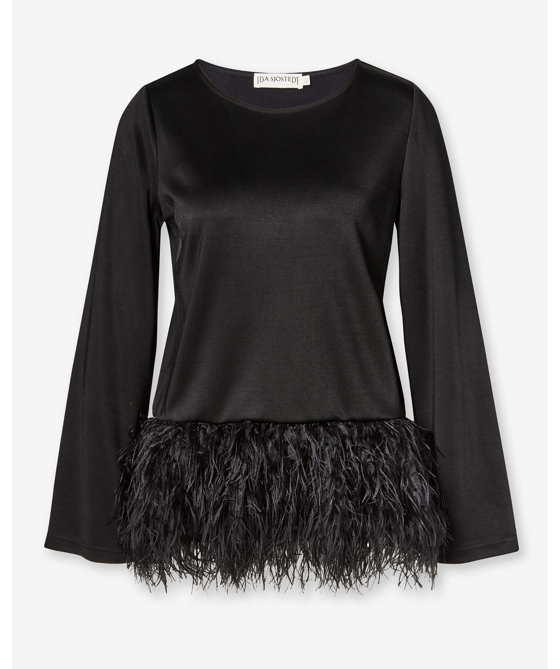 Svart, långärmad topp med en fjäderliknande fåll från Ida Sjöstedt. Toppen har rundad halsringning. Tillverkad i en rayon- och polyesterblandning.