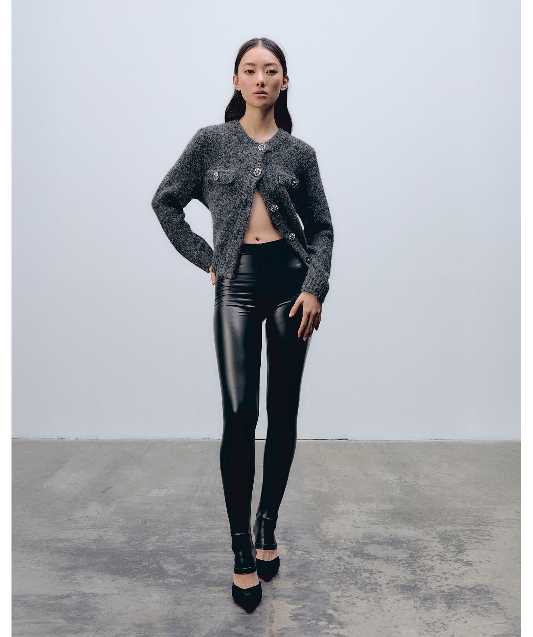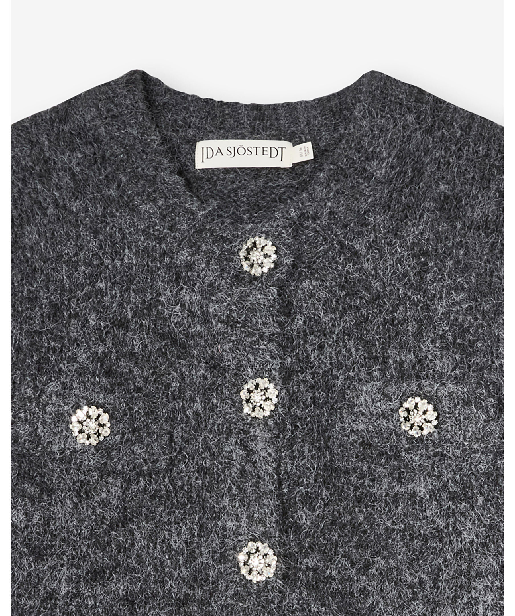 Mörkgrå stickad kofta från Ida Sjöstedt. Stickad av ett mjukt, texturerat garn, erbjuder denna kofta en mysig men ändå lätt känsla. Med bröstfickor och ribbade kanter är den perfekt att bära över allt från enkla t-shirts till böljande klänningar. Den har en rundad halsringning och stängs med kristallknappar. Tillverkad i en ull- och polyesterblandning.