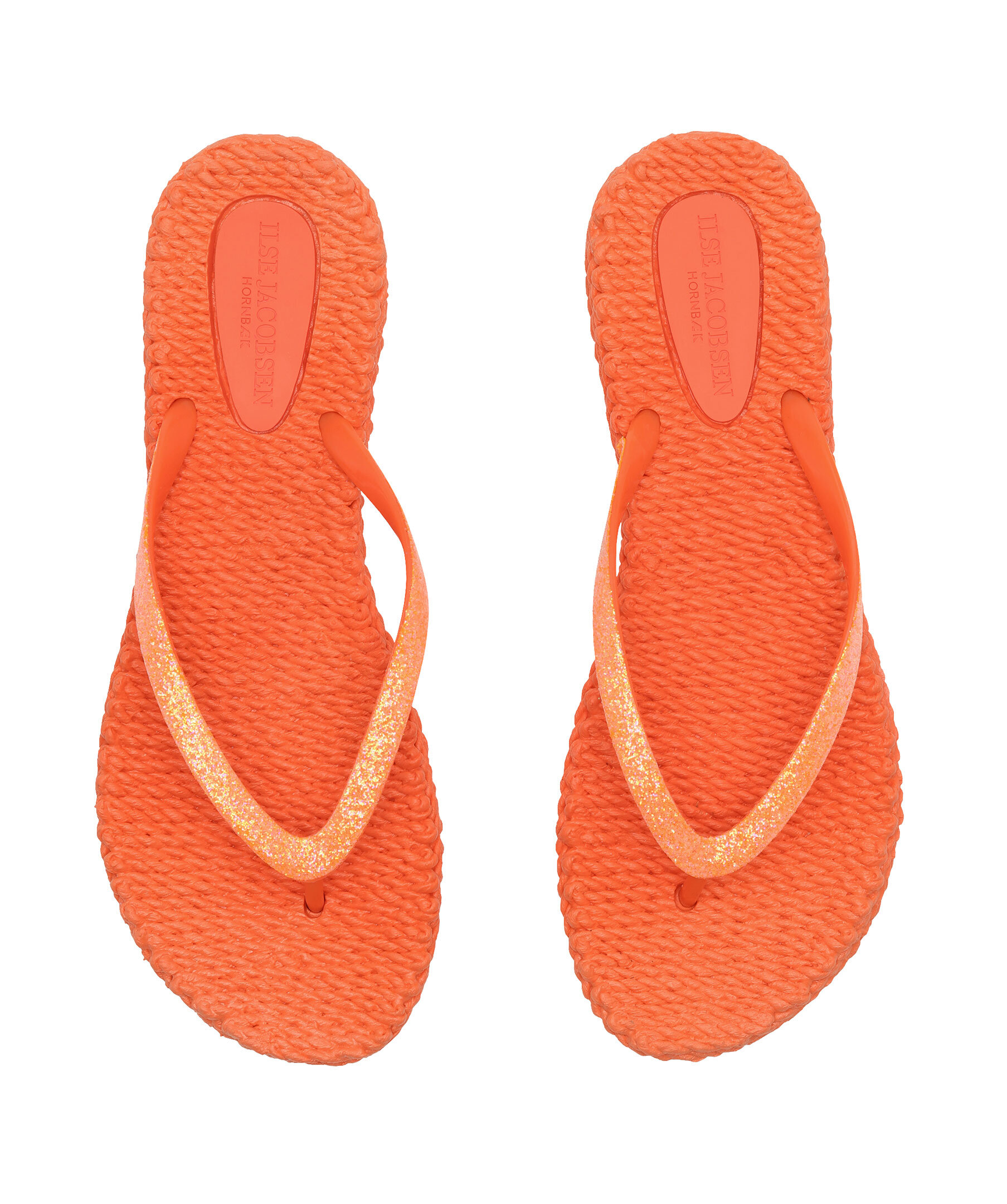 Flip flops från ILSE JACOBSEN i en härlig orange färg. Tillverkade av lätt och flexibel luftrubber. Den strukturerade sulan ger en skön massageeffekt. Glitterdekorerad rem. Perfekta för strandpromenader och somriga tillfällen.