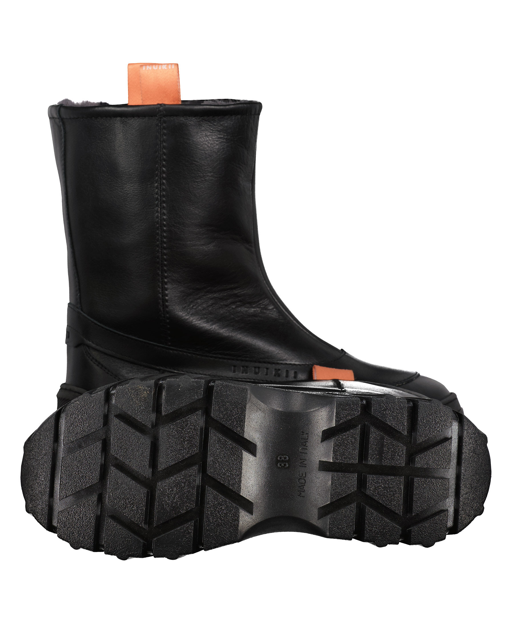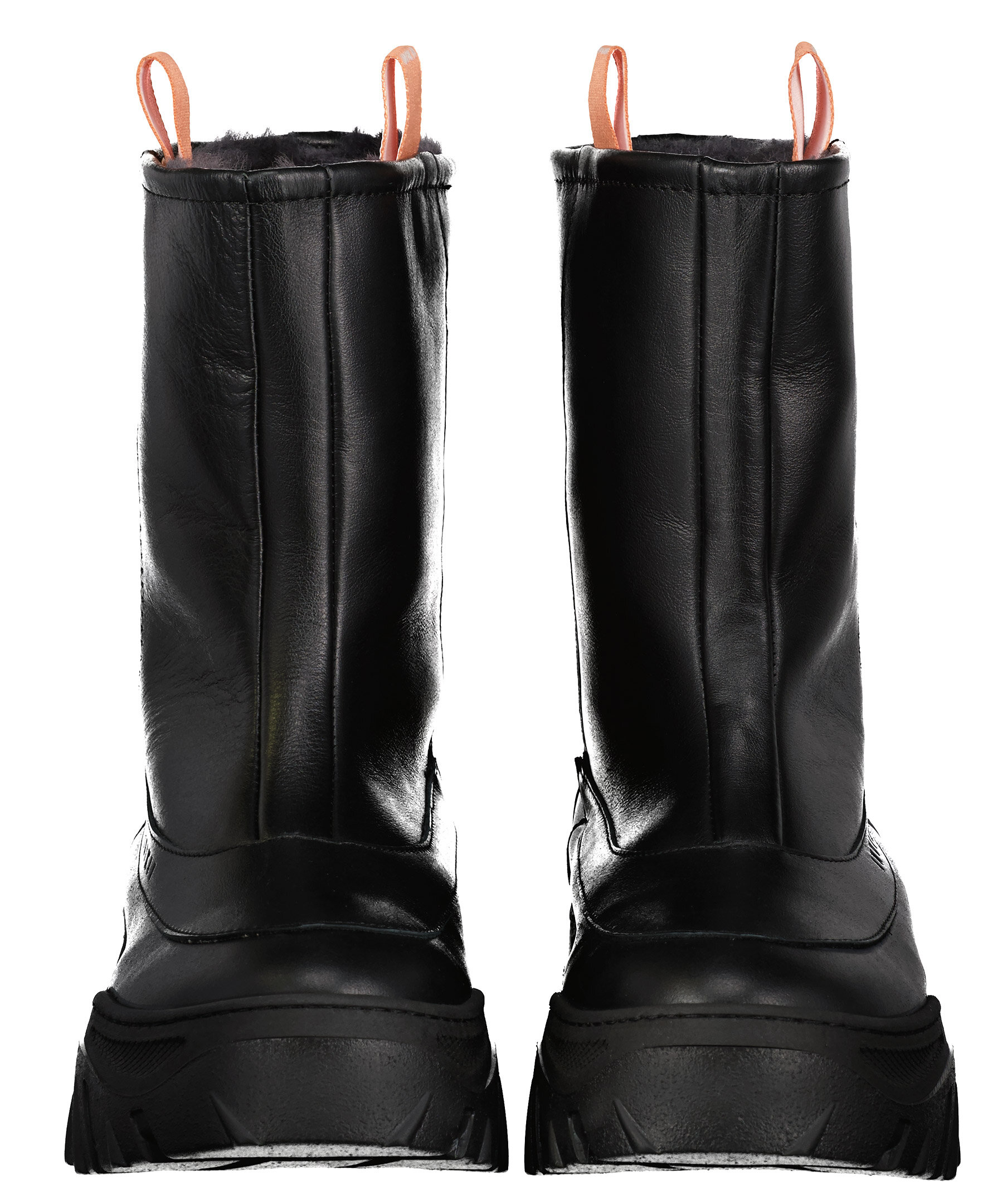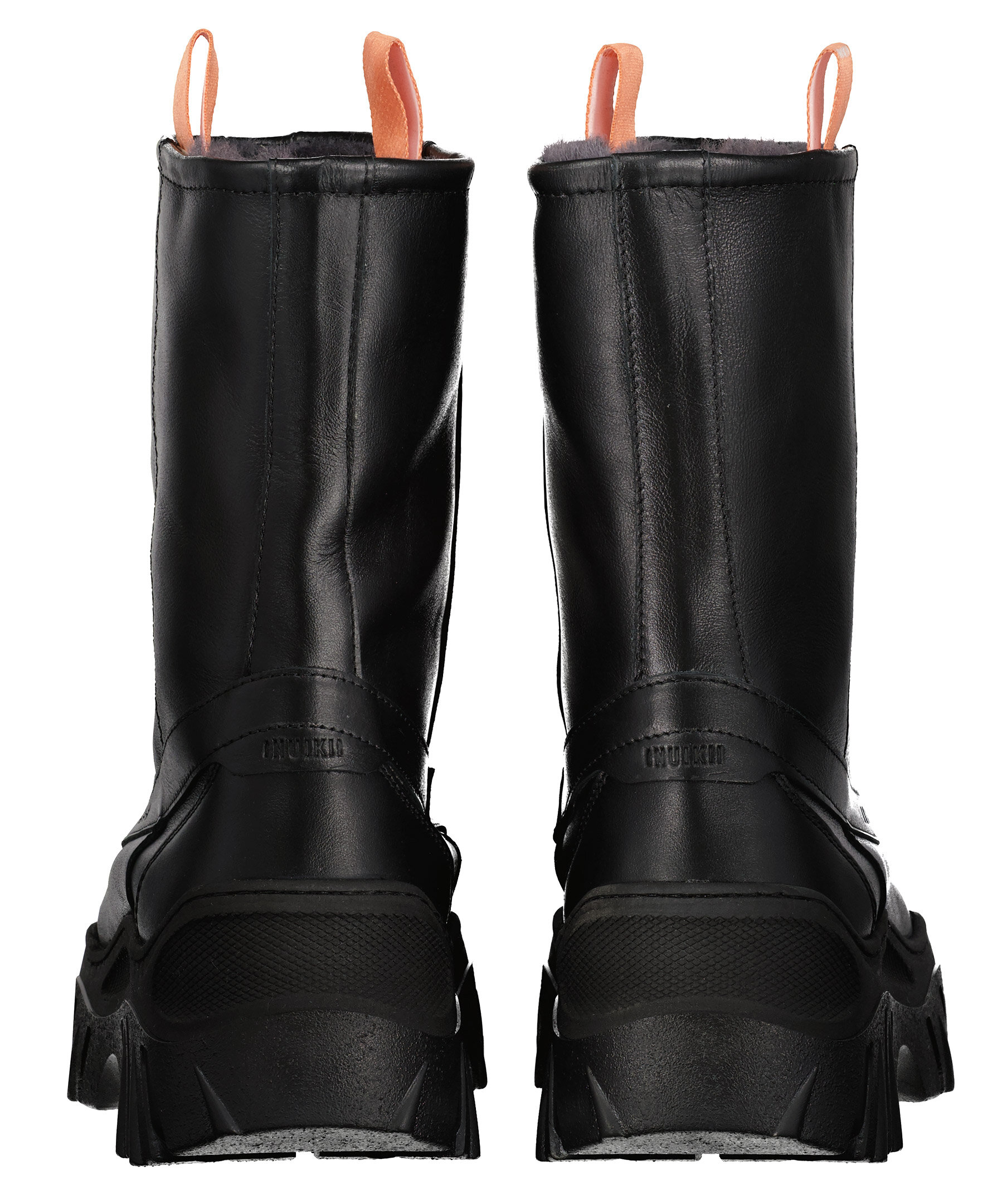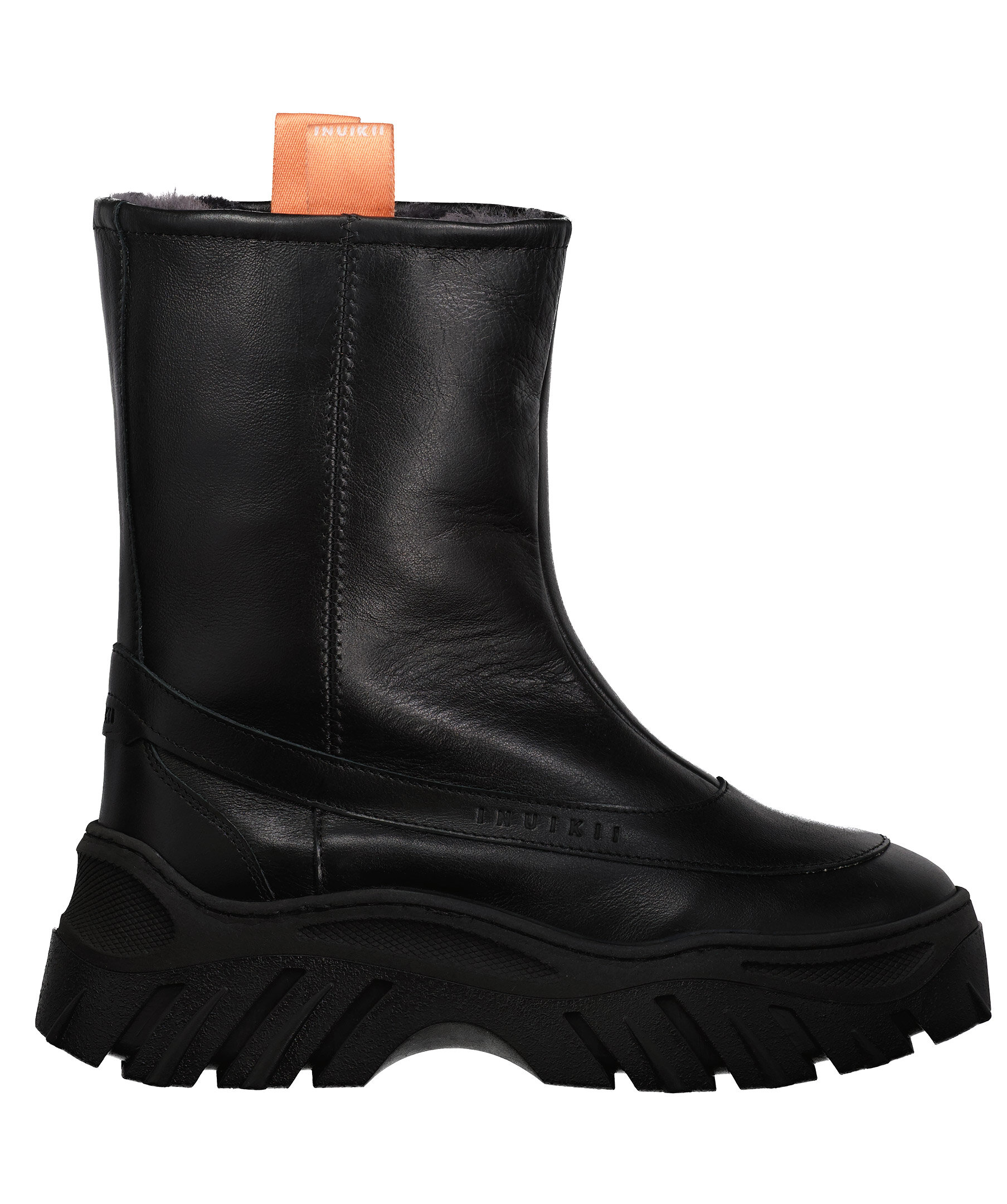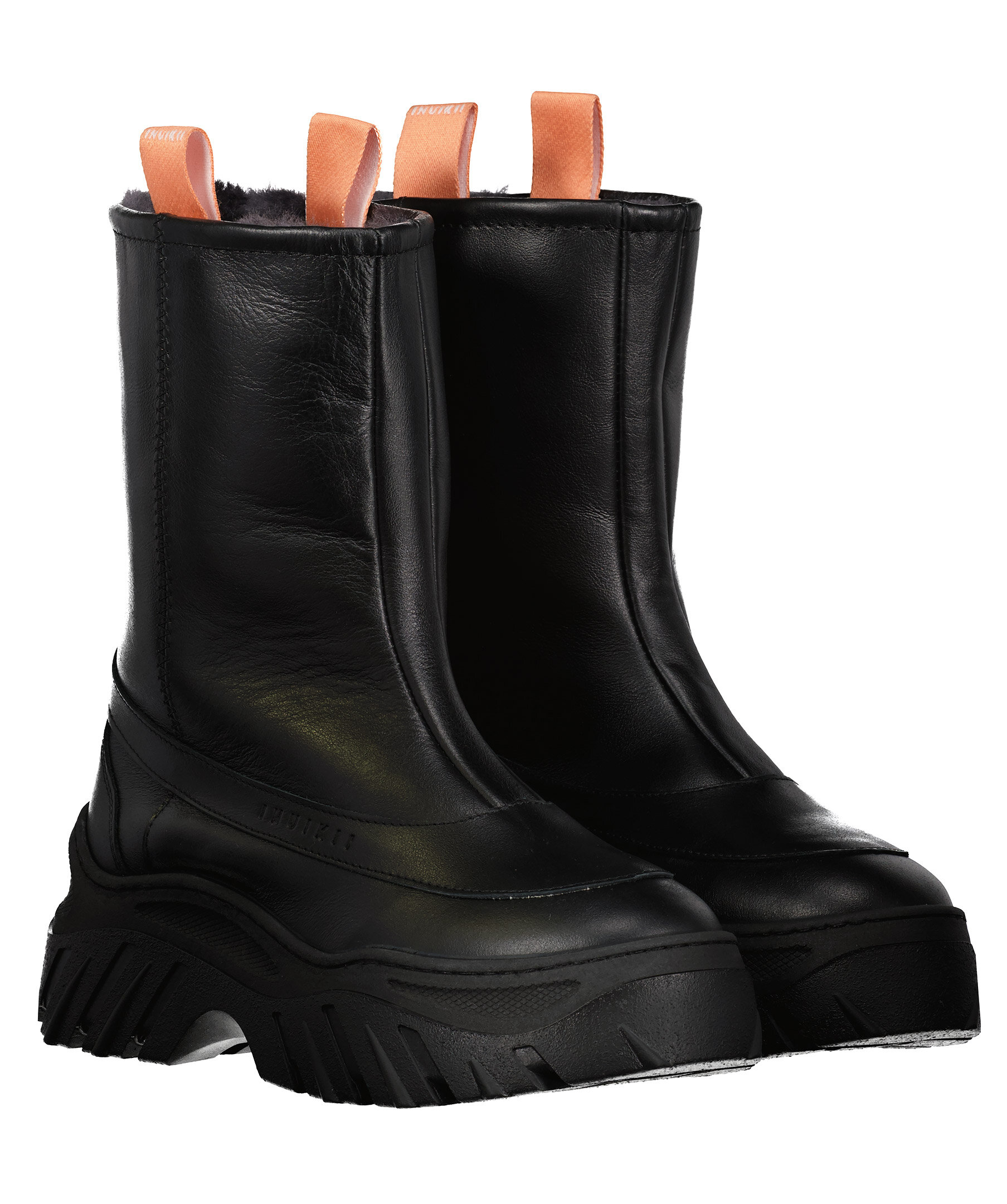 Svarta läder boots från Inuikii. Fodrad med konstpäls. Grövre platåsula. Korallfärgade öglor på sidorna av skaftet. Stansad logotyp på skons yttersidan.