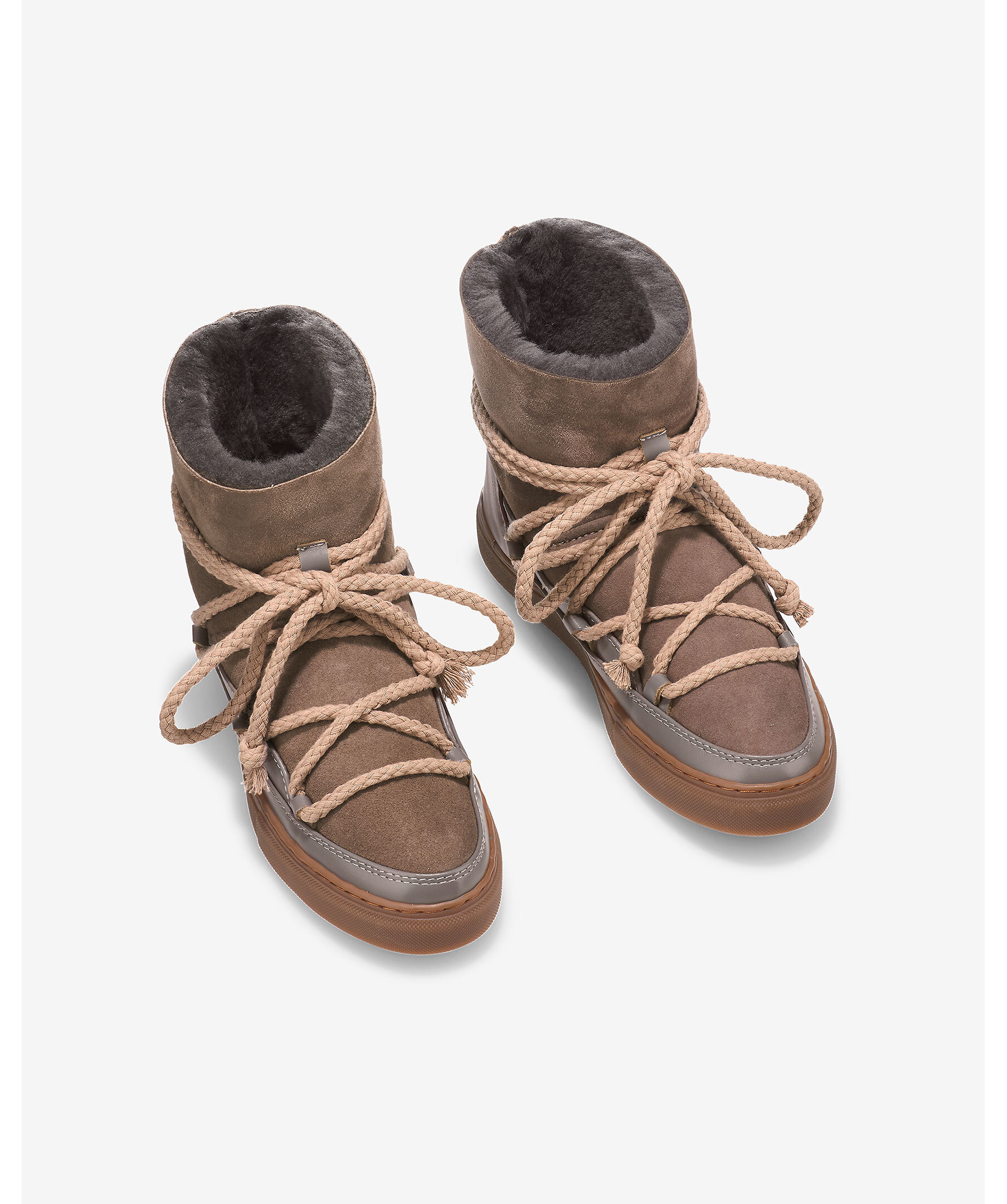 Mullvadsfärgade, varmfodrade skor från Inuikii. Foder och yttermaterial i fårskinn och detaljer i läder. Sula i gummi. Rundad tå samt snörning fram. Broderad logotyp bak på hälen.