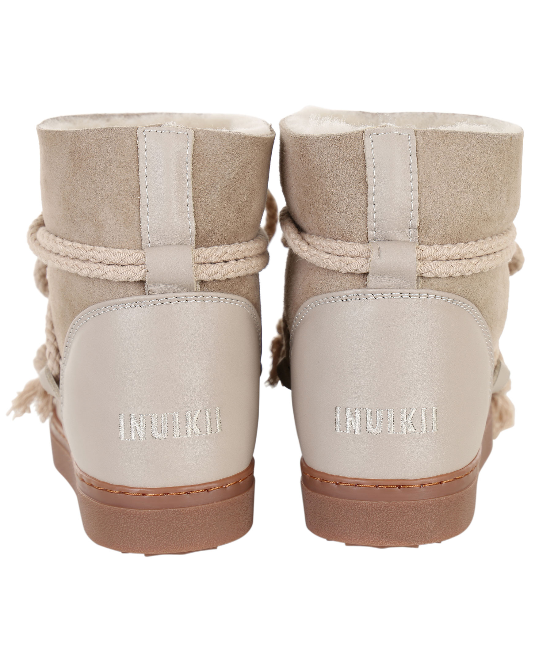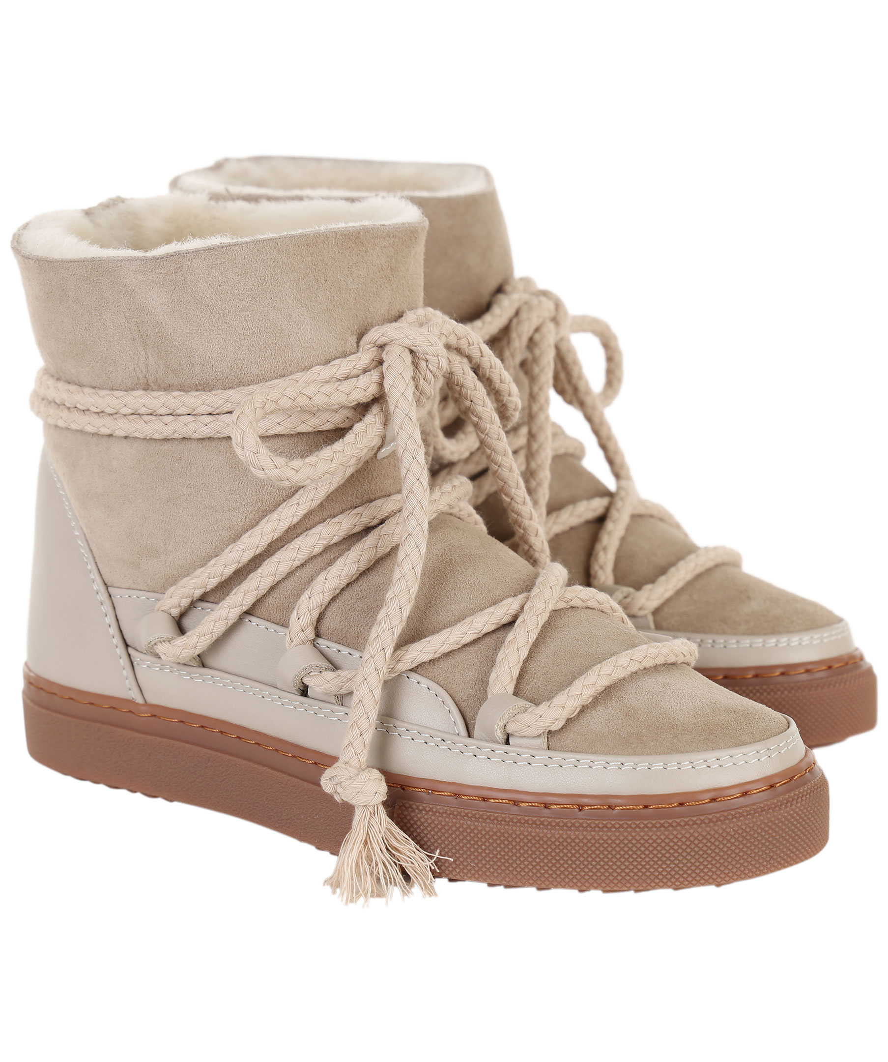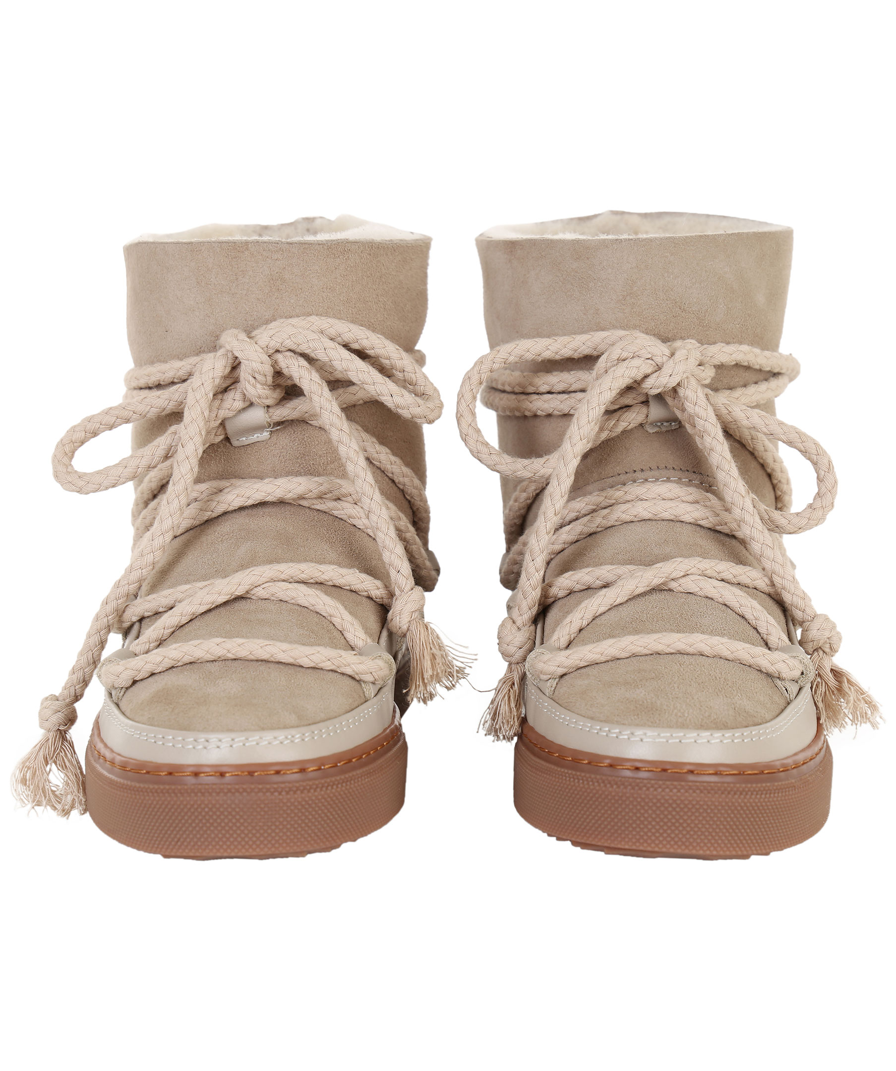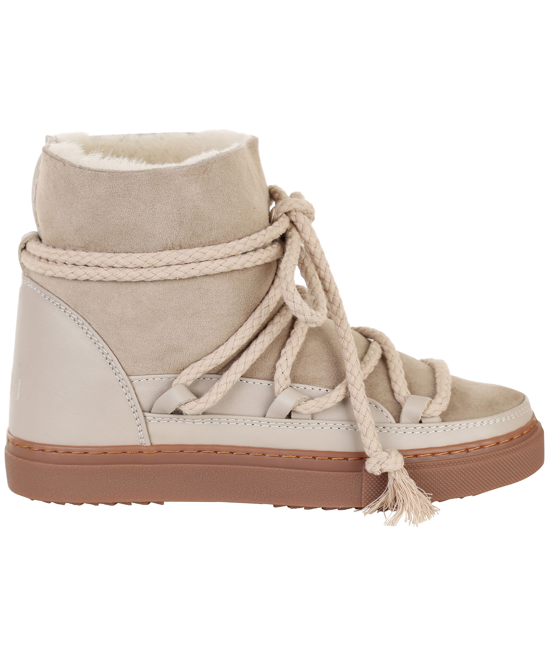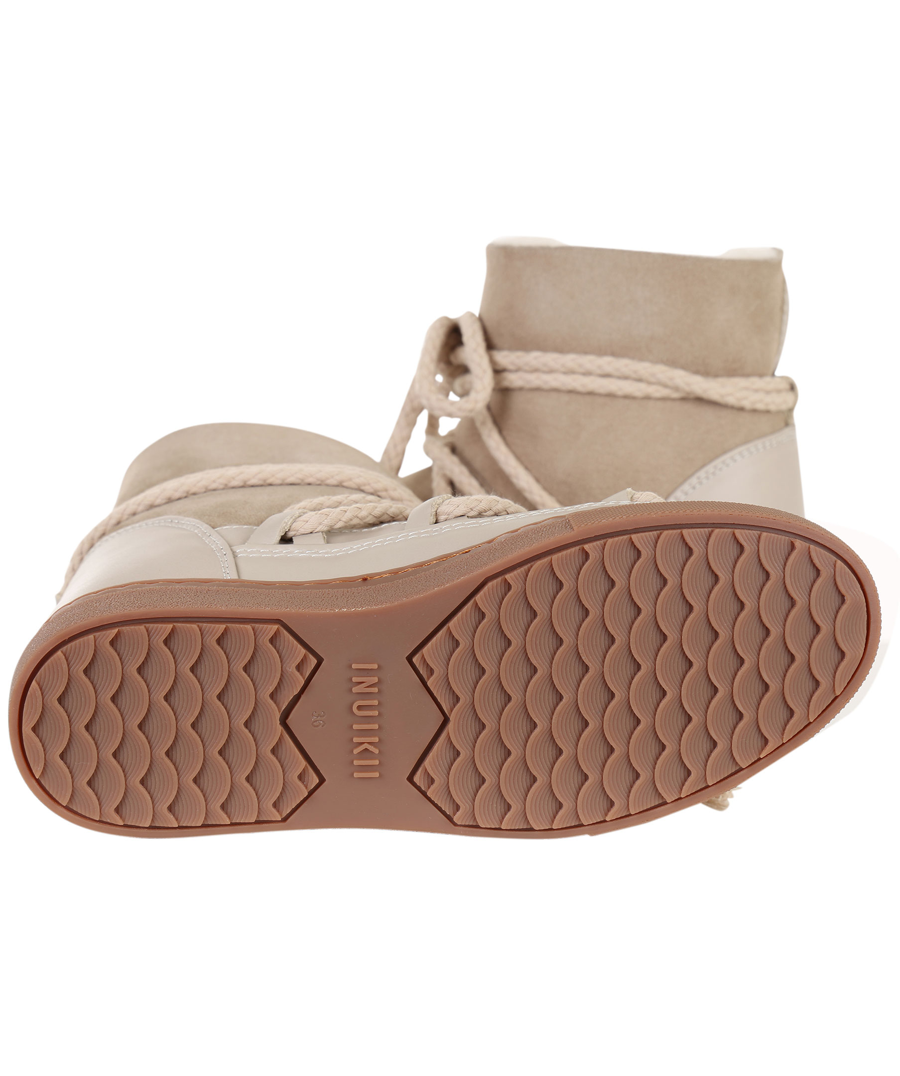 Beigea, varmfodrade skor från Inuikii. Foder i fårskinn, detaljer i läder och sula i gummi. Rundad tå samt snörning fram. Broderad logotyp bak på hälen.