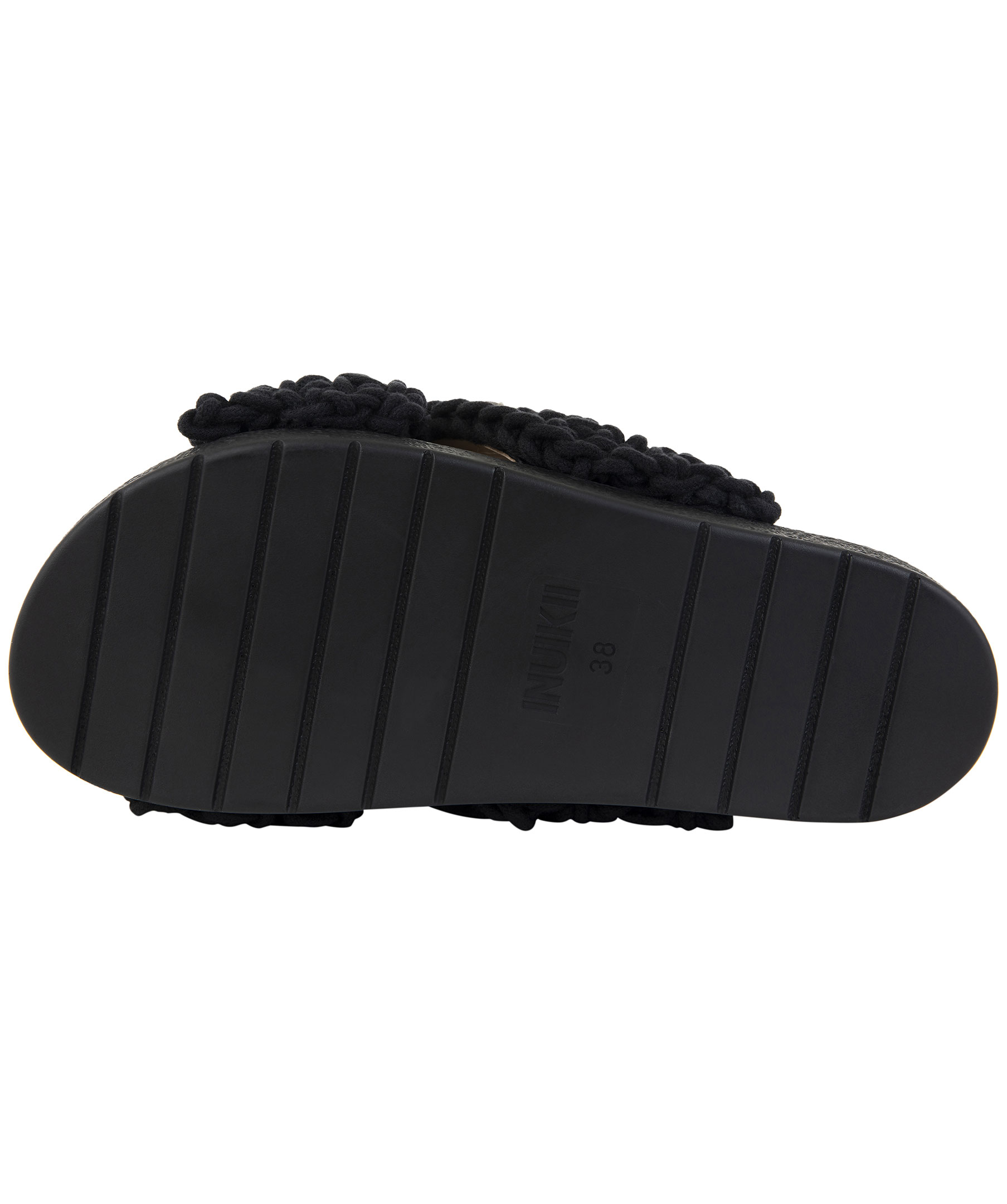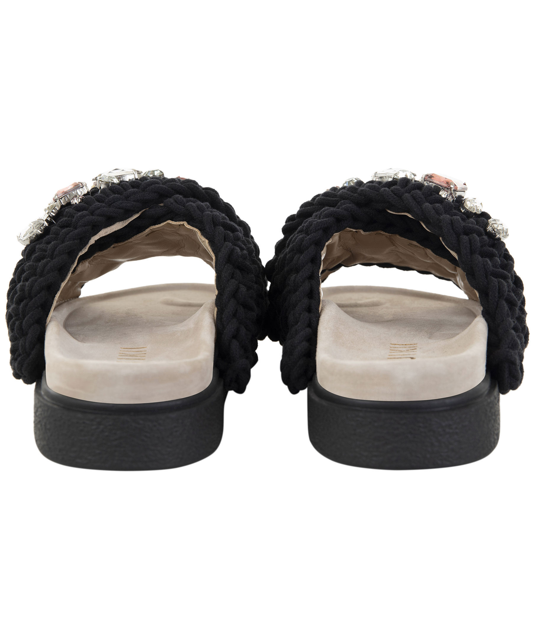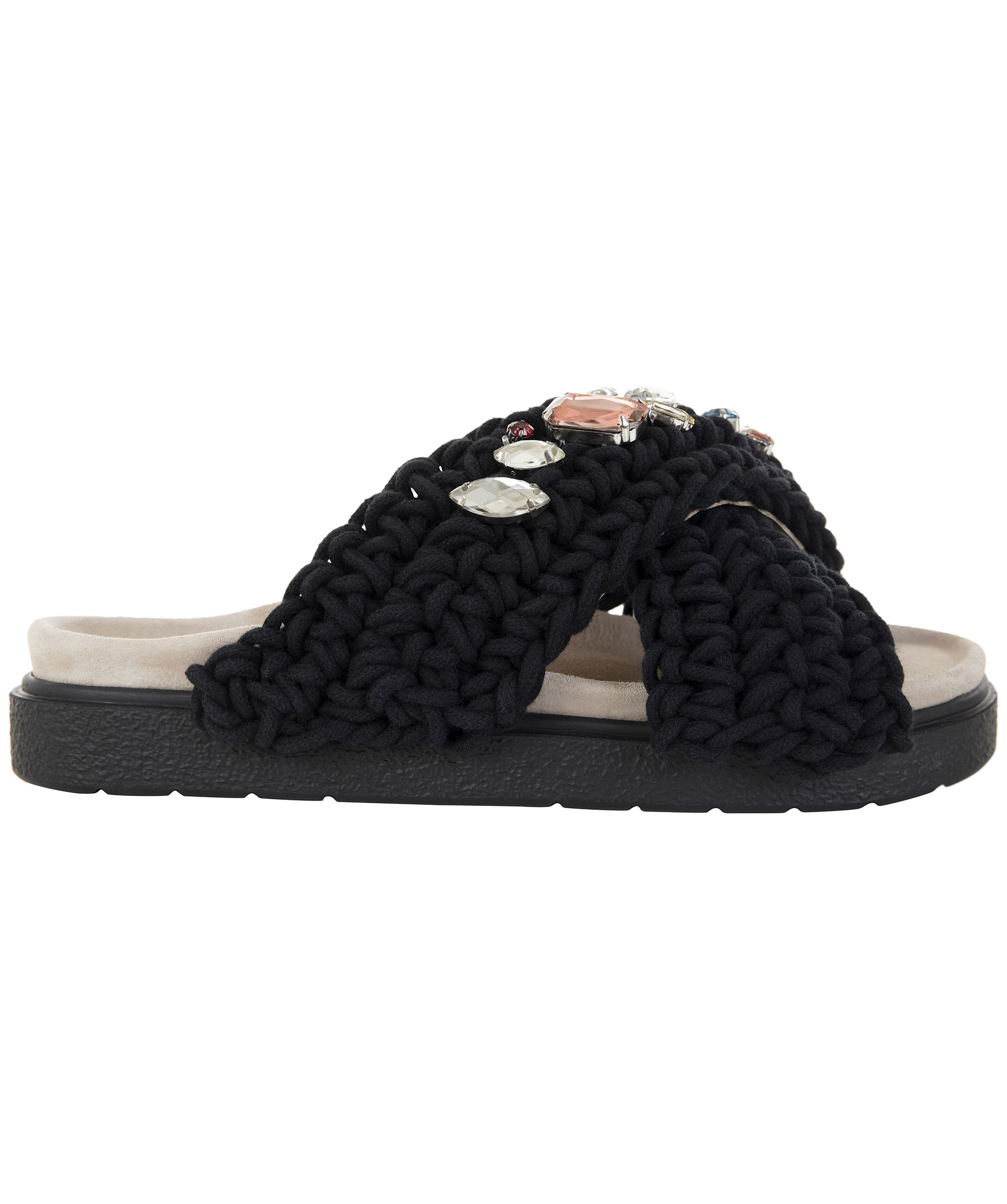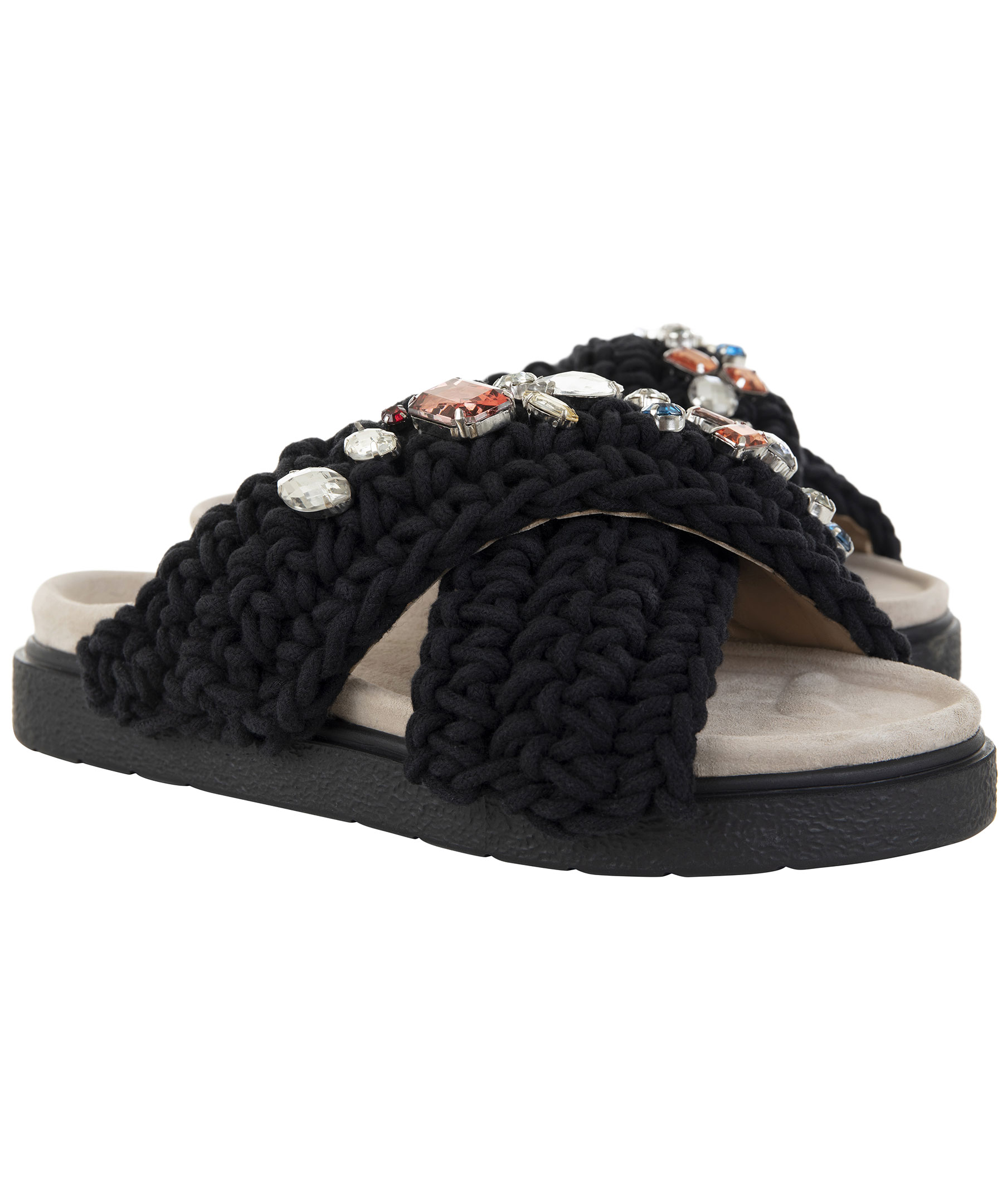 Svarta virkade tofflor med gummisula från Inuikii. Flerfärgade stenar pryder de virkade banden som krosas över foten, vilket ger den perfekta balansen mellan bohem och glam. Rund öppen tå.