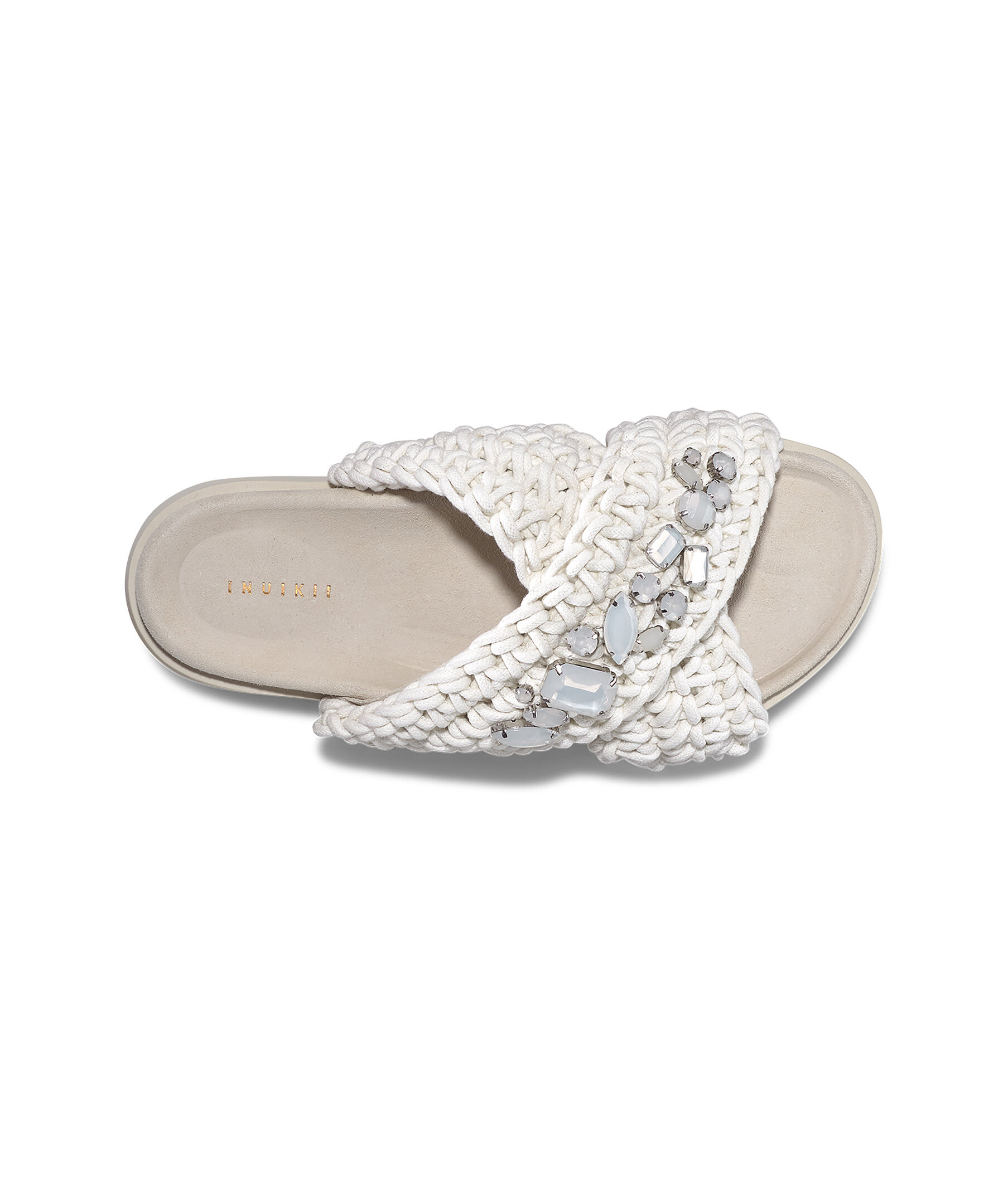 Ikoniska sandaler från Inuikii. Handvävda bomullsremmar i ivory med glittrande vita ädelstenar som skapar en balans mellan okonventionell stil och lyx. Foder och innersula i skinn som skapar optimal komfort under varma sommardagar. Lätt och dämpande yttersula i PU. Inuikii Woven sandaler är designade i Schweiz och handgjorda i Europa.