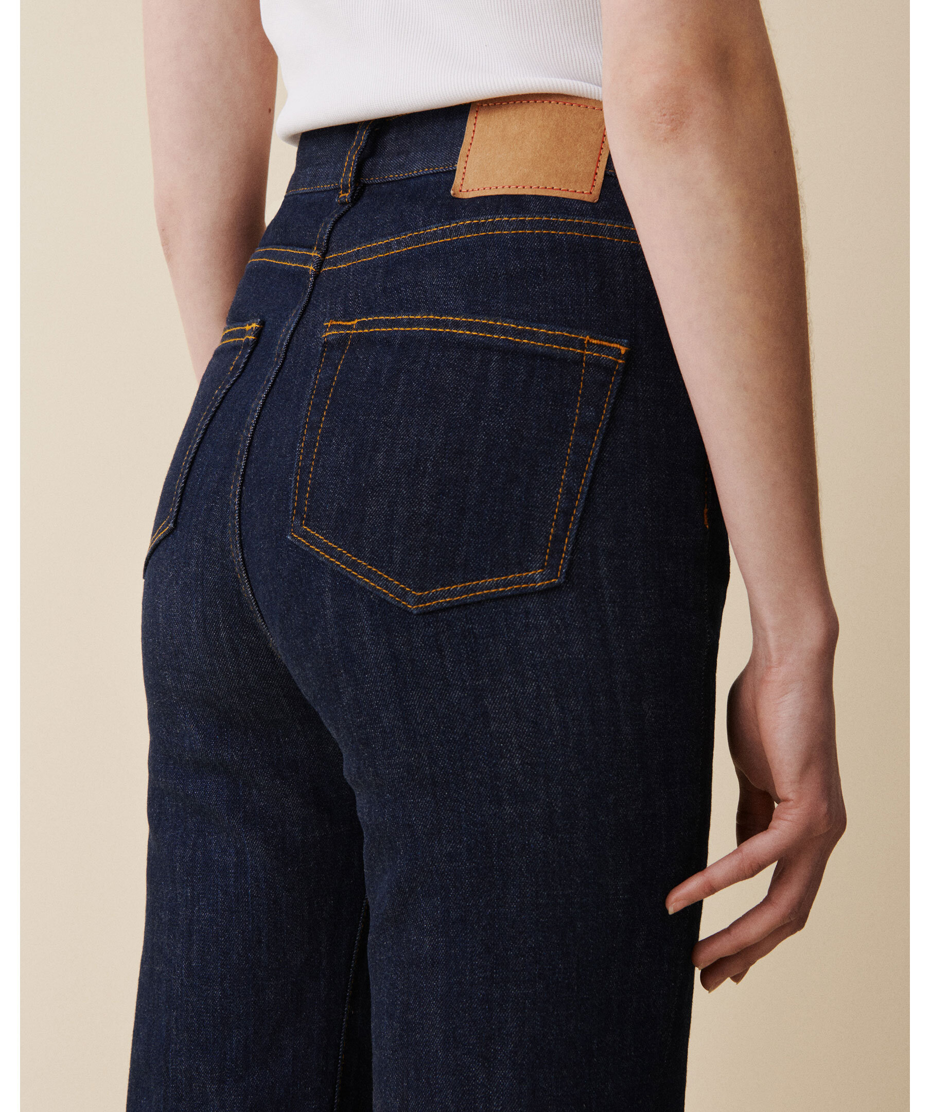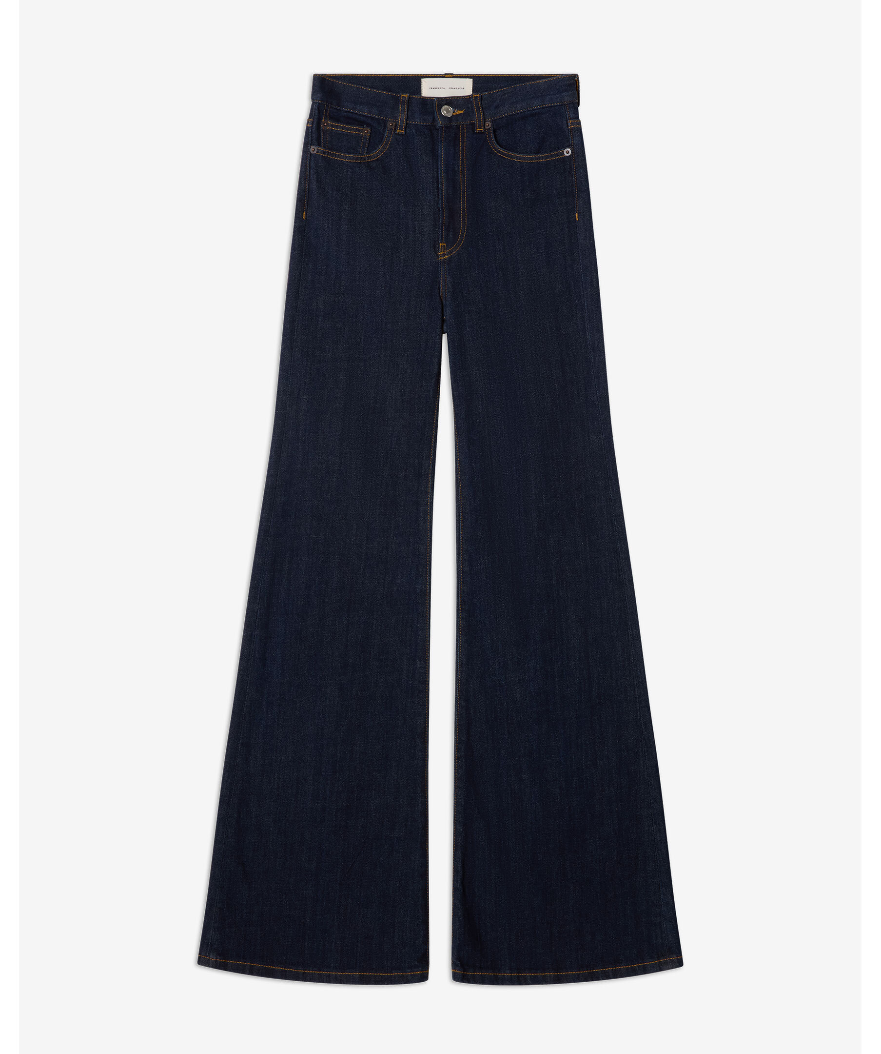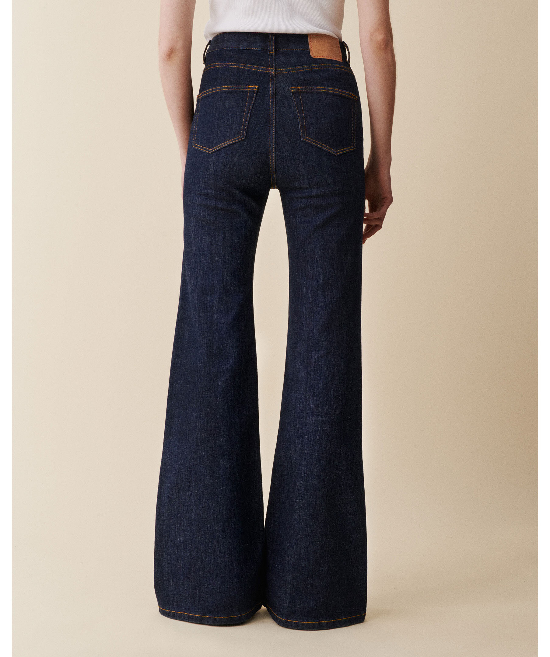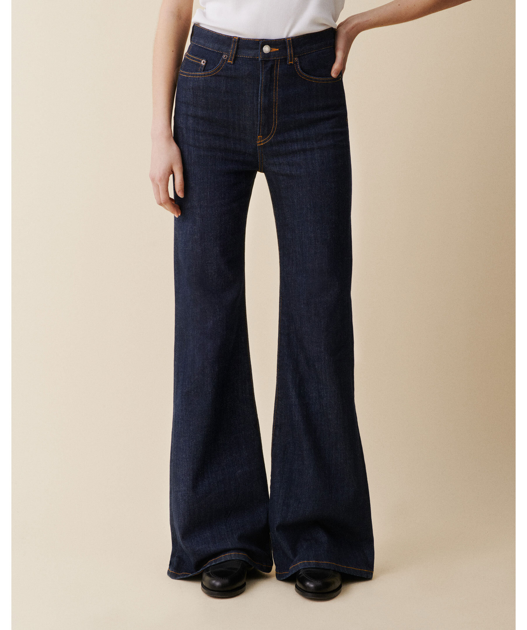 Jeans från Jeanerica i en klassisk mörkblå vintage-wash med superhög midja, extra långa vida ben och en 70-tals flare-silhuett. Jeansen har gylf med dragkedja, stretchig komfort och ger en elegant, lång kroppslinje som passar både till vardag och fest.