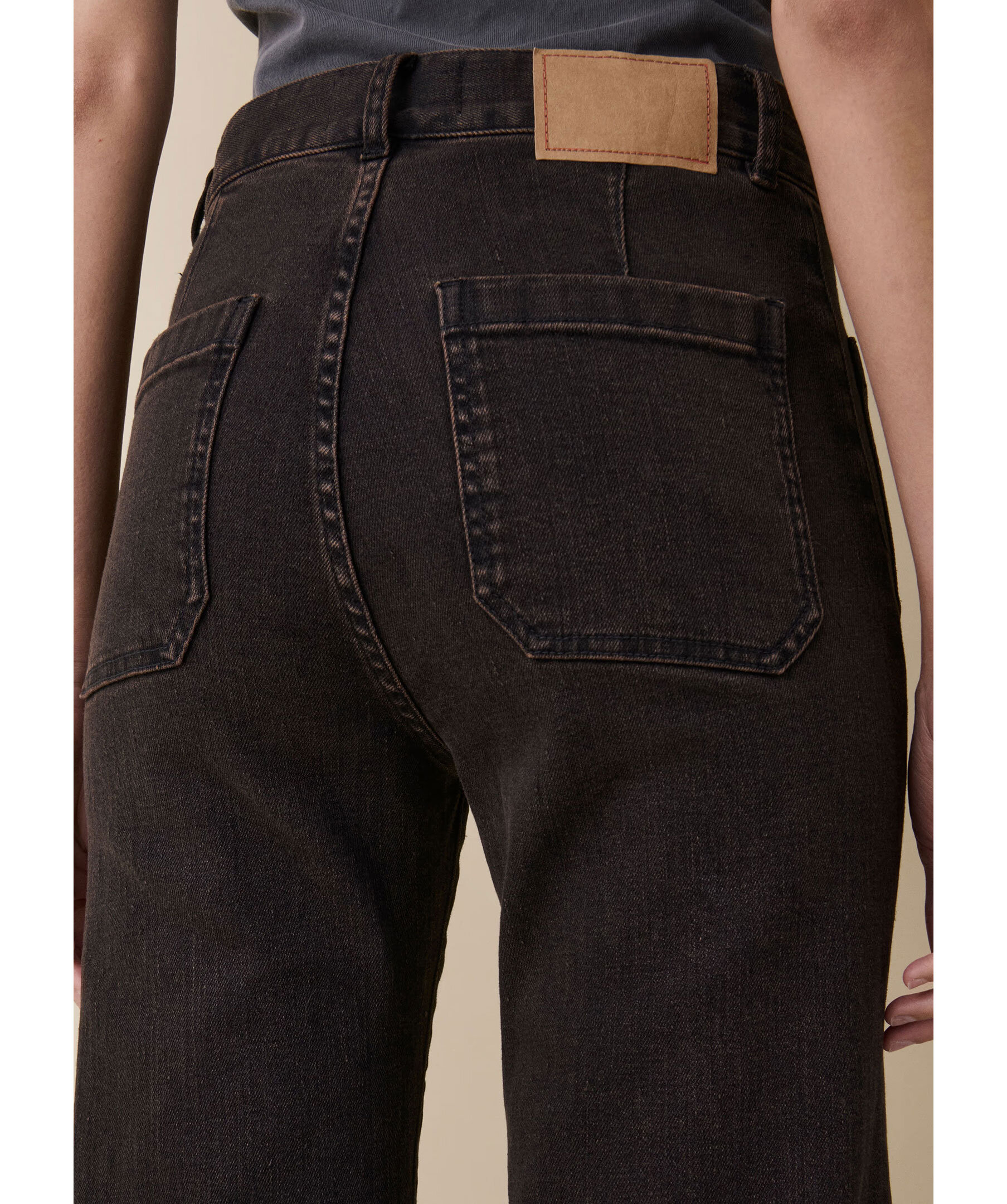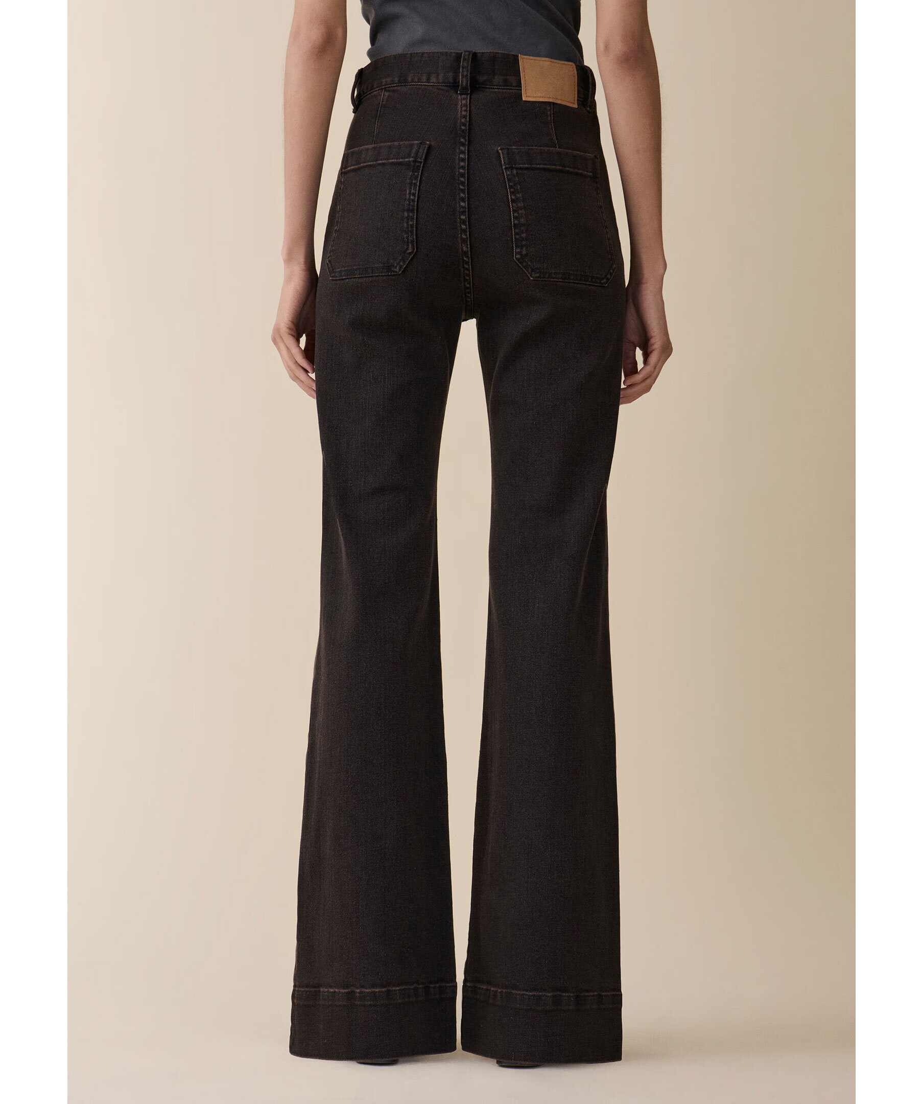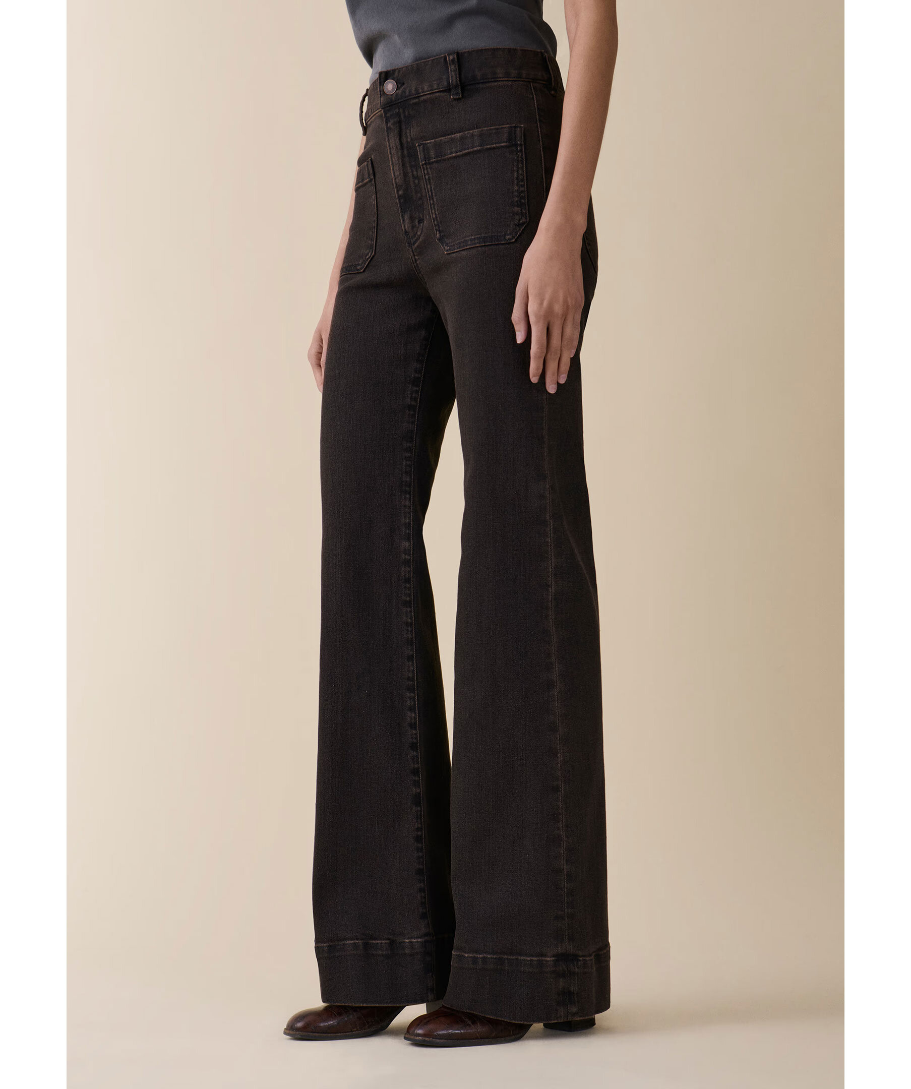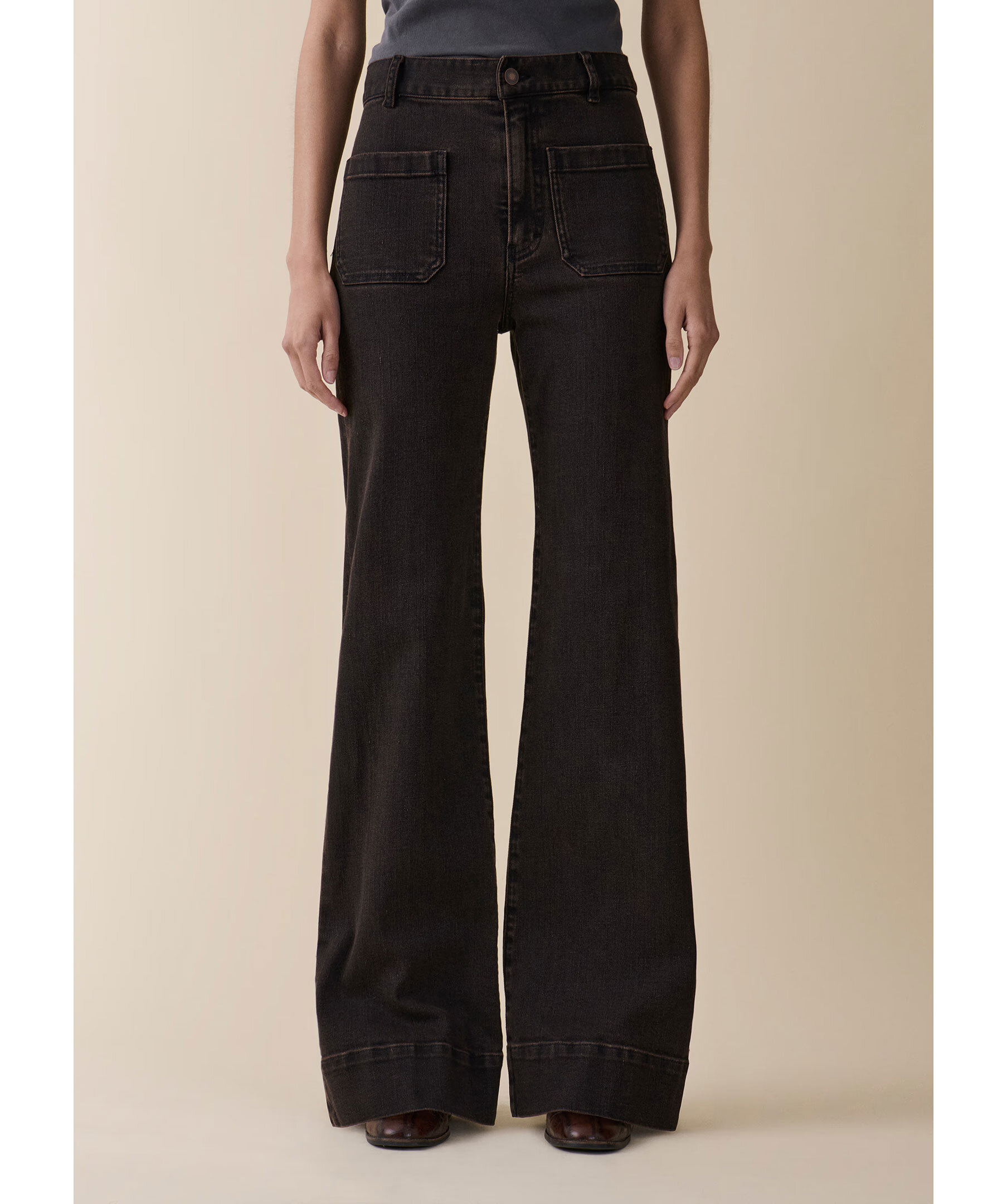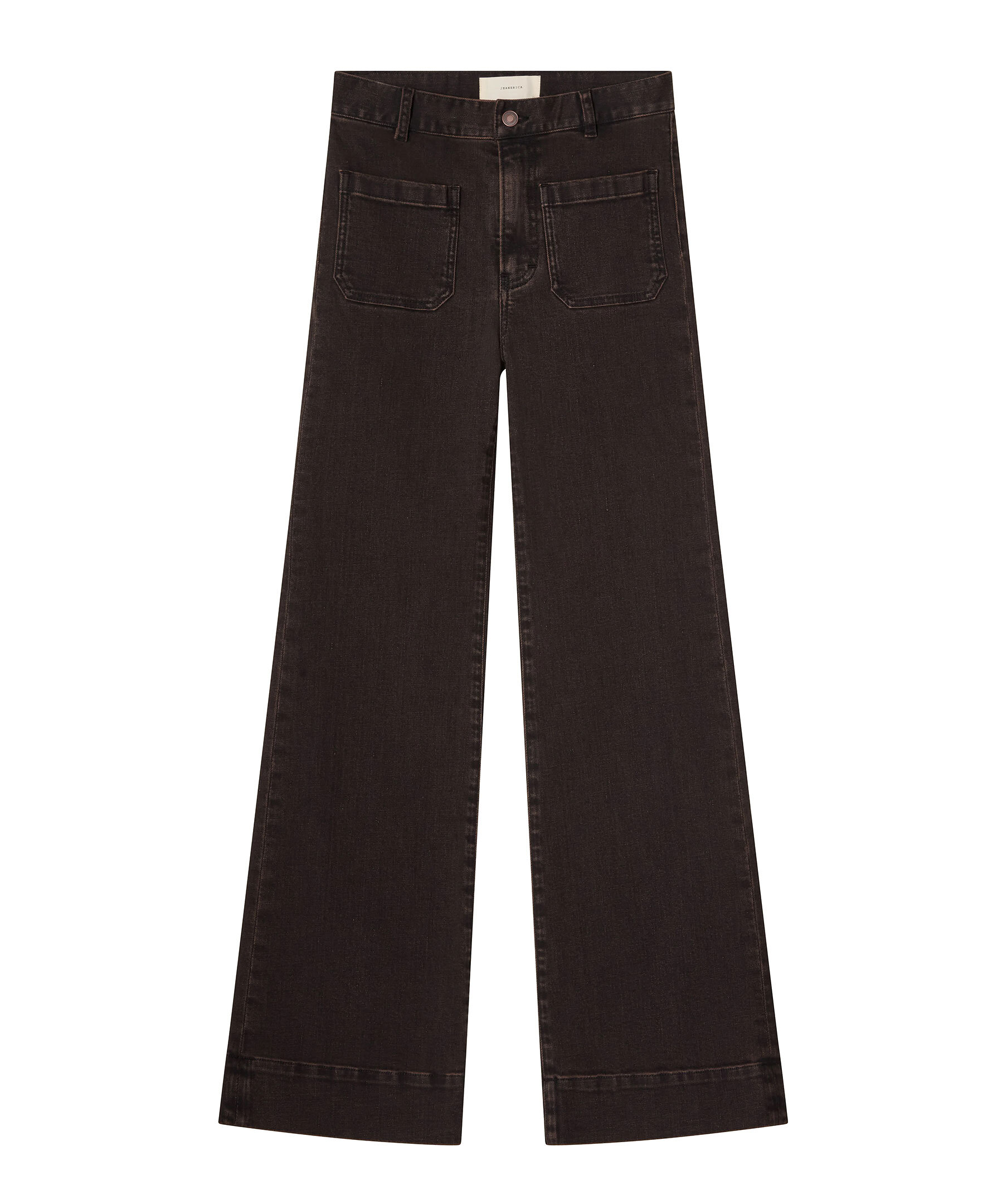 Mörkbruna, högmidjade jeans från Jeanerica med utsvängda ben. Jeansen har två påsydda framfickor, två bakfickor, bälteshällor och en patch på linningen. Tillverkade i en bomullsblandning.