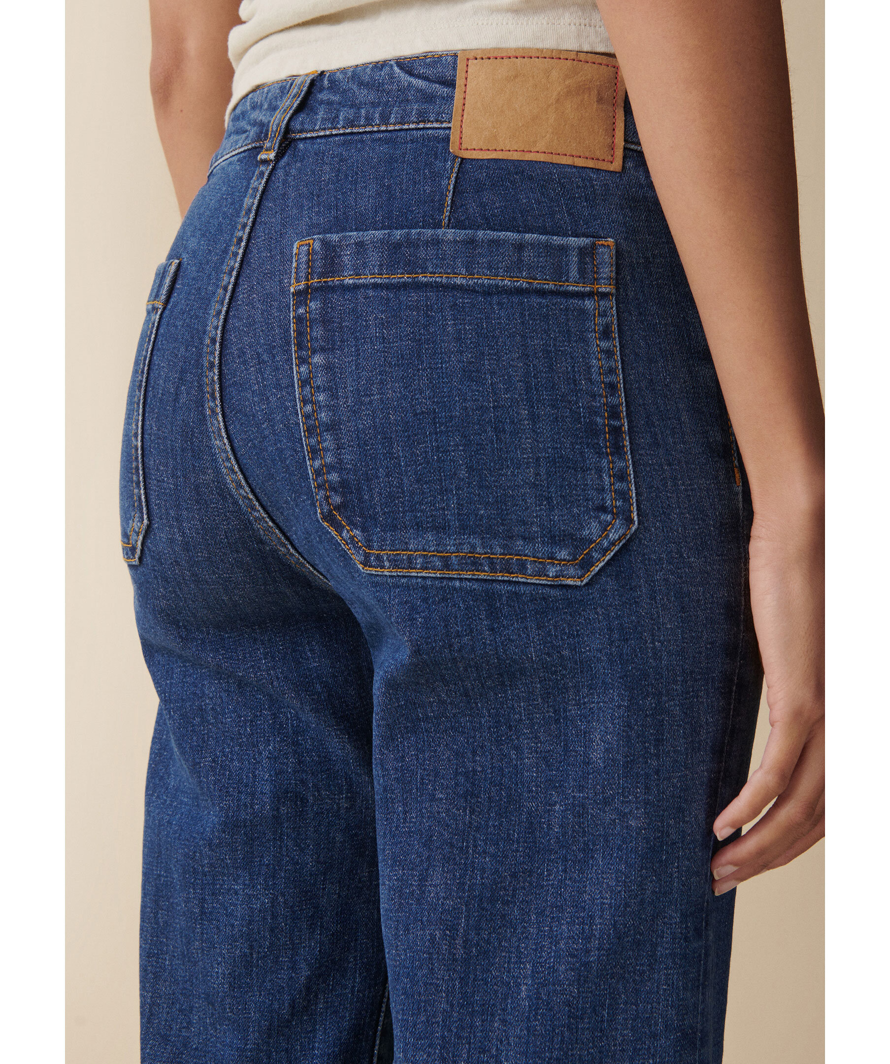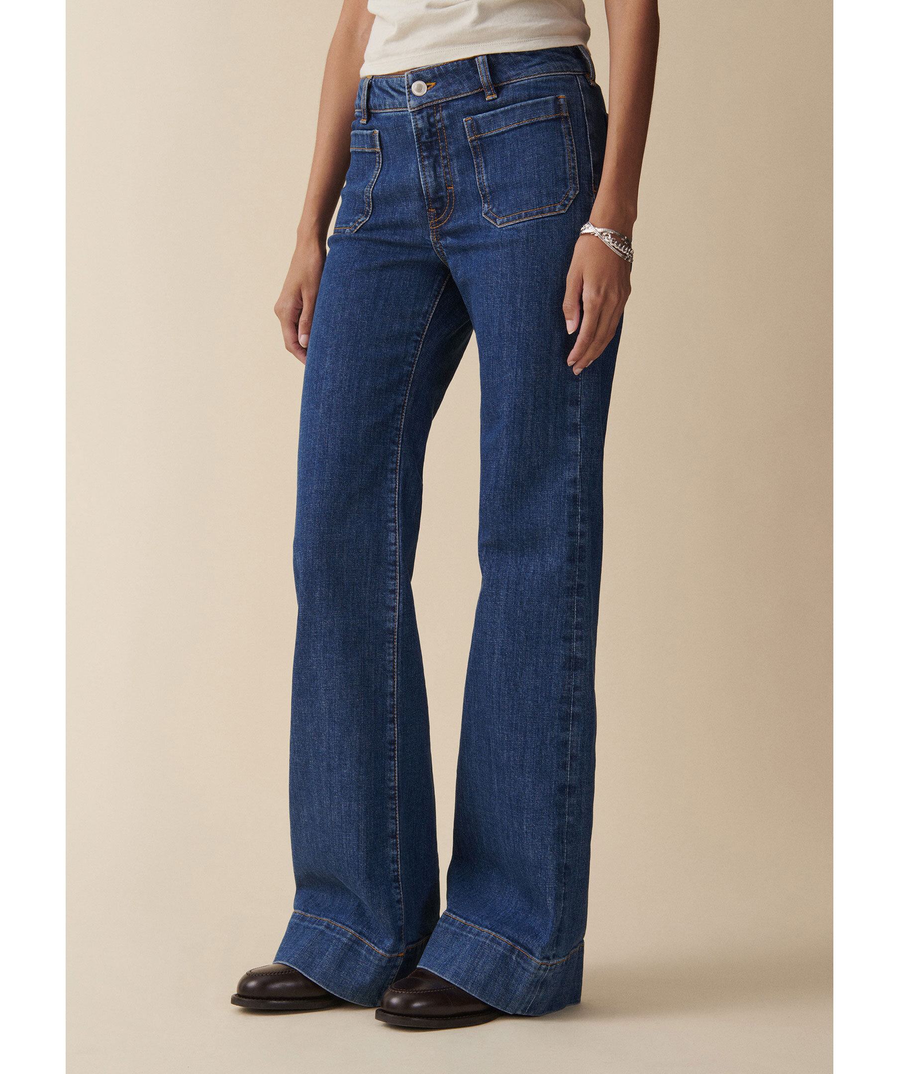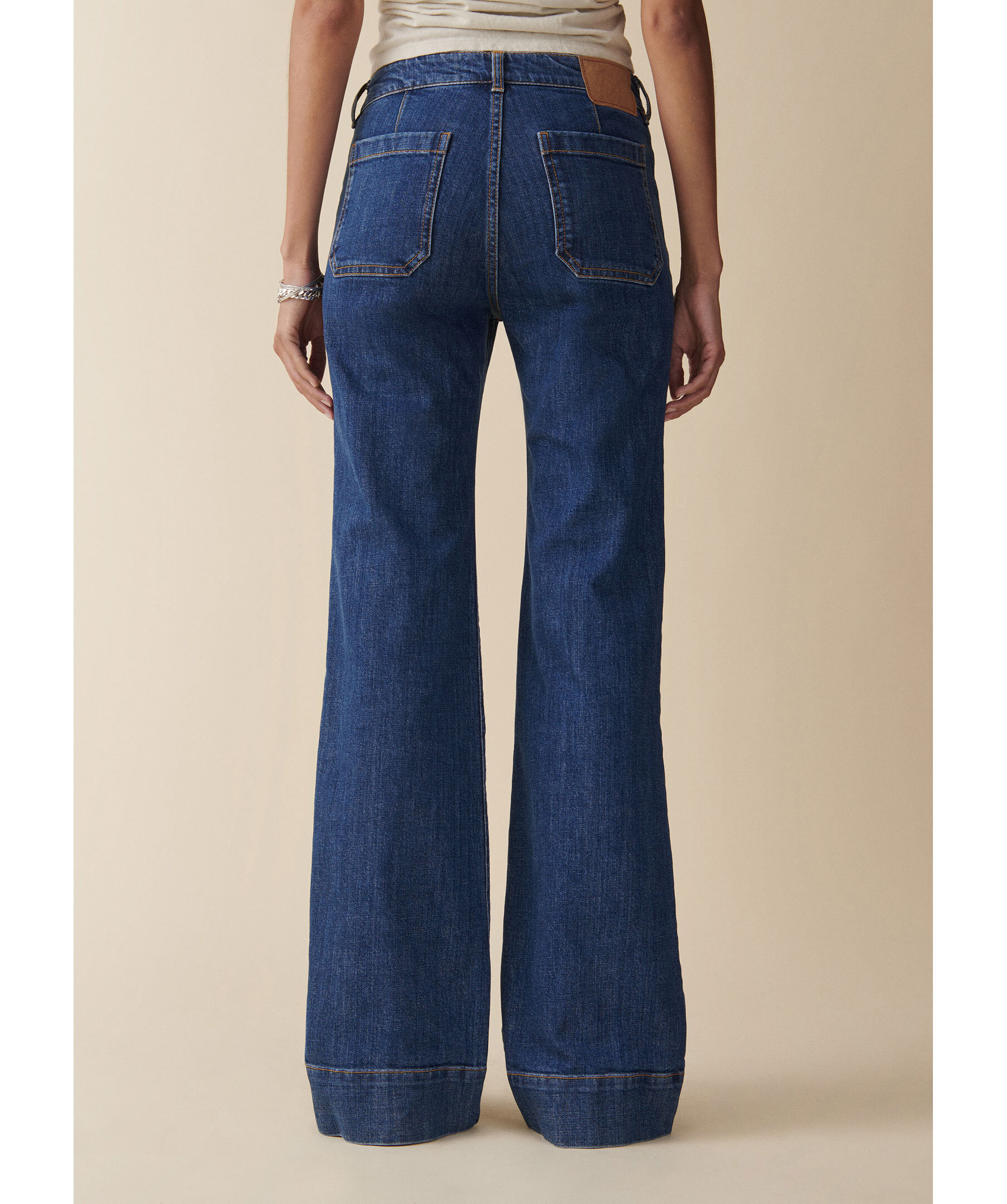Mörkblåa lågmidjade jeans från Jeanerica med utsvängda ben. Jeansen har två påsydda framfickor, två bakfickor, bälteshällor och en patch på linningen. Tillverkade i en bomullsblandning.