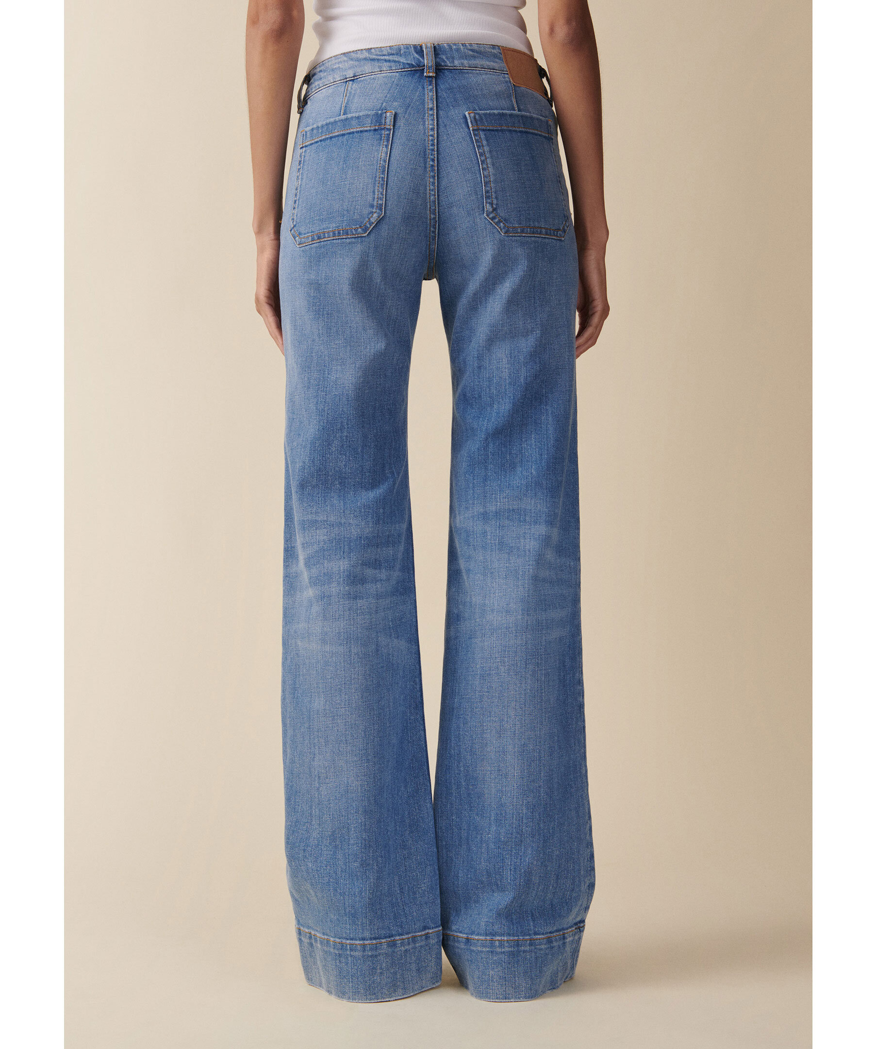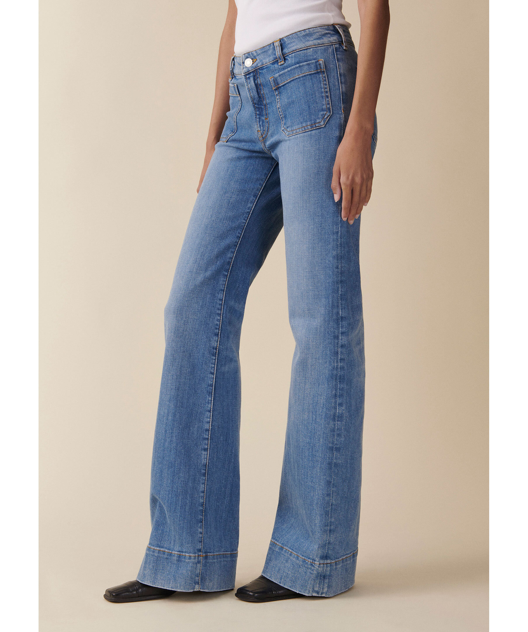 Blåa lågmidjade jeans från Jeanerica med utsvängda ben. Jeansen har två påsydda framfickor, två bakfickor, bälteshällor och en patch på linningen. Tillverkade i en bomullsblandning.