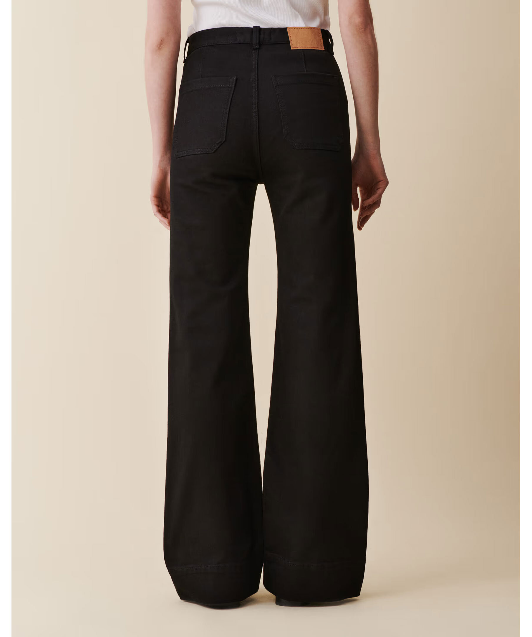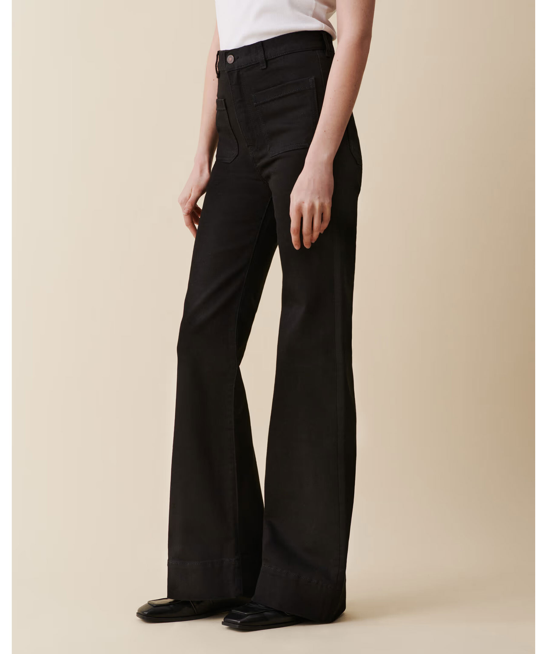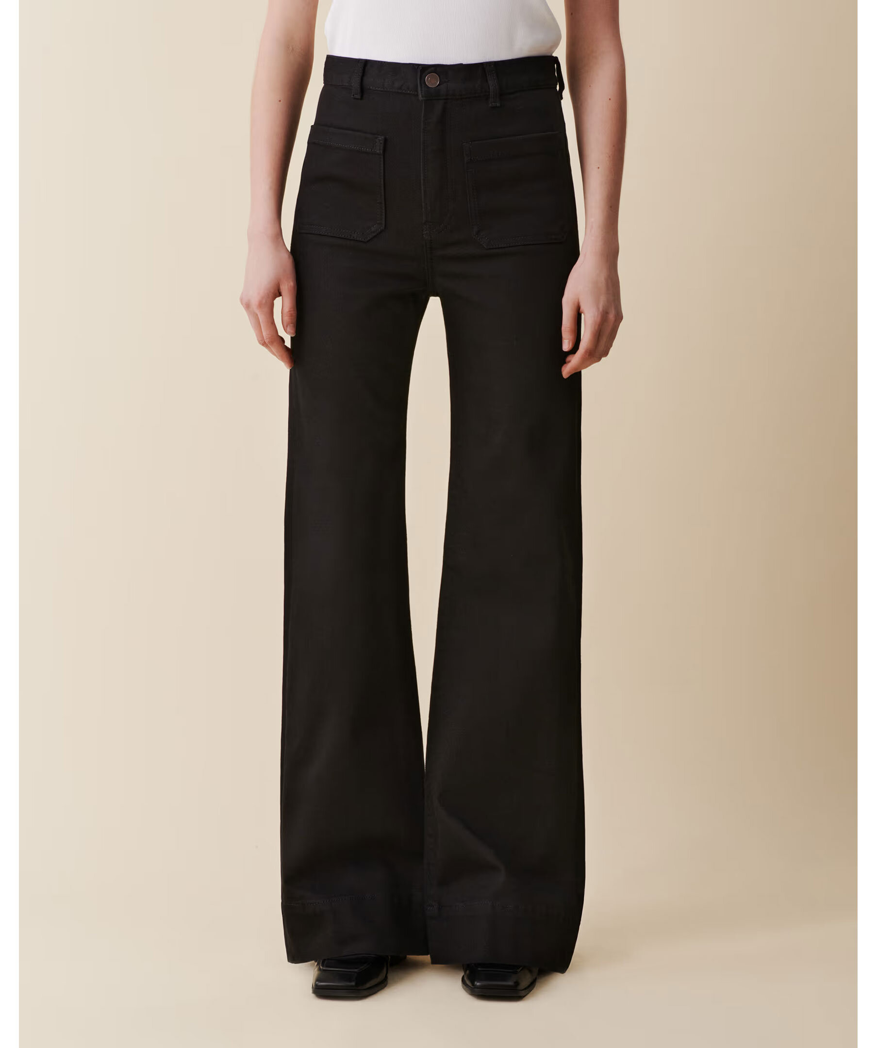 Klassiska svarta jeans Jeanerica med hög midja, vida flared‑ben och patchfickor fram och bak – inspirerade av sjömansstil från 1960‑talet. Jeansen har gylf med dragkedja, en lätt stretchig denim och en tidlös silhuett som passar både vardag och mer dressade looks.