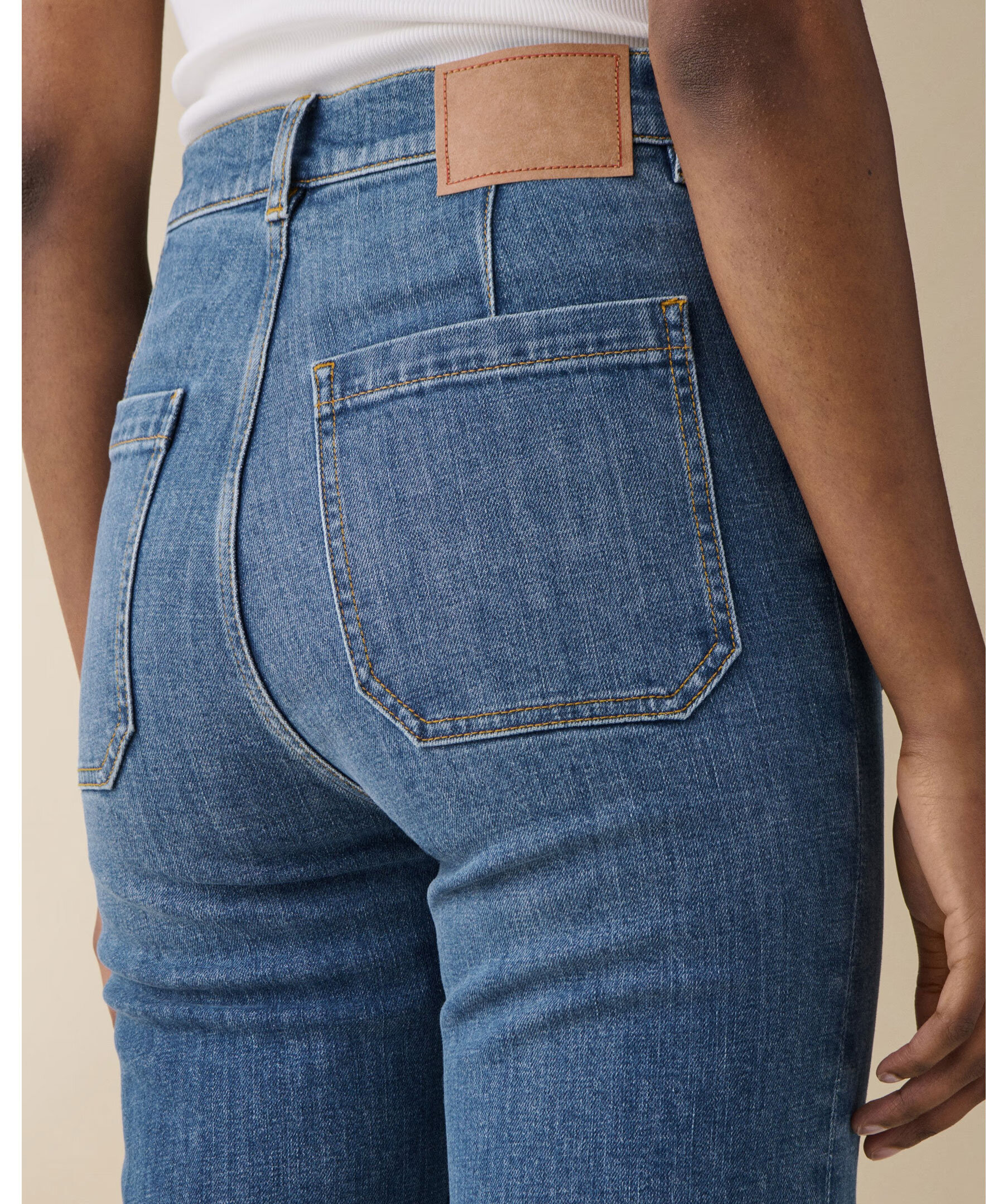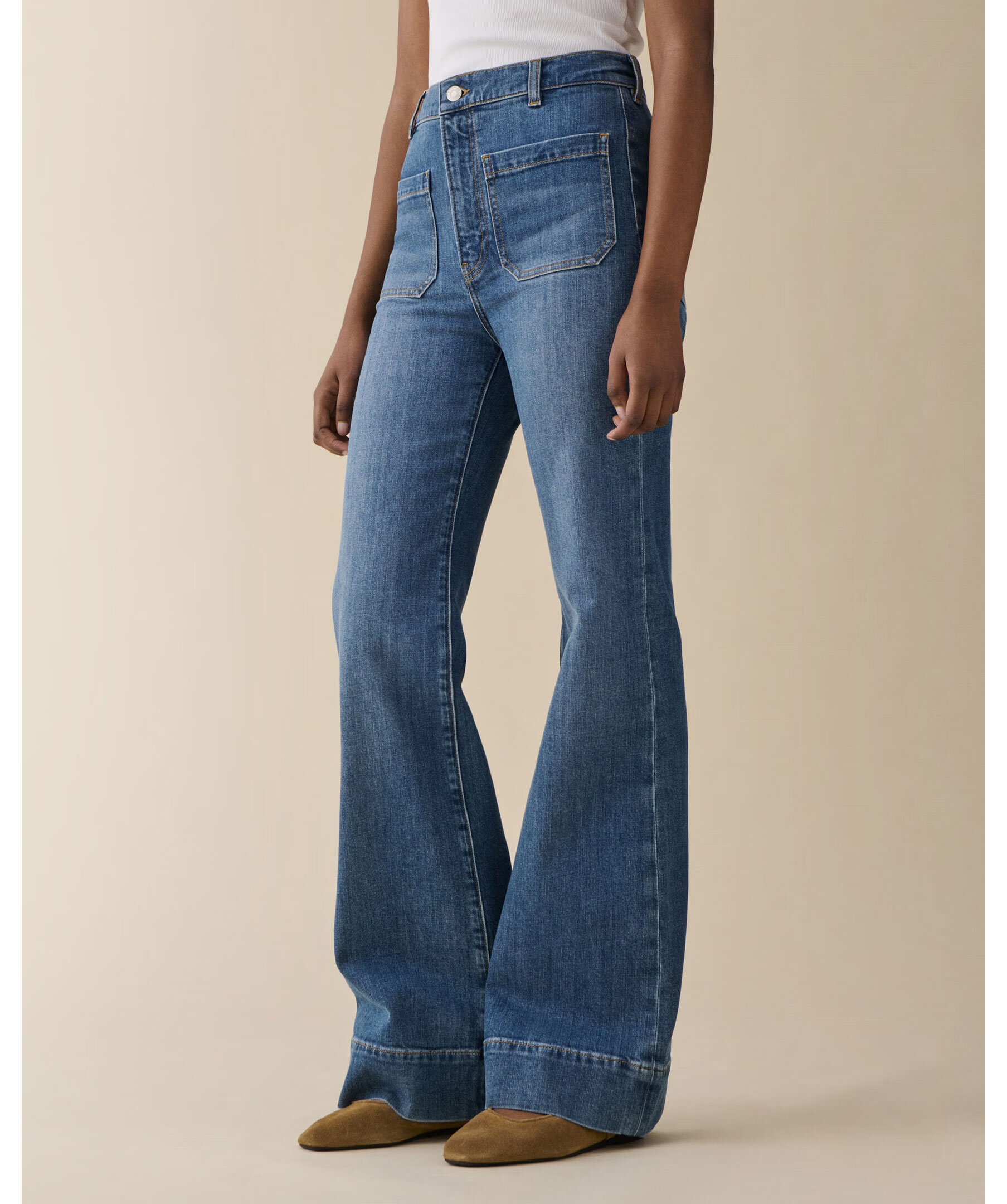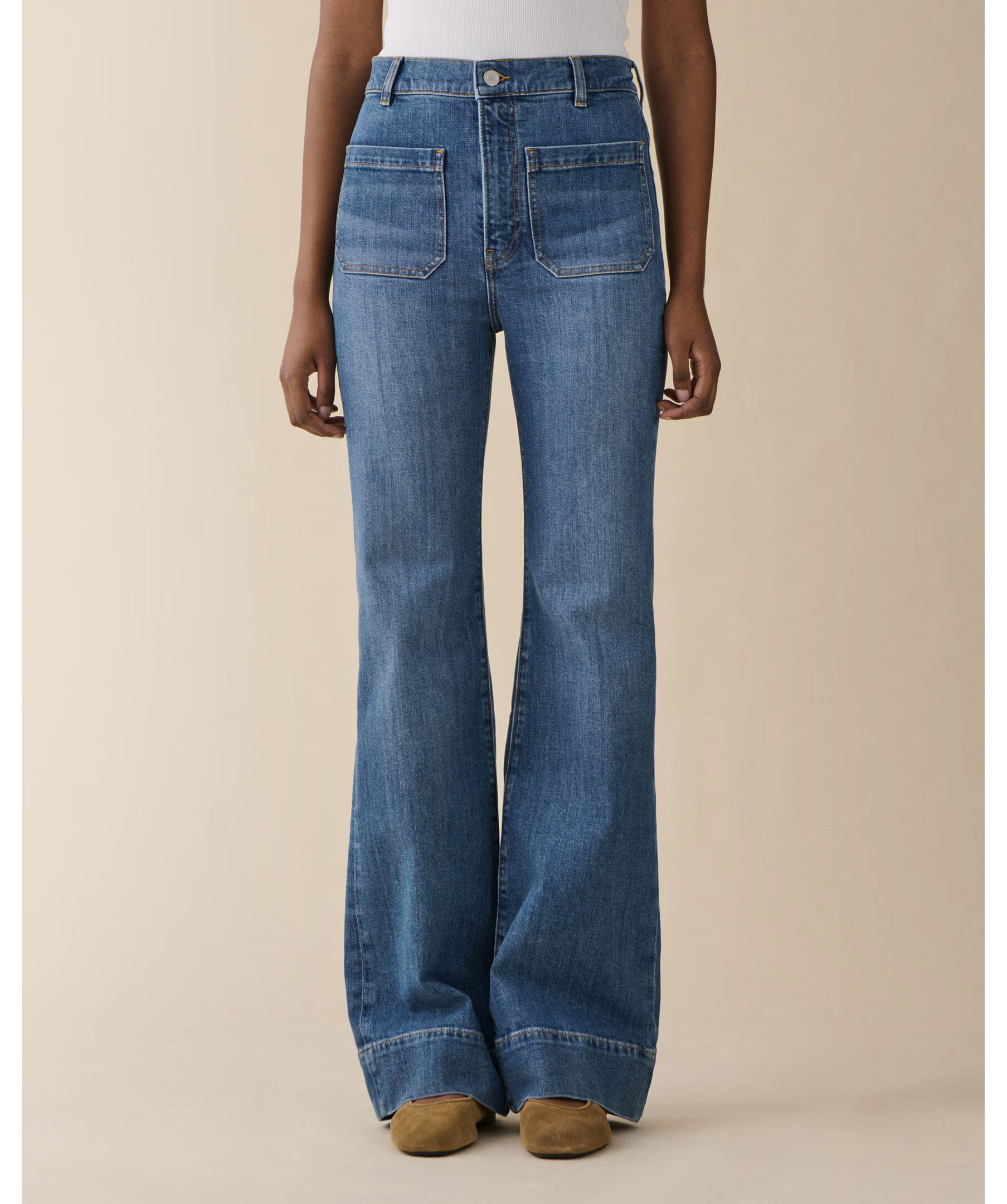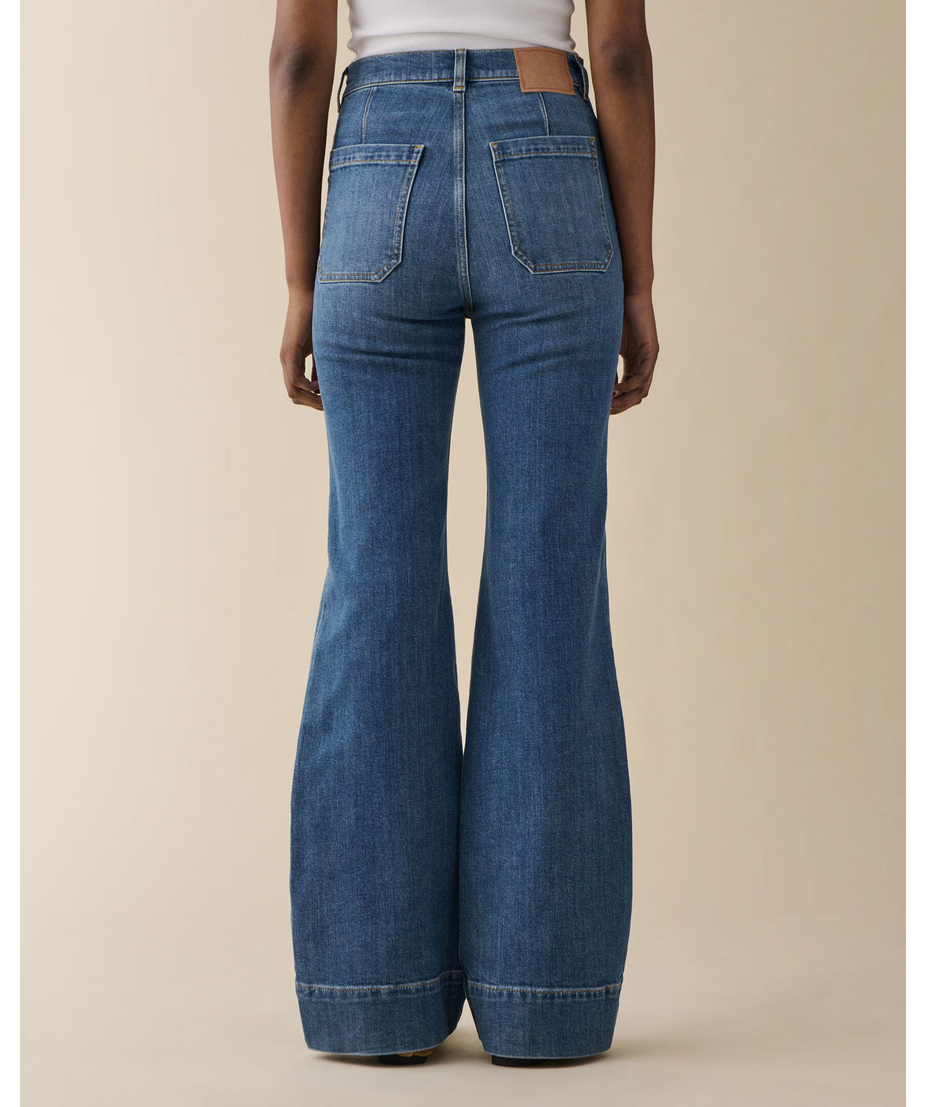 St Monica Vintage 70 från Jeanerica är retroinspirerade jeans med hög midja, flared ben och klassiska påsydda fickor i tidlös 70-talsstil. Modellen har stretchig, lätt denim som ger både komfort och en avslappnad silhuett till vardags- eller kvällslooks