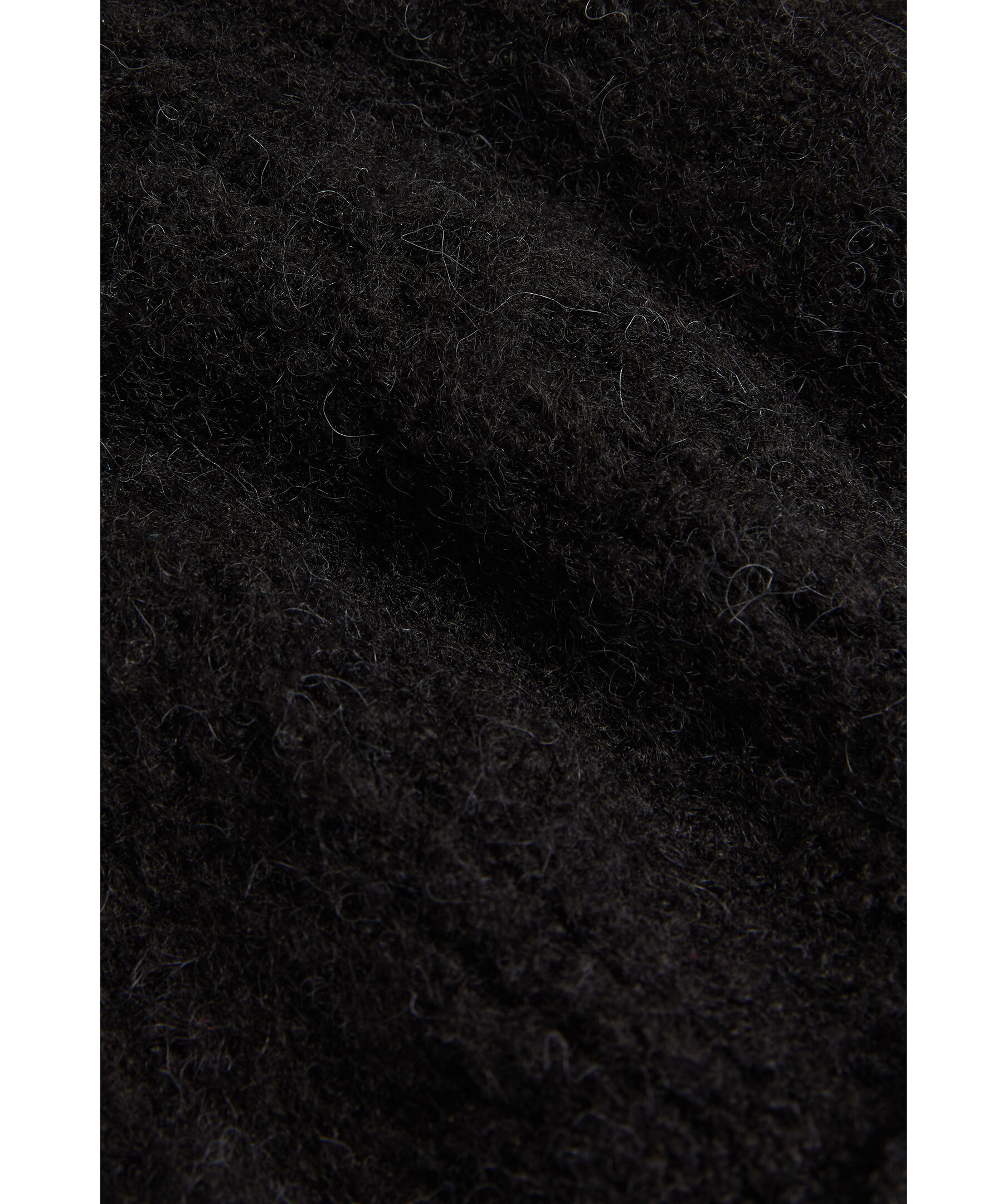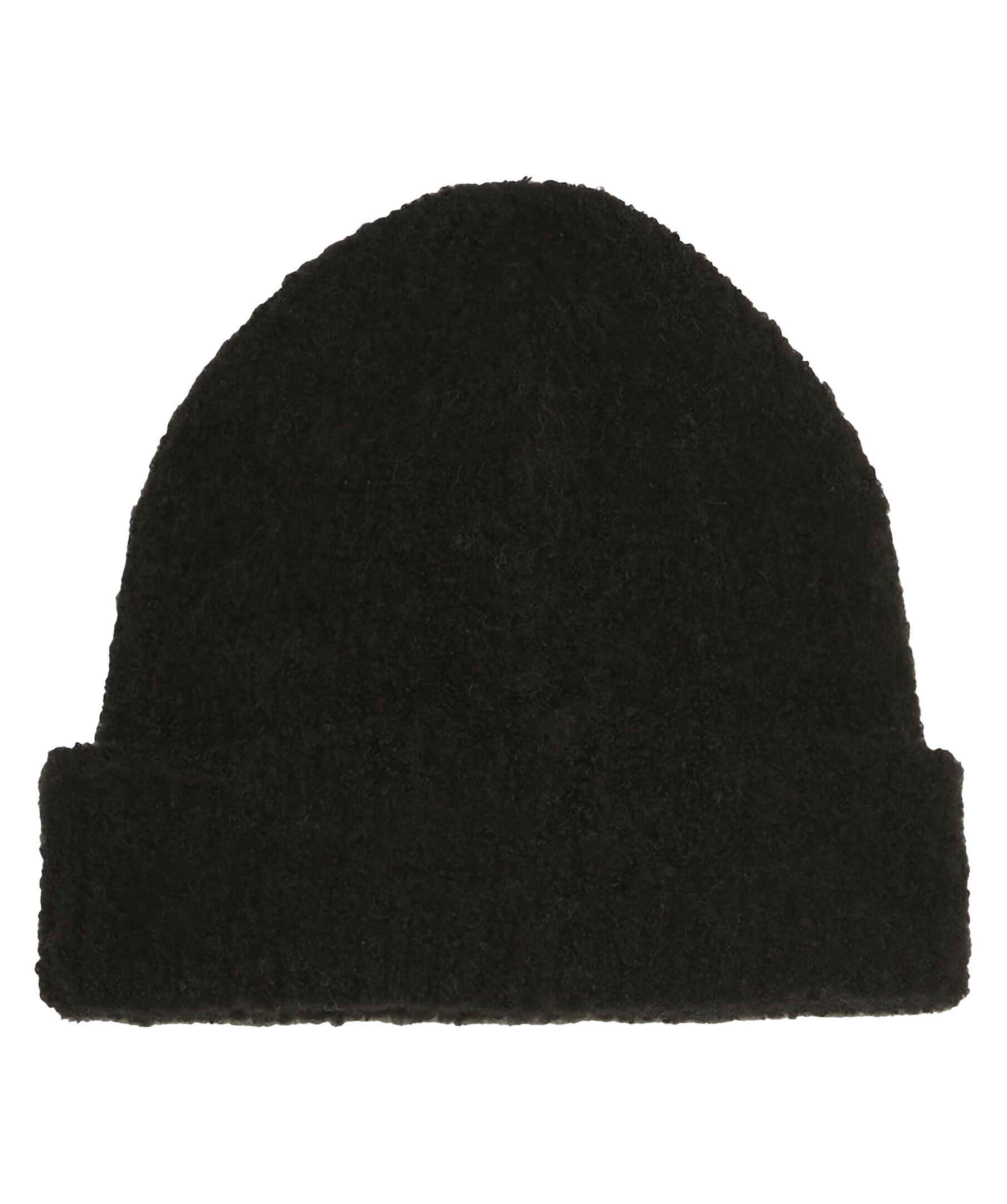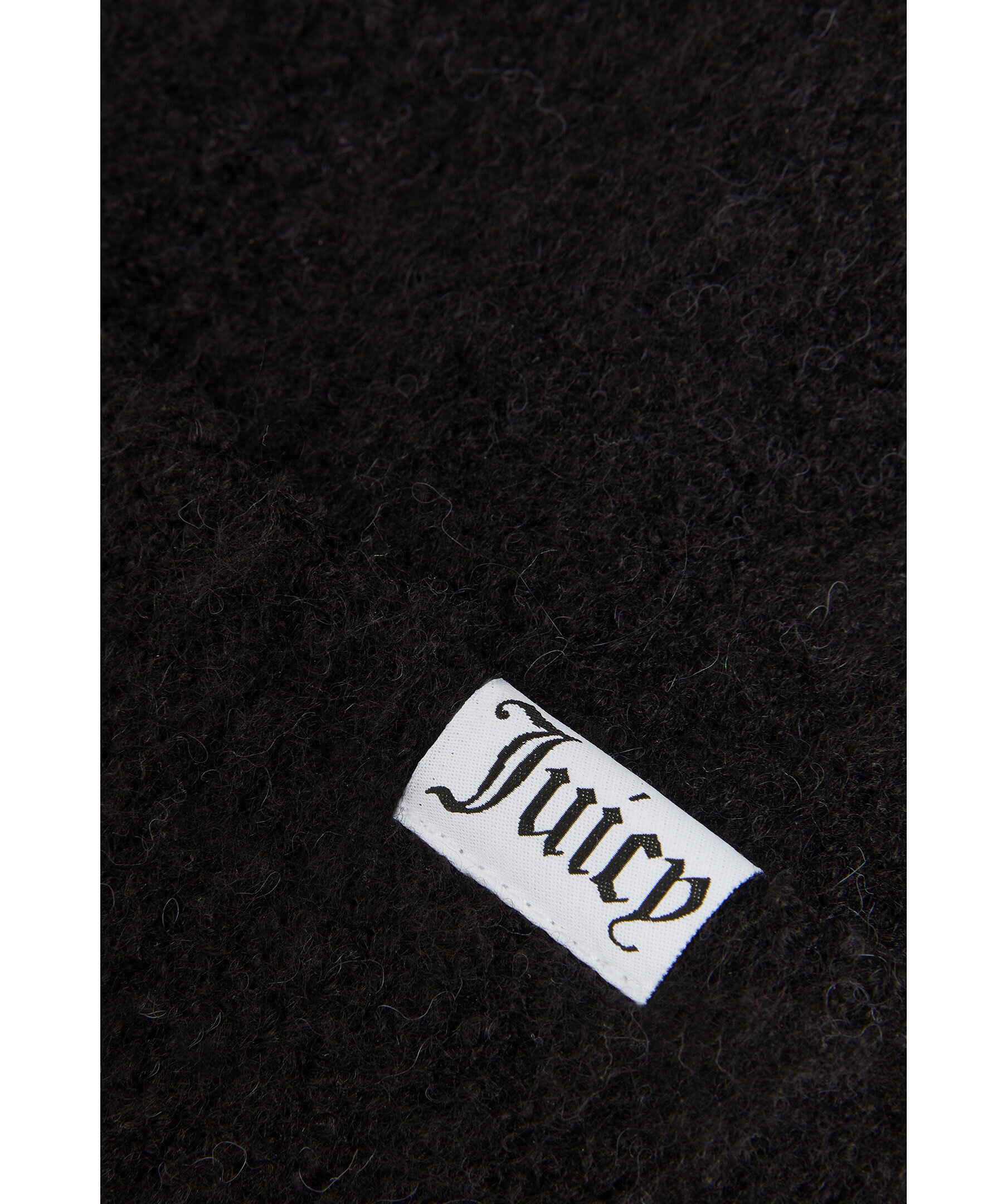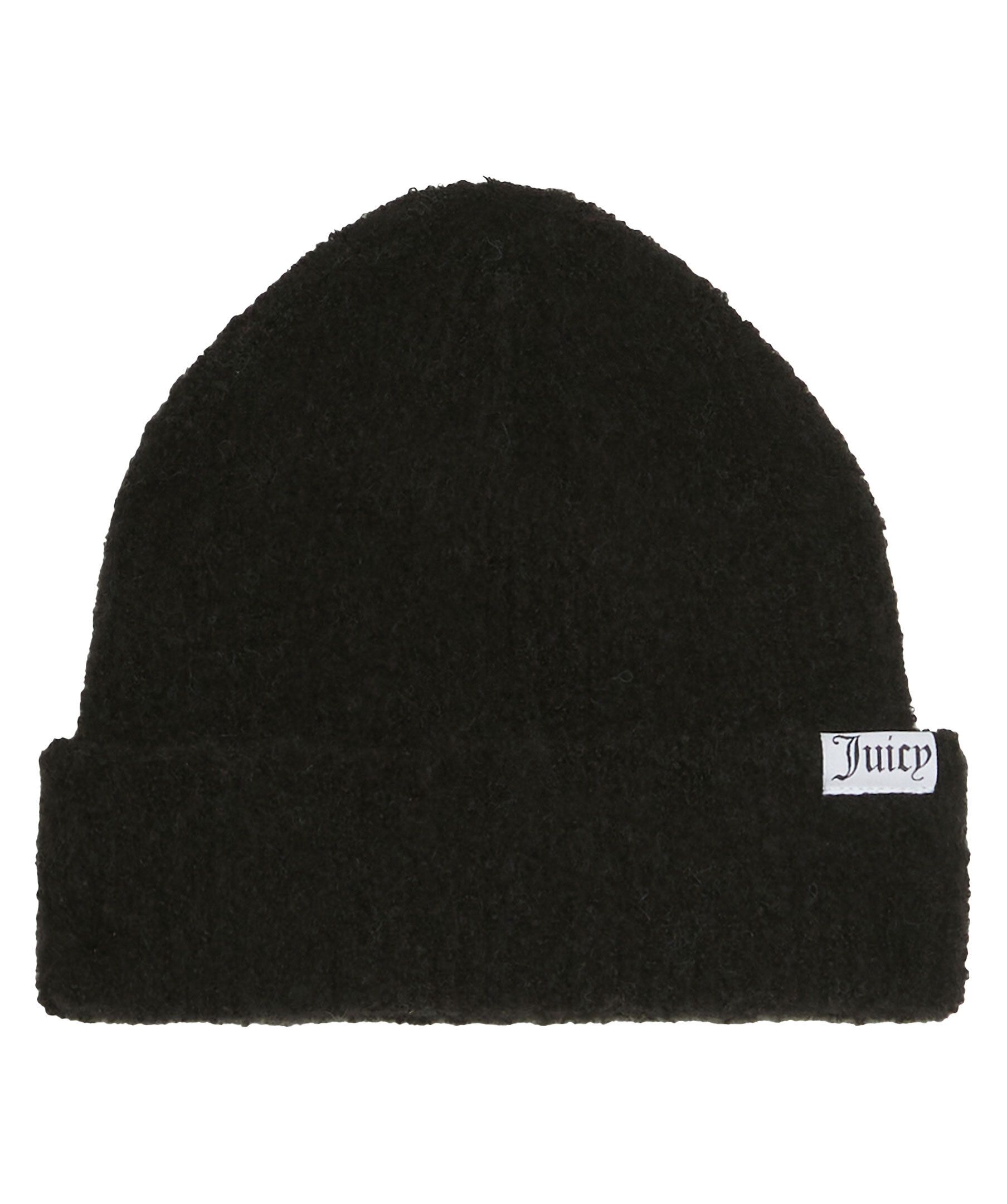Svart texturstickad mössa från Juicy Couture. Uppvikt kant med en liten tygpatch. Gjord i en ullblandning.
