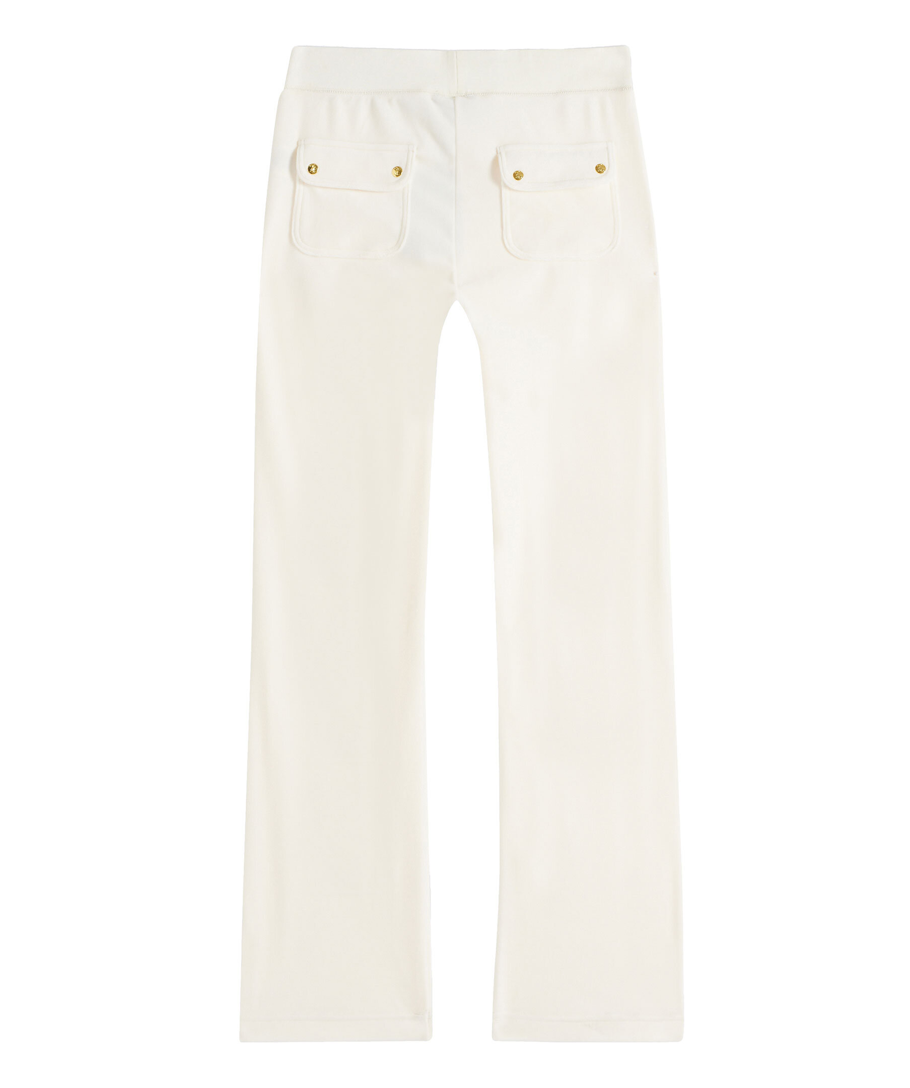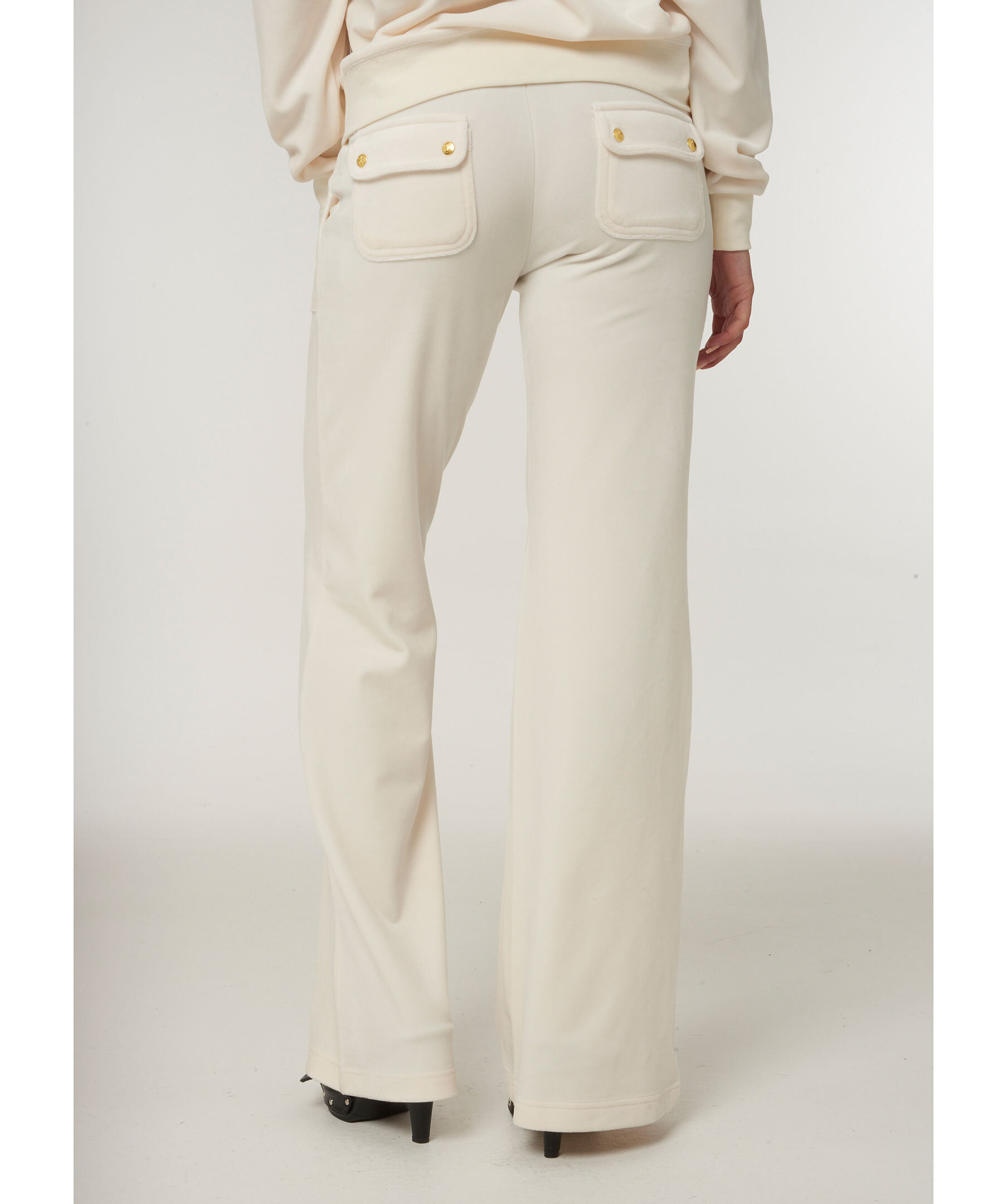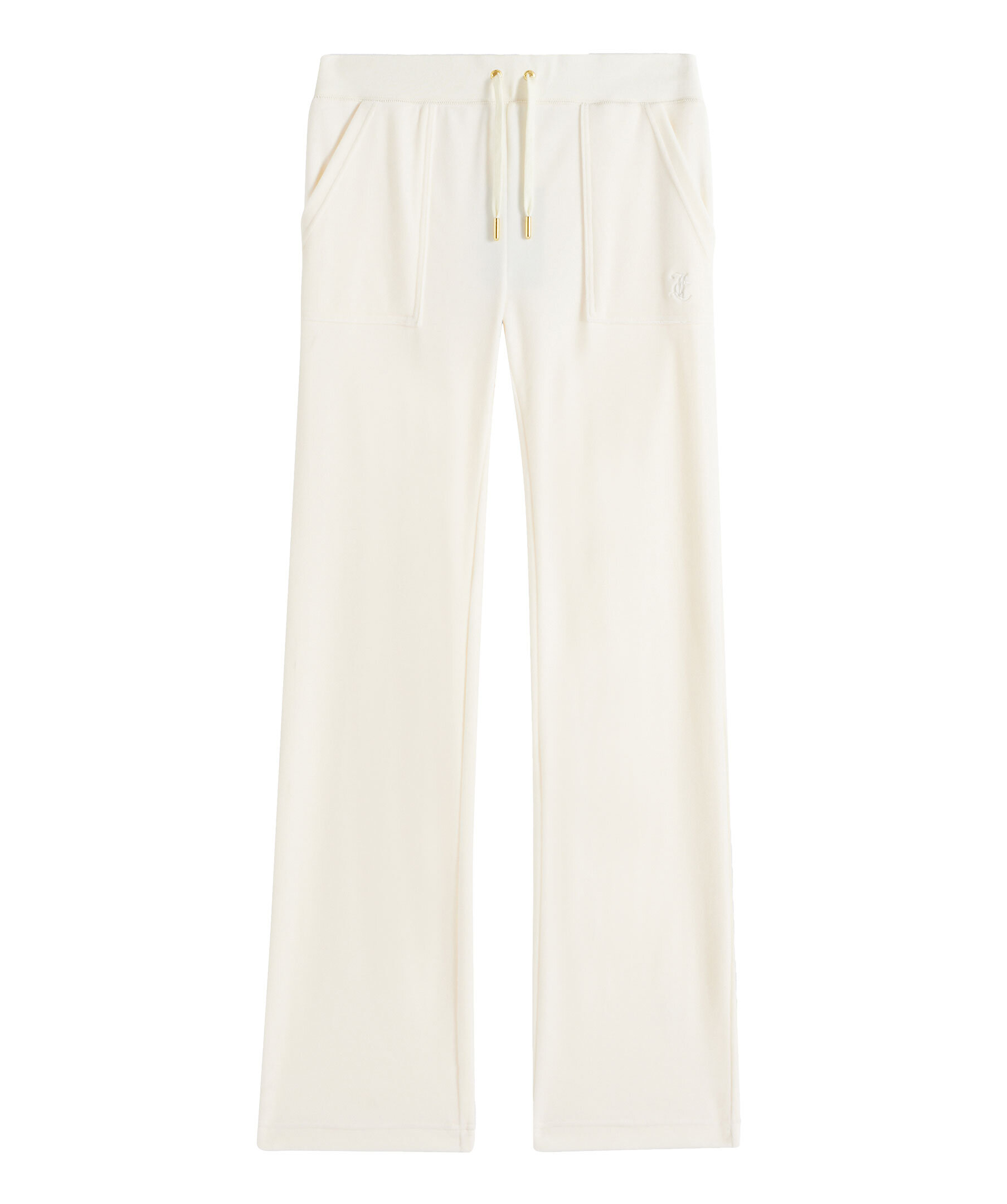 Byxor i velour i färgen Sugar Swizzle från Juicy Couture. Bred resårkant i midjan med snörning, fickor i sidorna och bakfickor med ficklock och tryckknappar med logotyp. Rak modell. Broderad logga framtill på vänster ficka.