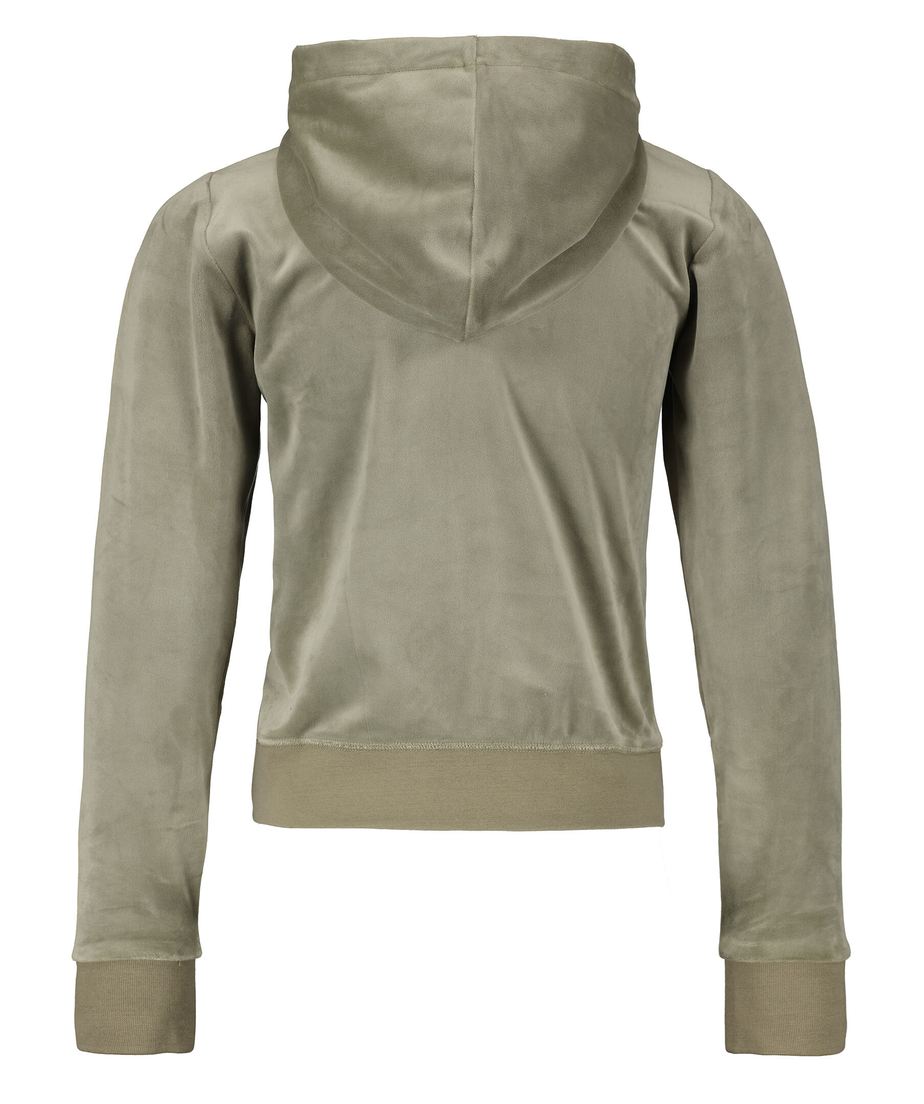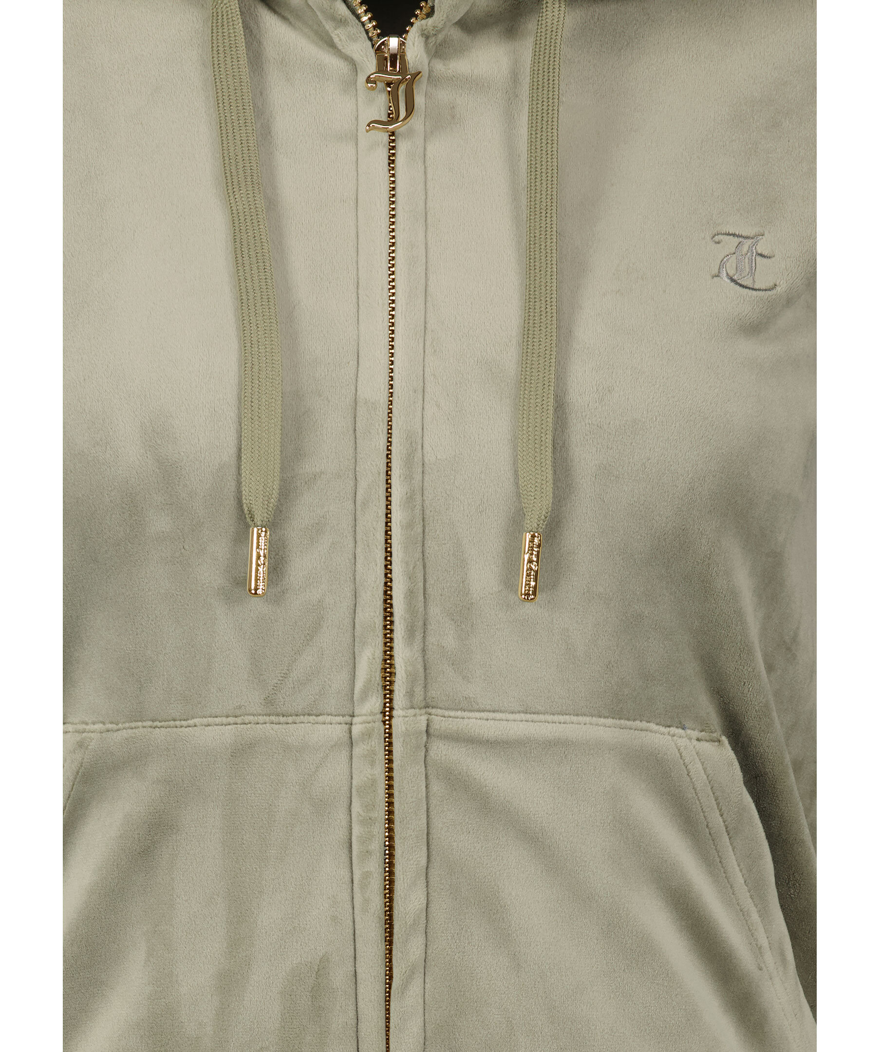 Velour hoodie med dragkedja fram i färgen Vetiver från Juicy Couture. Bred mudd i plaggslut och i ärmslut, broderad logotyp i ton-i-ton på bröstet på vänster sida. Snörning i luvan och fickor fram. Gulddetaljer.