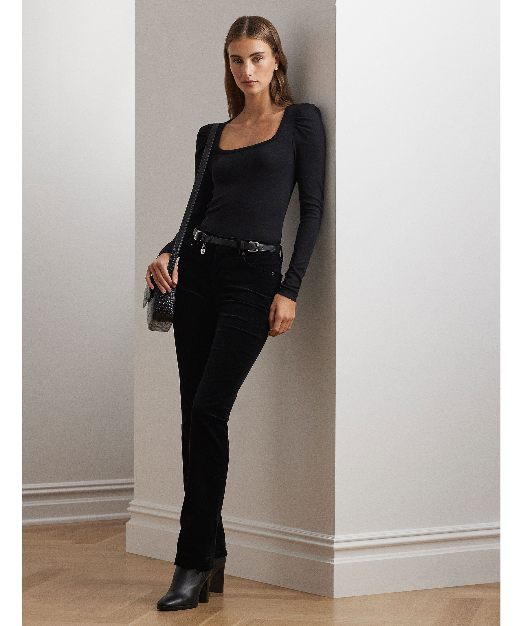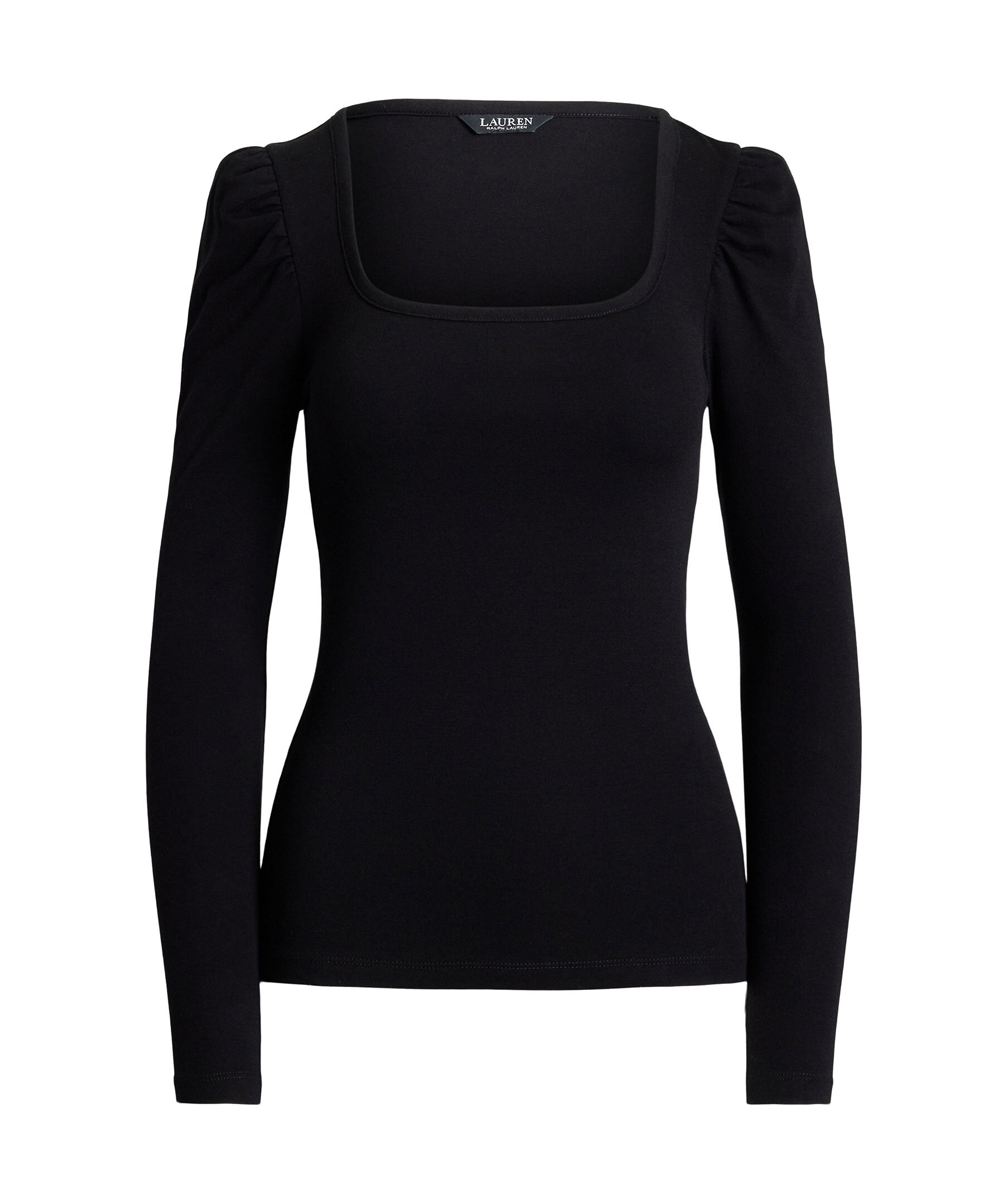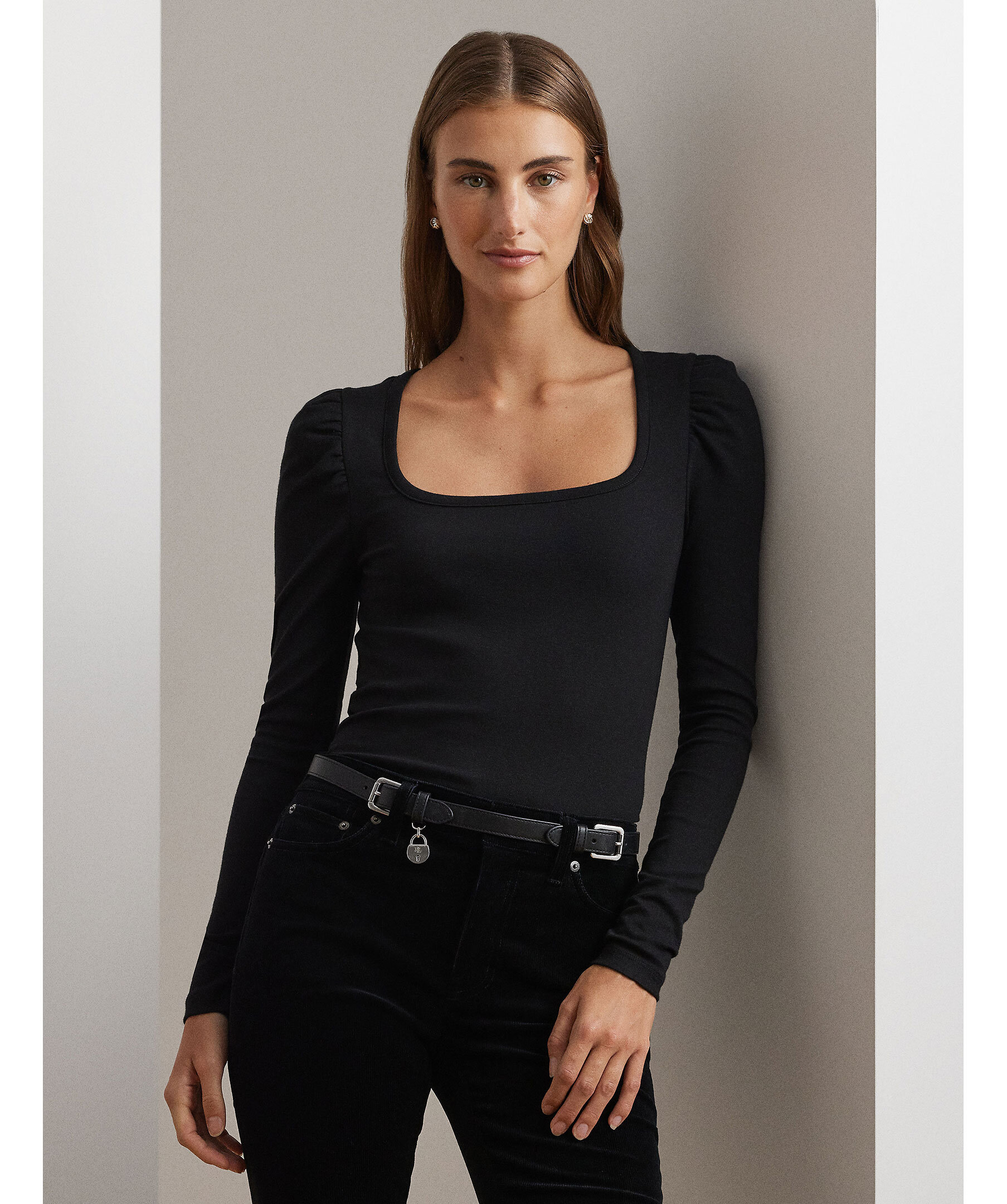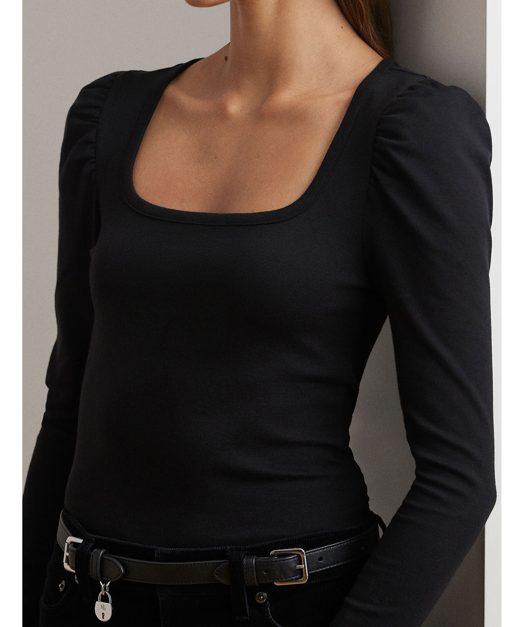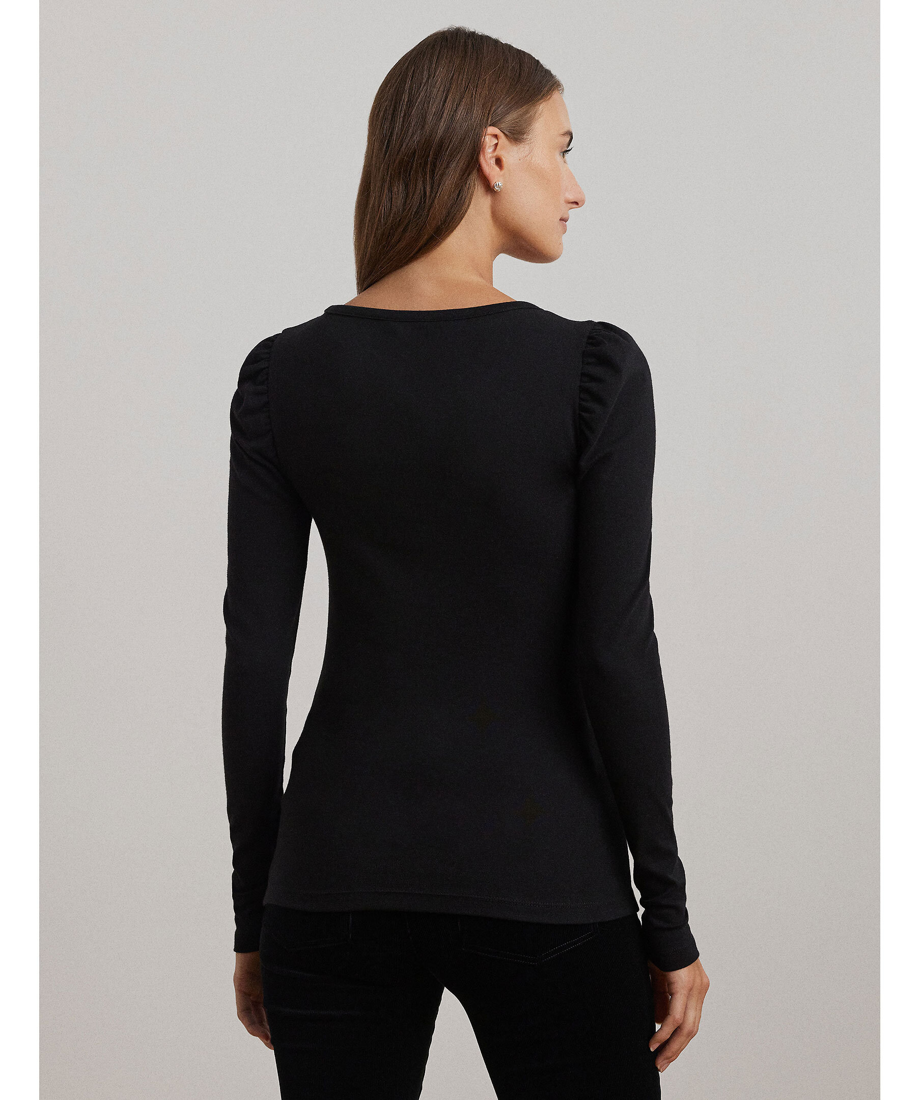 Svart tröja från Ralph Lauren. Tröjan har en bredare urringning och långa ärmar. Små puffärmar vid axlarna. Liten broderad logotyp vid tröjslut. Tillverkad av en bomullsblandning.
