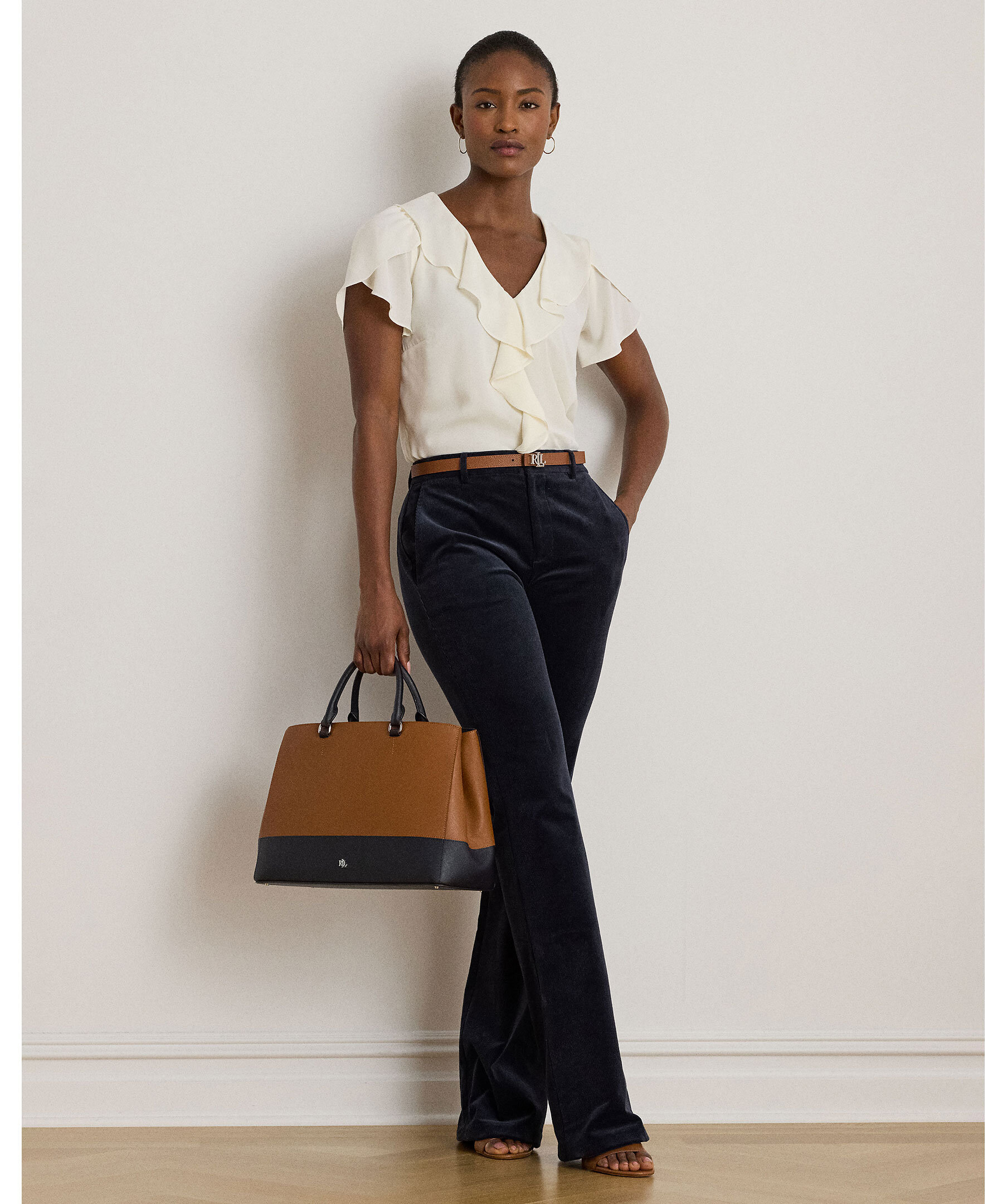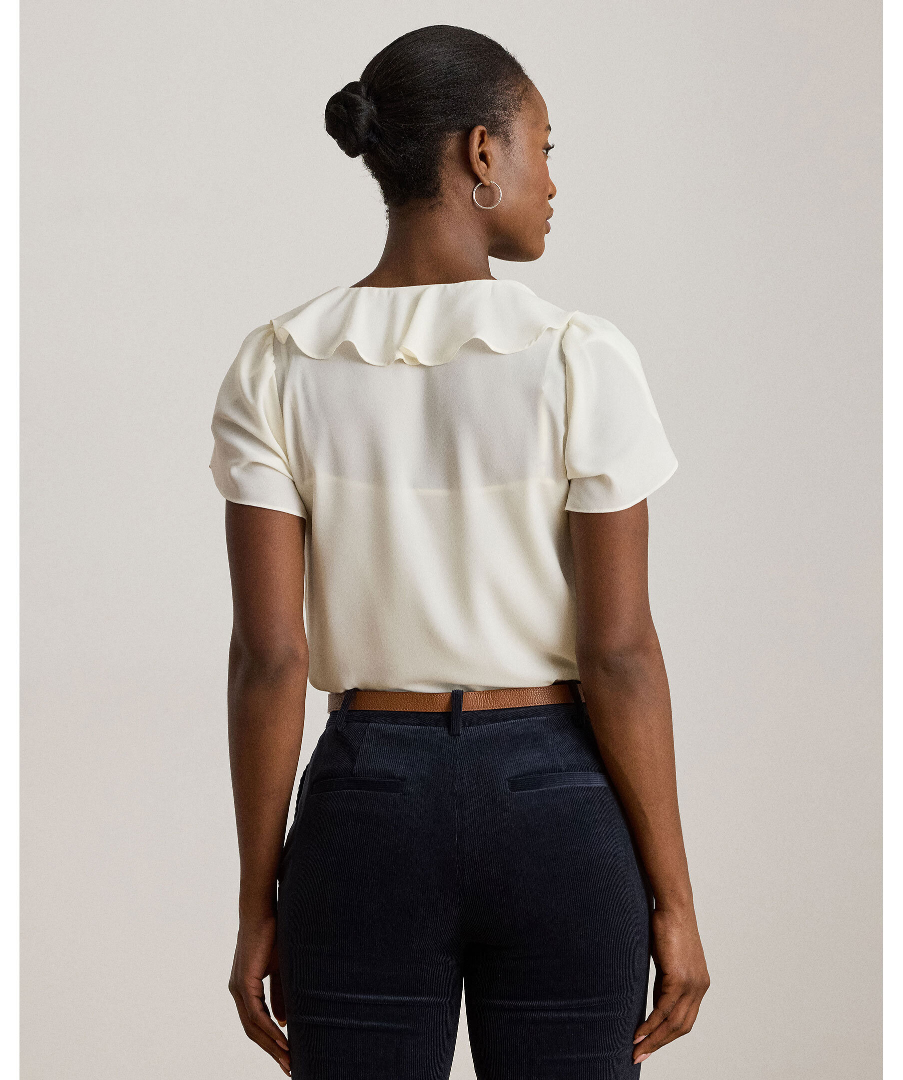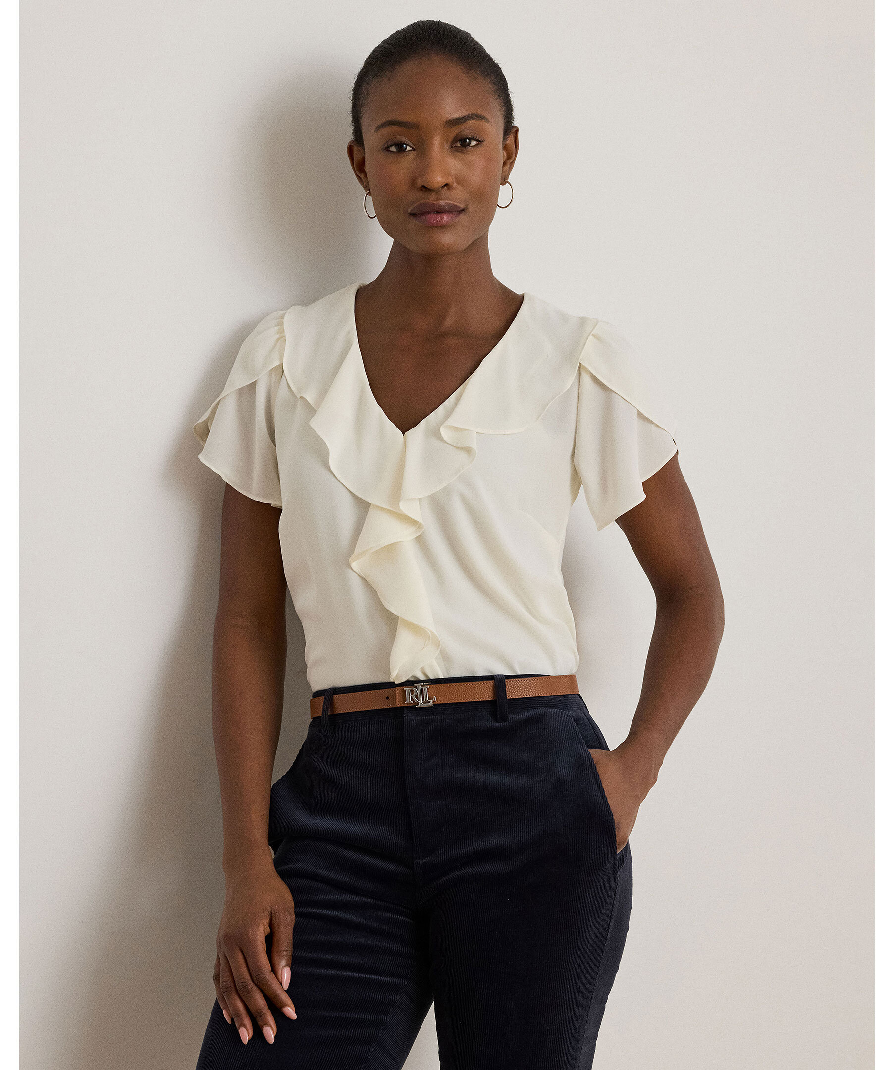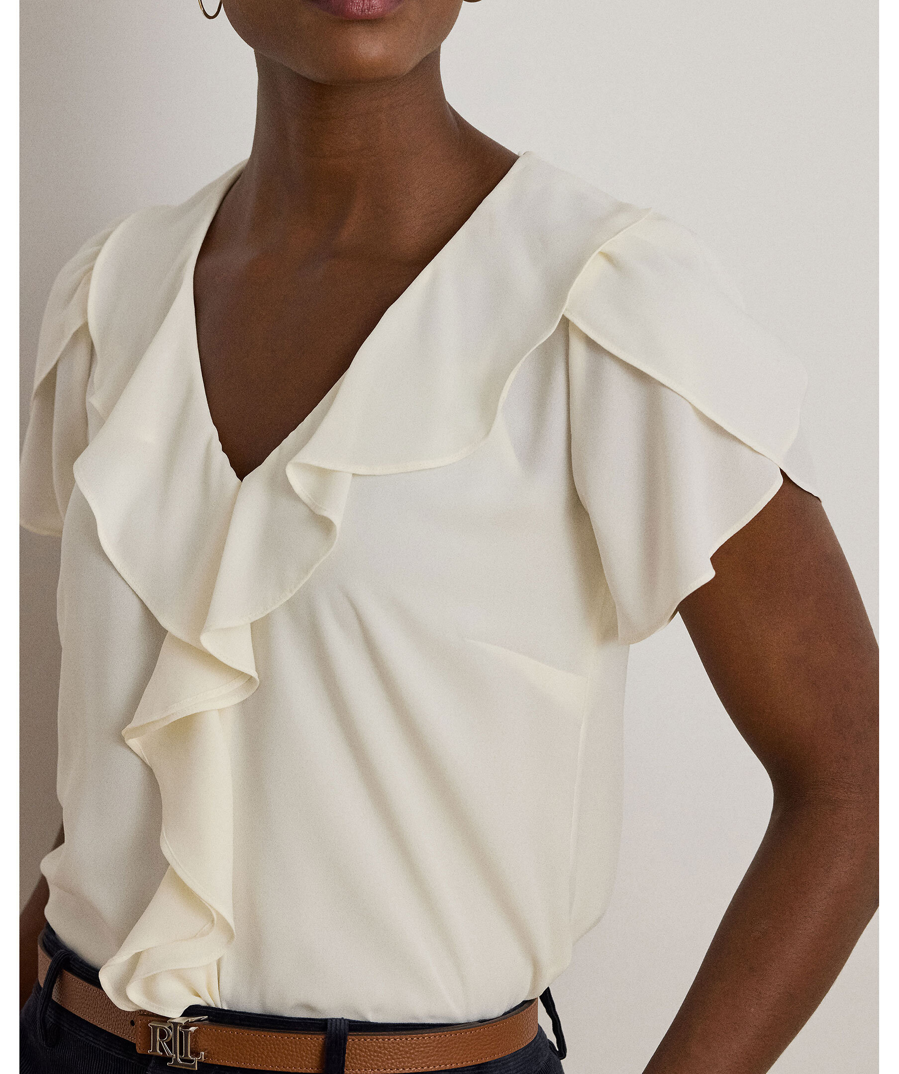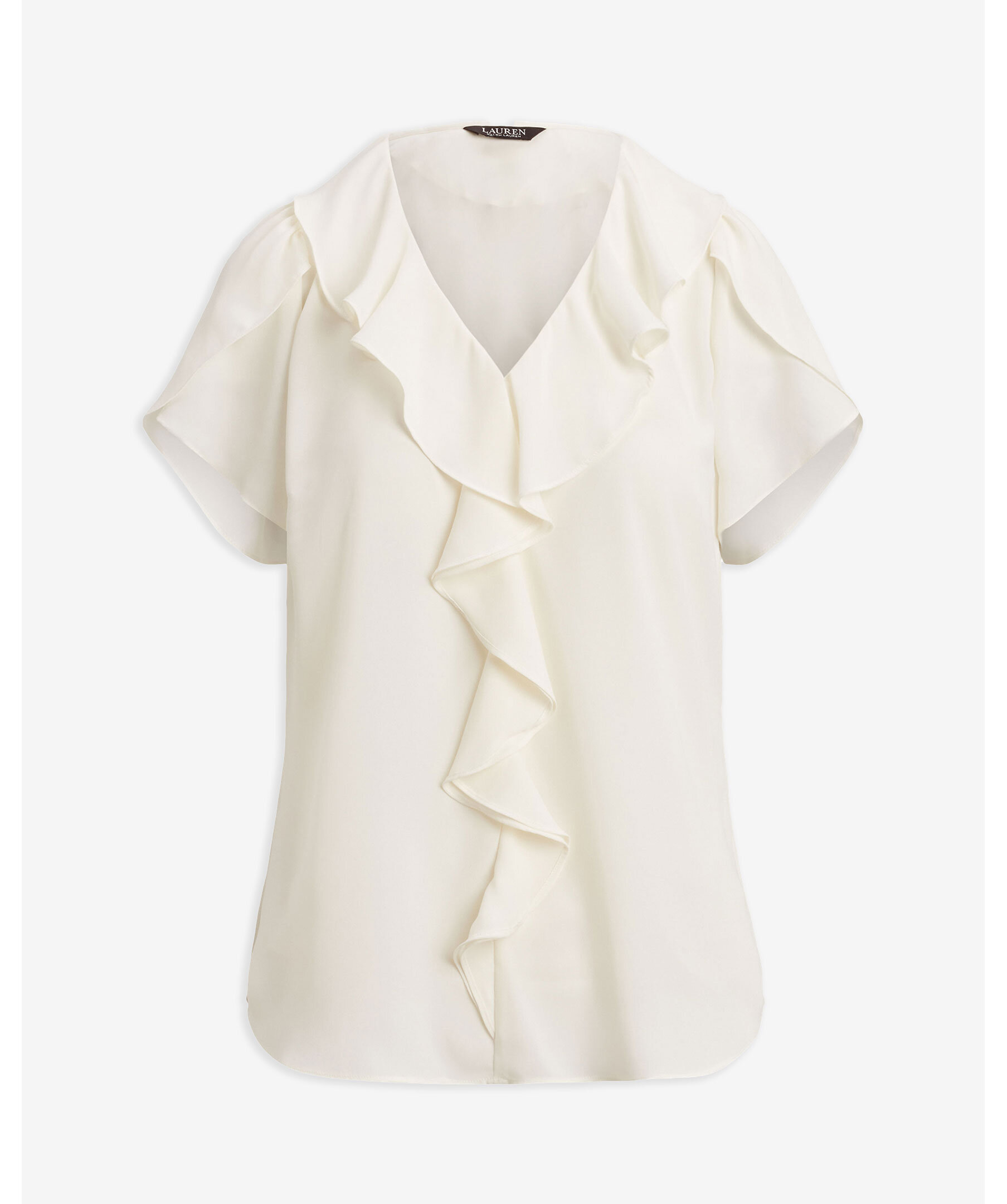 Krämvit, romantisk blus från Lauren Ralph Lauren. Gjord i luftig georgette med volangkantad V-ringning och korta tulpanärmar. Volangdetaljer framtill och en avslappnad passform ger ett mjukt, feminint uttryck.