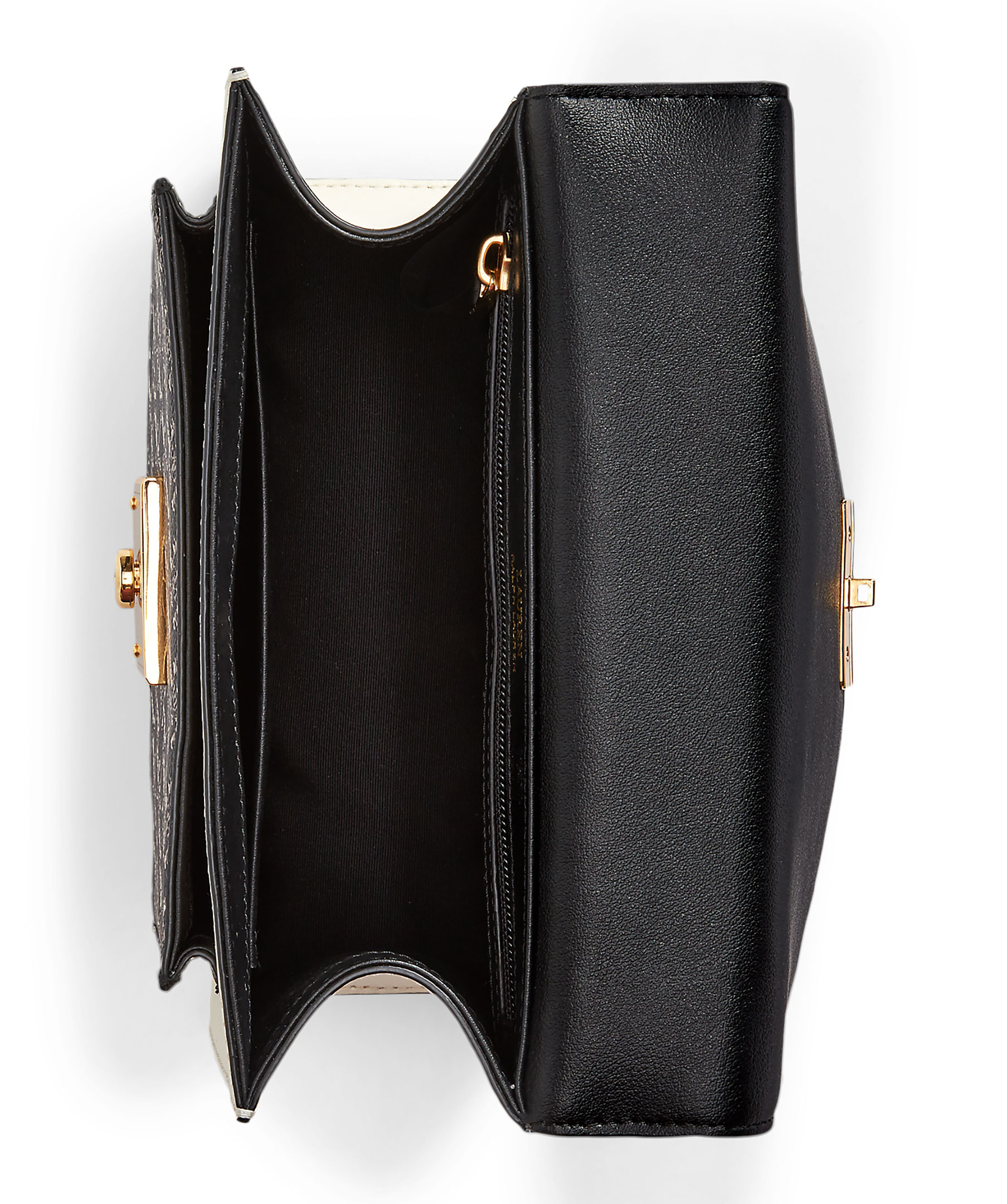 Svart/beige handväska från Lauren Ralph Lauren. Tillverkad i läder med foder i polyester. "LRL" mönstrad del framtill, läder-tag och guldfärgade detaljer.
