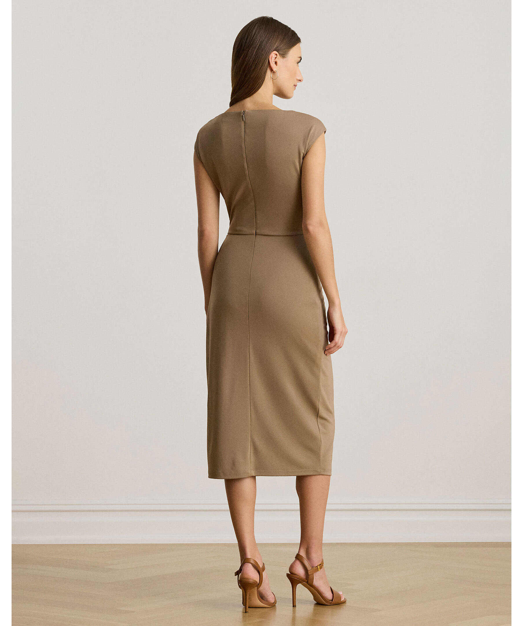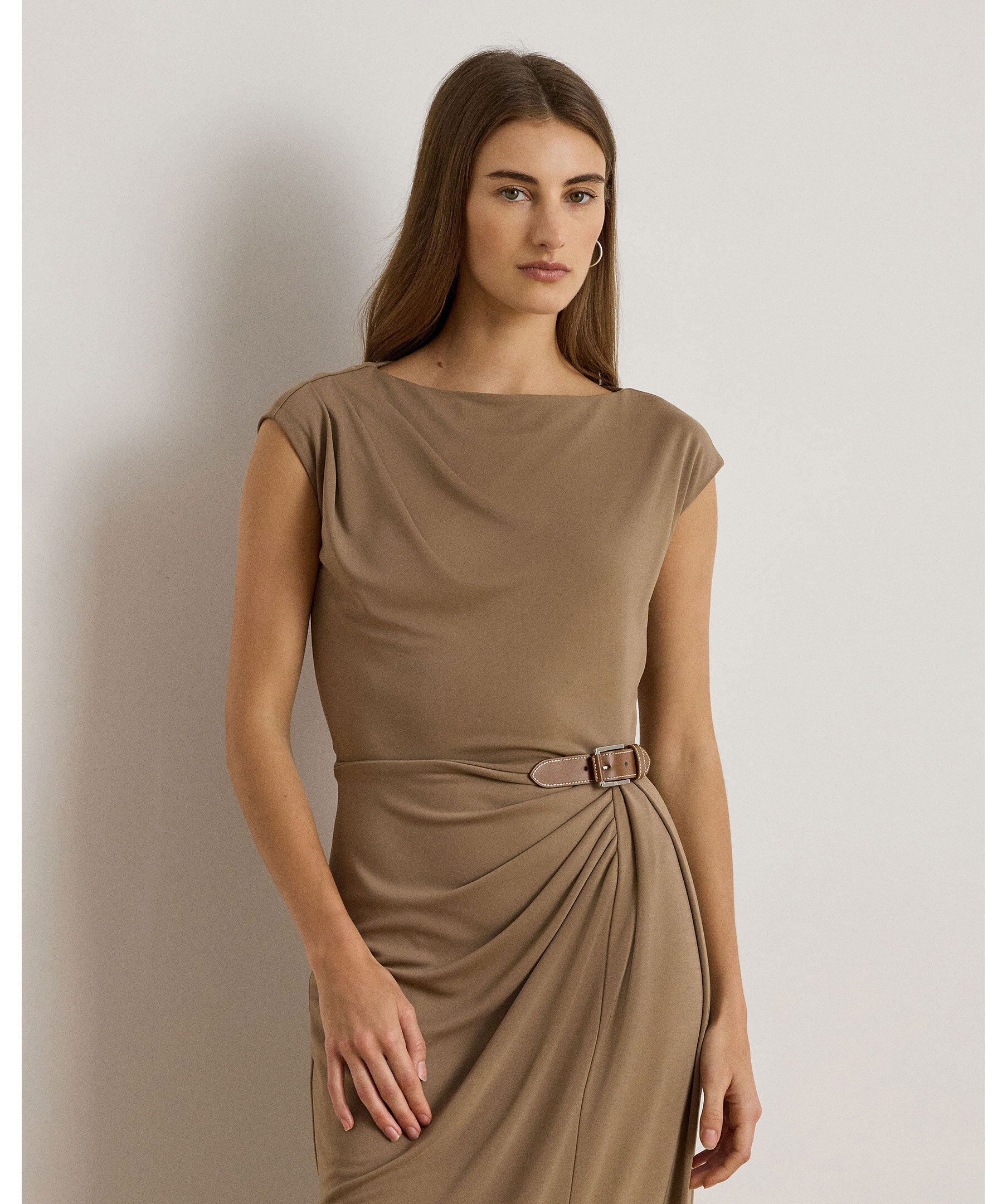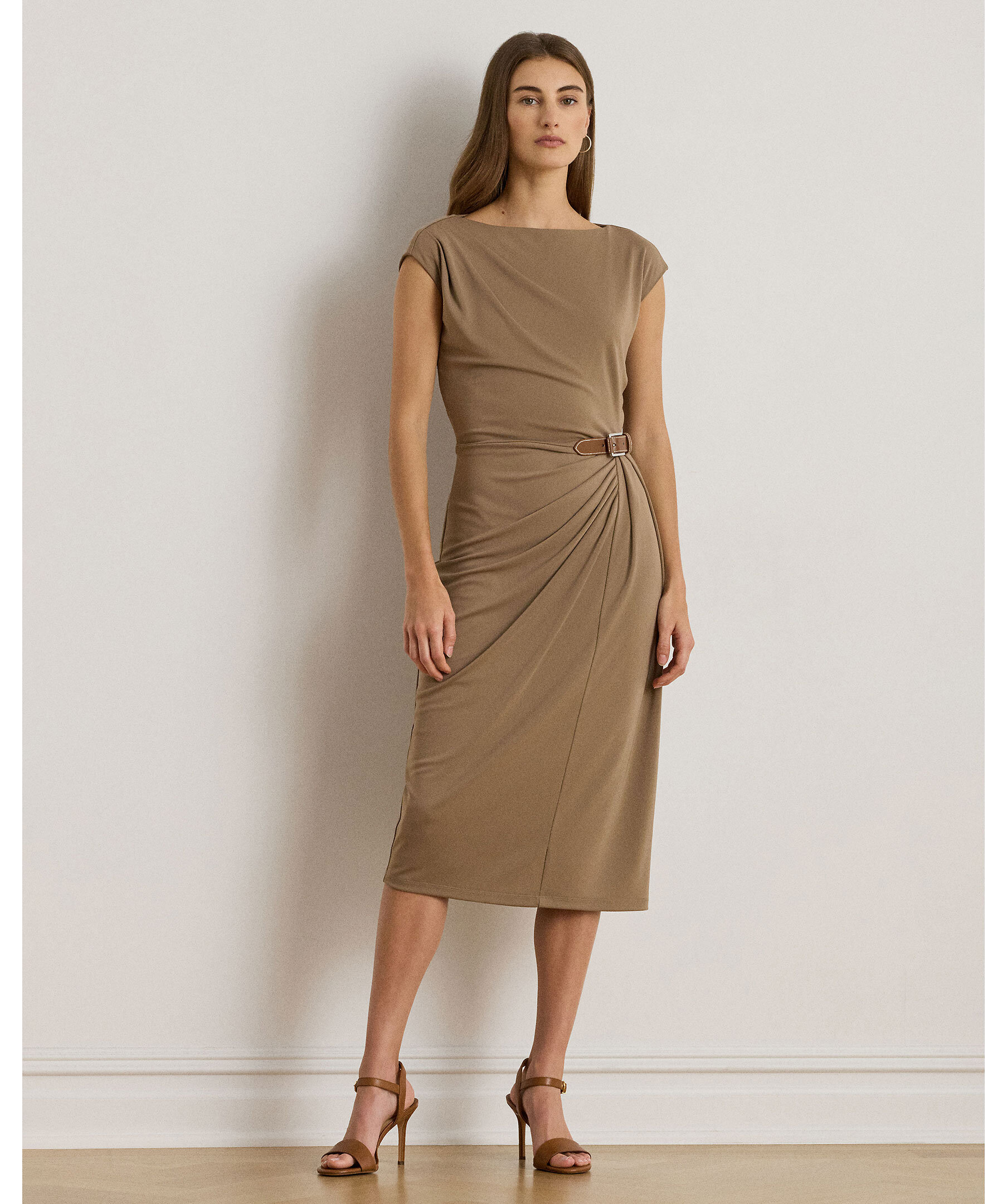 En elegant klänning i mjukt jerseytyg med båtringning från Lauren Ralph Lauren. Dekorativa spänndetaljer vid sidorna. Den feminina silhuetten markeras med diskreta veck och en följsam passform som framhäver figuren utan att kompromissa med komfort. I nyansen Taupe Brown utstrålar den tidlös sofistikation — perfekt för både jobb och tillställningar där du vill se stilren ut med en touch av elegans.