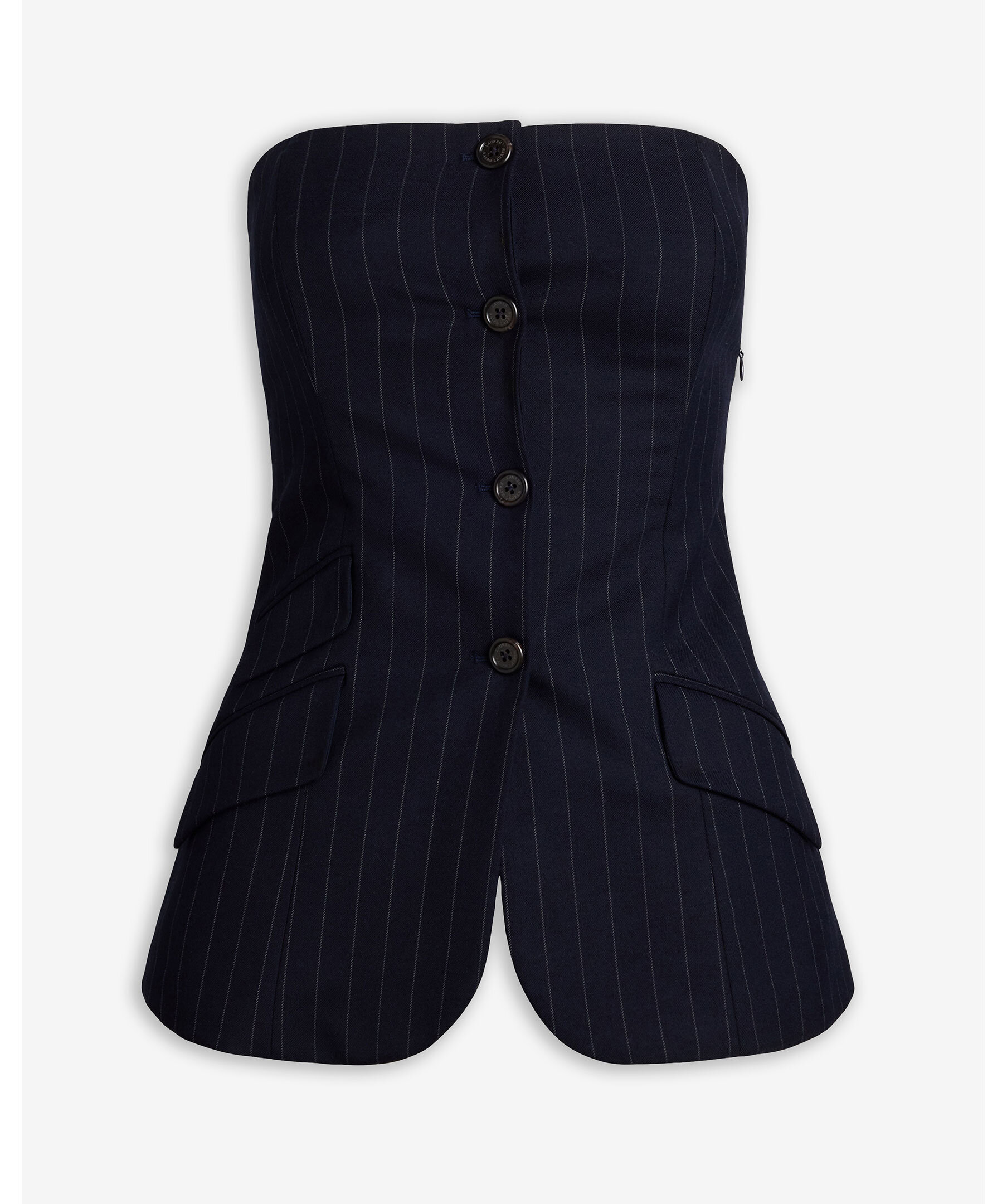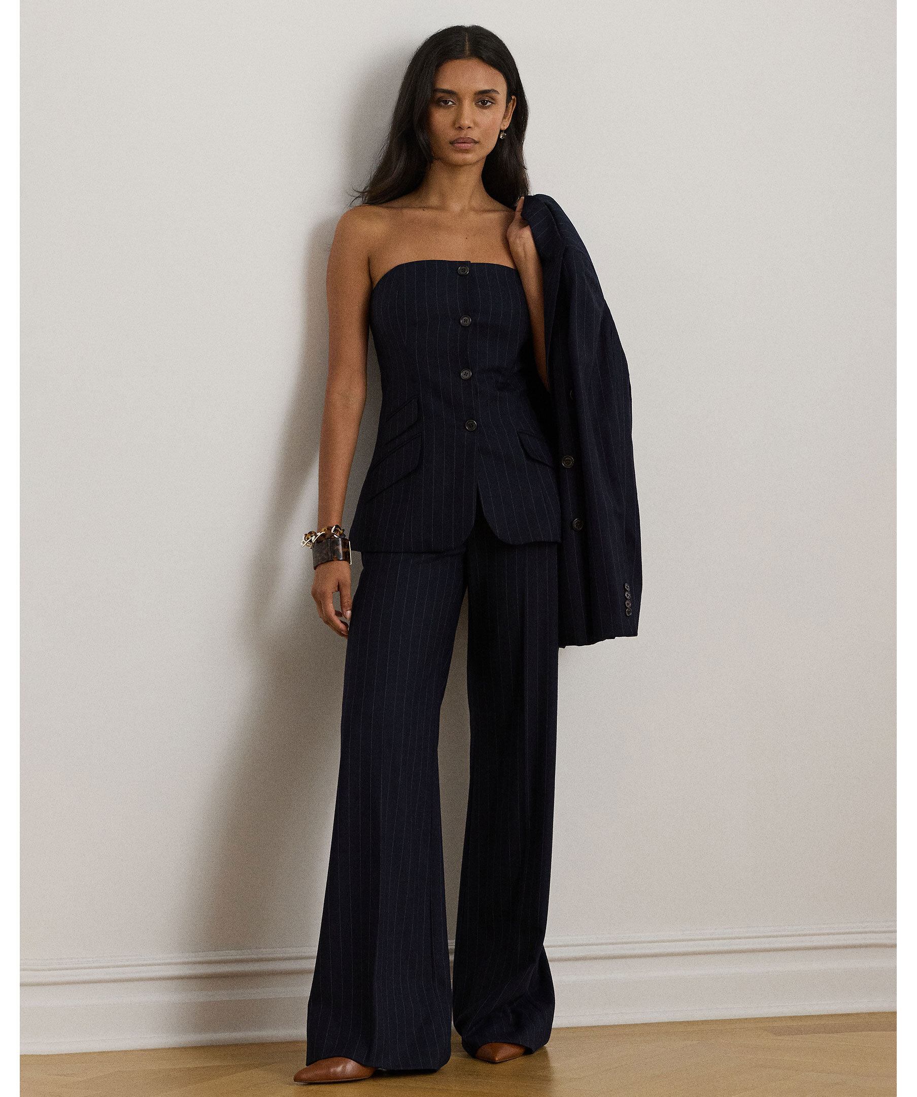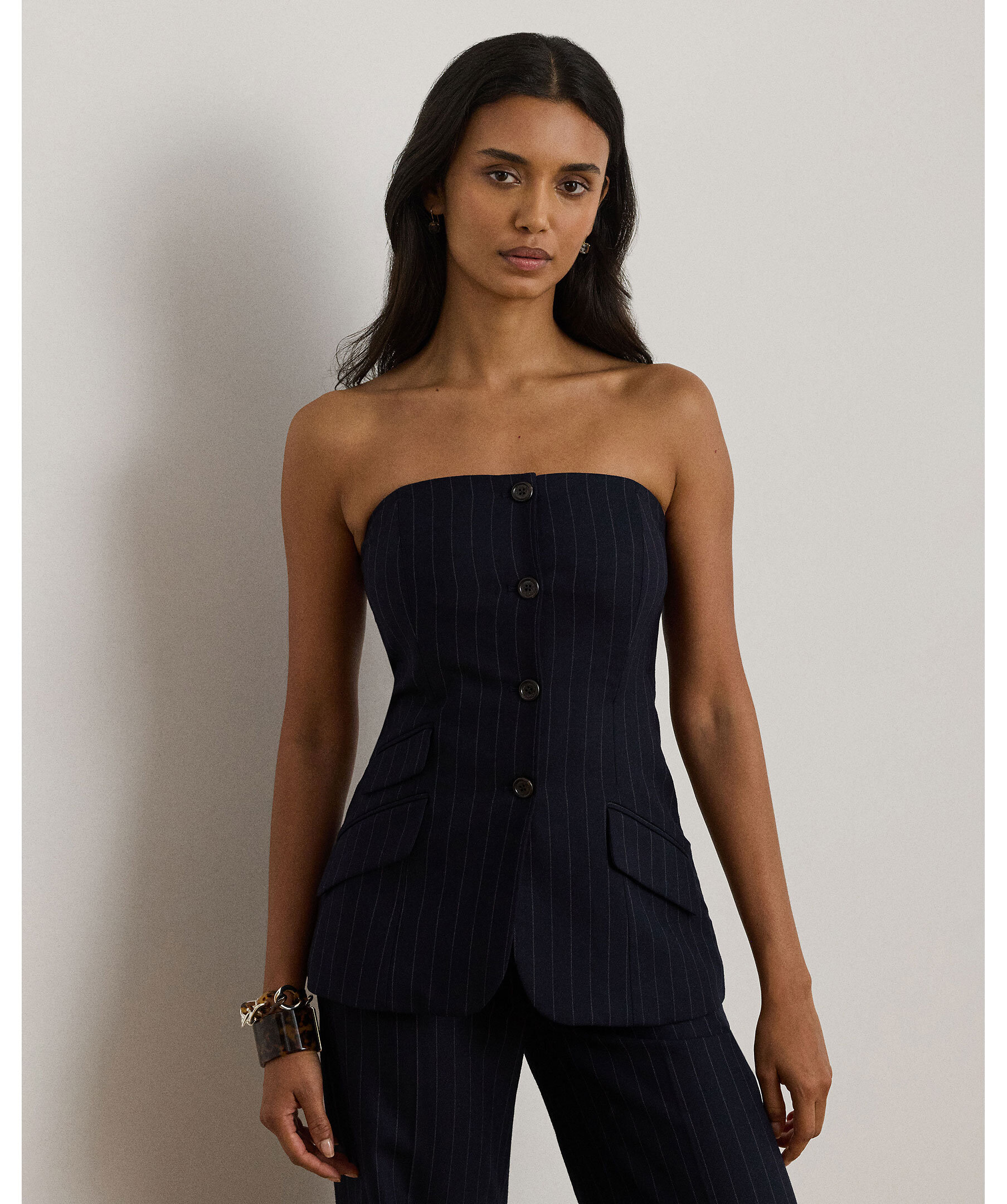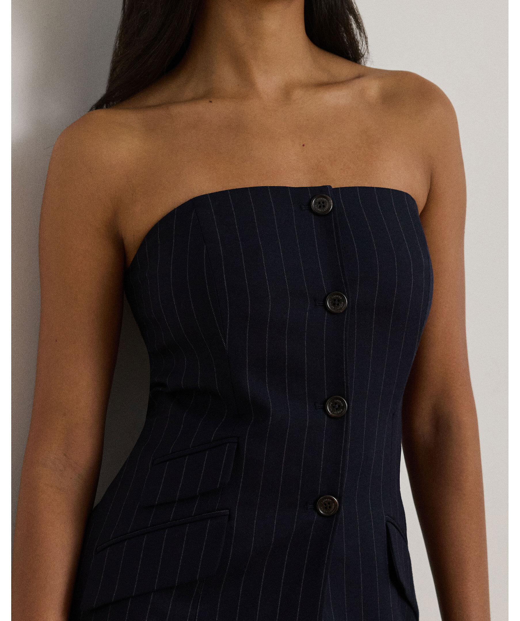 En elegant marinblå bustierkavaj från Lauren Ralph Lauren. Gjord i ullblandad twill med smala kritstreck och skräddad slim fit. Den strapplösa designen har raka halsringningen, dekorativ knappslå, fickdetaljer och signaturknappar i hornlook. Hel fodrad med panel- och sömdetaljer som framhäver en feminin siluett.