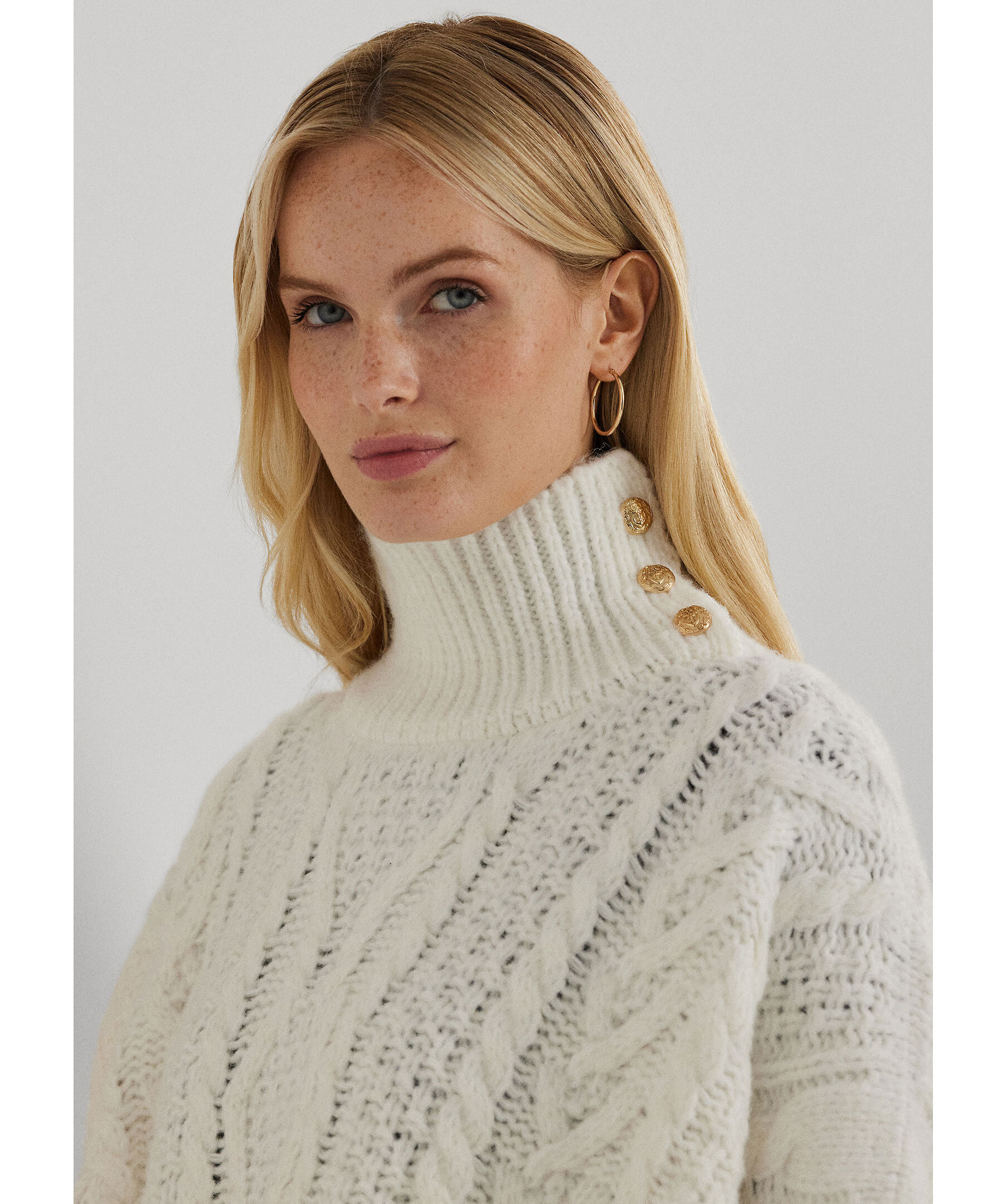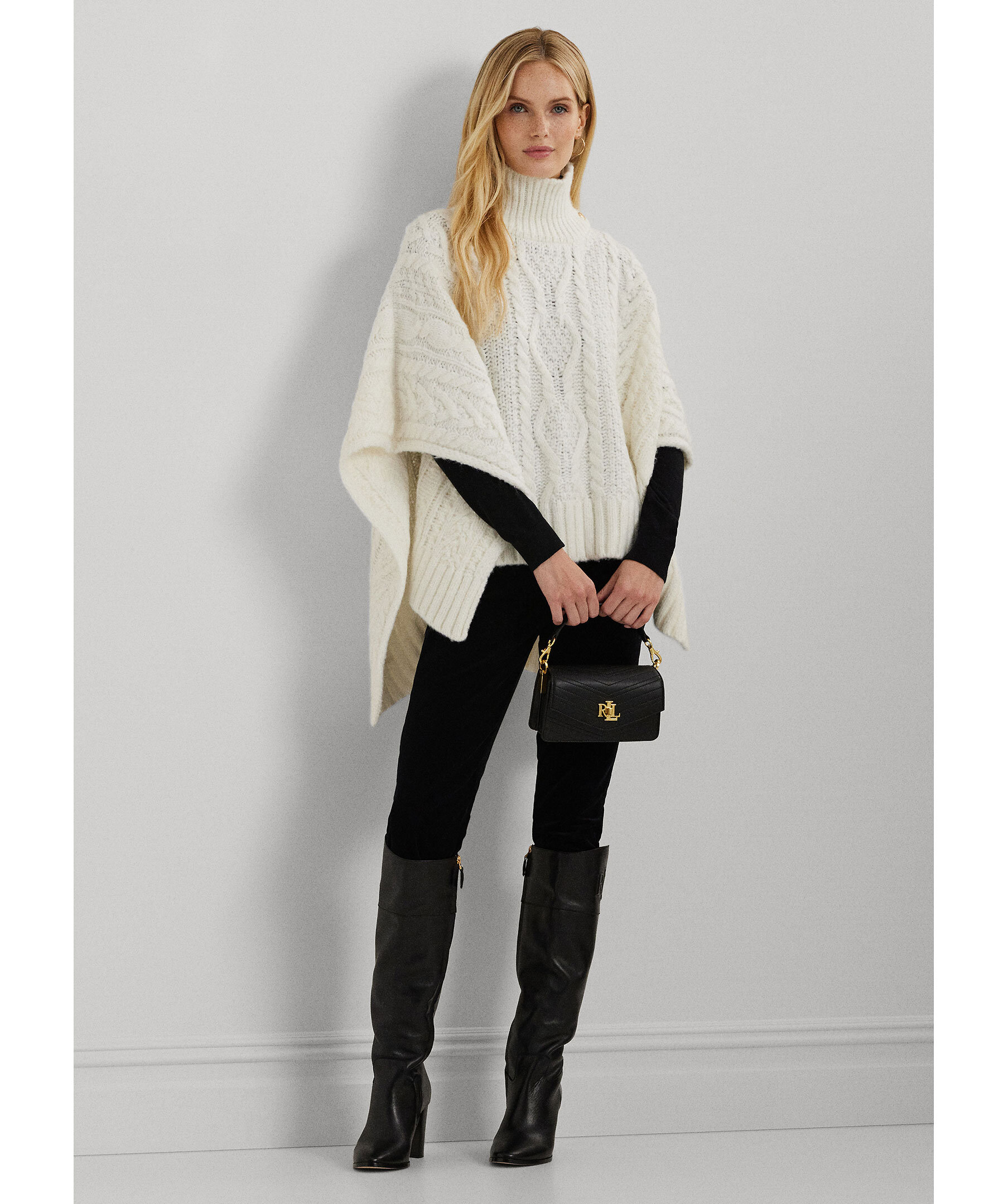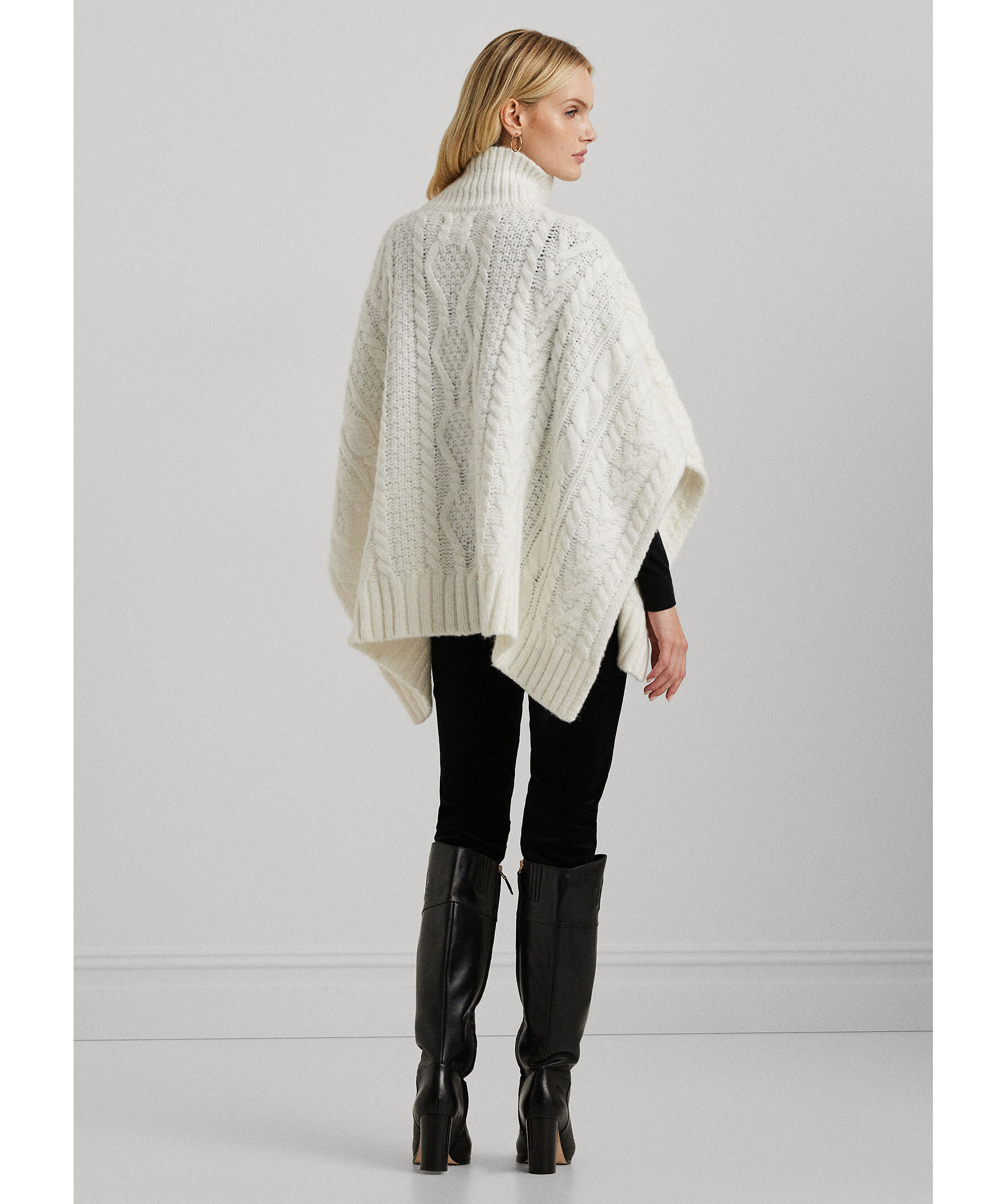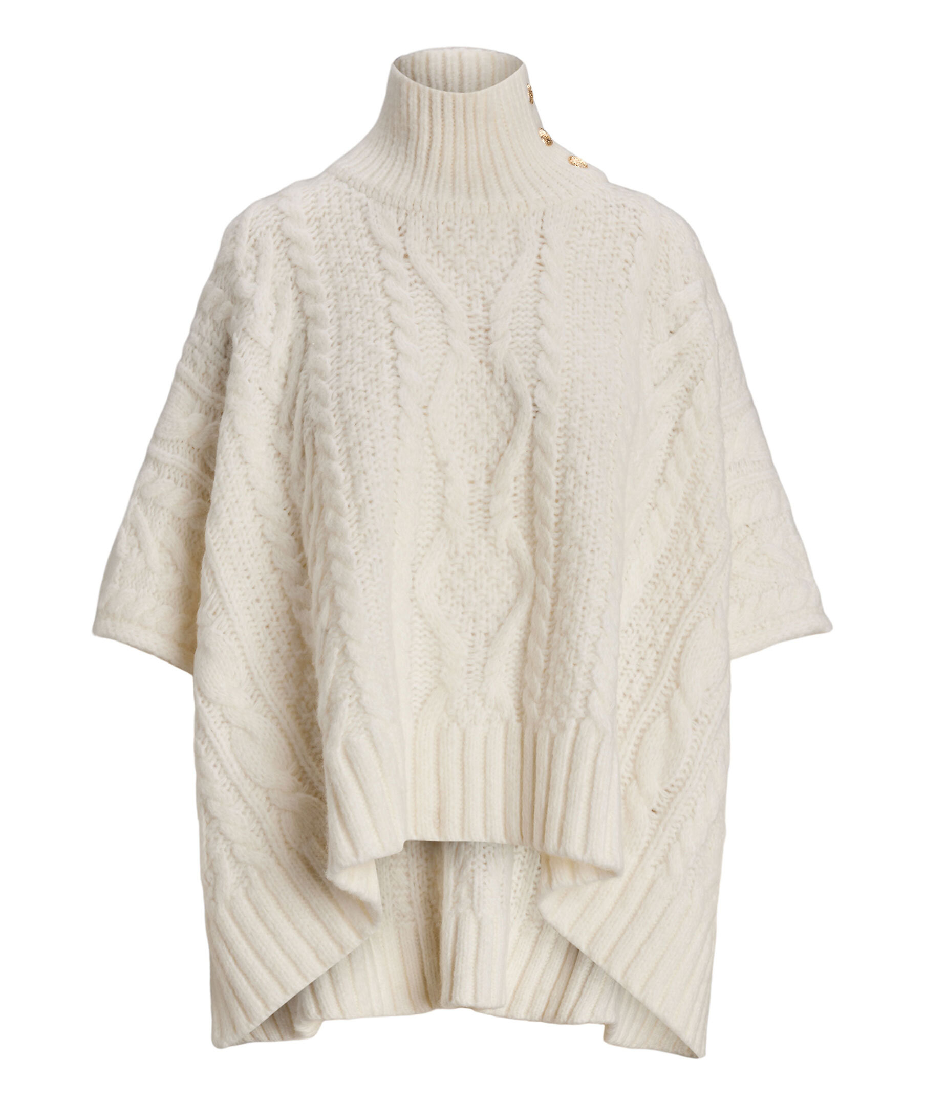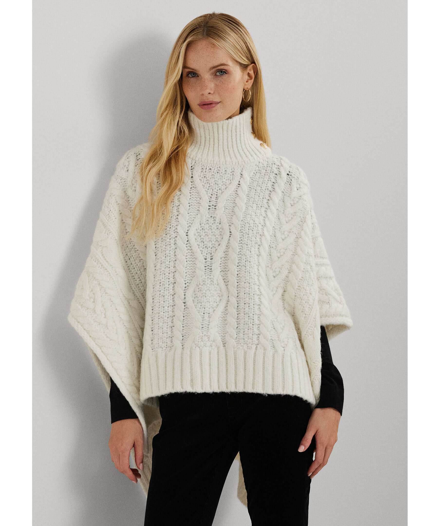 Vit, kabelstickad poncho från Lauren Ralph Lauren. Ponchon har en hög, ribbstickad krage, ribbstickade detaljer i nederkant samt guldfärgade knappar vid kragen. Tillverkad i en polyester och ullblandning.